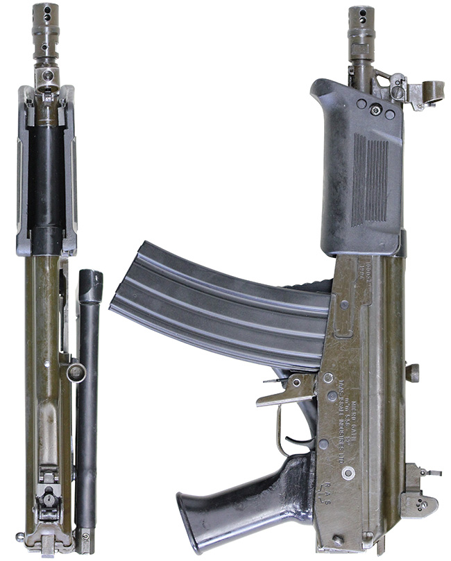 銃身長の他、ガス・ピストンやハンドガード等も短縮されています。 マイクロ・ガリルには生産時期によって各部の仕様が異なるバリエーションが存在し、サイド・フォールディング・ストックは樹脂コーティングされたアルミ製の他、全樹脂製のタイプが存在します。 また、レシーバー右側面のコッキング・ハンドルの代わりに、ボルト・キャリアの左側面にコッキング・ハンドルが溶接固定されたモデルも製造されています。 このようなモデルでは、コッキング・ハンドルが通過するレシーバー・カバーの隙間に、バネにより開閉するカバーが取り付けられています。 レシーバー左側面にはスタンダードなガリルと同様にスコープ・マウントが装備されている他、後期生産品ではピカティニー・レールが装備されたタイプも生産されました。