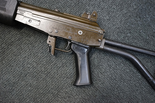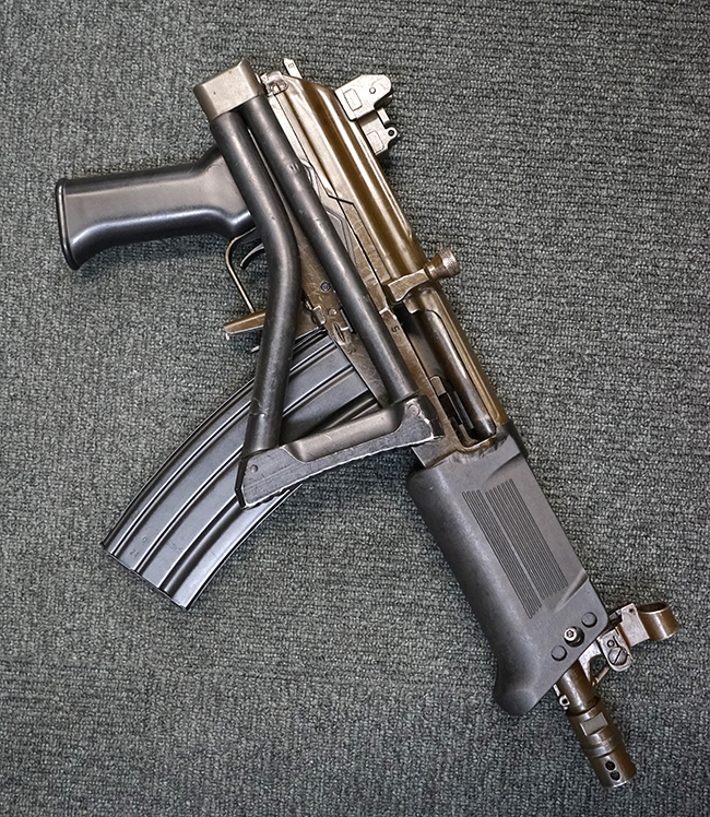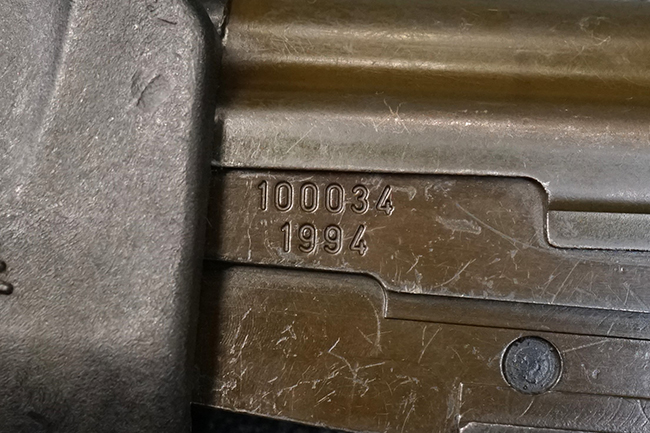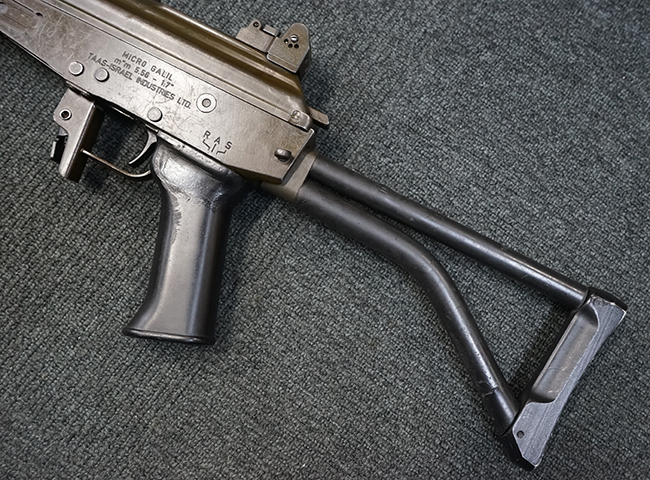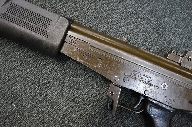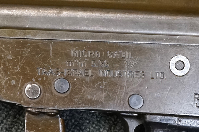 本品は極初期に製造された試作品のマイクロ・ガリル MARと考えられ、排莢孔付近のハンドガードの一部が削られている他、グリップ左側面上部の右手親指で操作可能なセレクターが取り外されて取り付け穴が埋められているなどの改修が見られます。 (セレクターの「S-A-R」表示刻印は残されています)。 レシーバー左側面前部にシリアルNo.に加えて製造年を示すと思われる「1994」の刻印が入っている事からも、本品がマイクロ・ガリル MARの発表とほぼ同時期に製造された事が窺えます。 レシーバー左側面にはその他、「MICRO GALIL m"m 5.56 - 1:7"」のモデル名刻印及び「TAAS-ISRAEL INDUSTRIES LTD.」のメーカー刻印が入っています。 (「TAAS」とはヘブライ語でMilitary Industryを意味する「Ta'asiya Tzvait」の省略形で、IMIを示しています)。 本品の折り畳みストックは通常のマイクロ・ガリル MARと比較して一際短い仕様となっています。 尚、コッキング・ハンドルは通常のガリルと同様にボルト・キャリア右側に取り付けられています。 シリアルNo.はレシーバーとレシーバー・カバー (リア・サイト・ベース) でマッチしており、ボルト・キャリアにもレシーバーとマッチしたシリアルNo.が手彫りにより入っています。