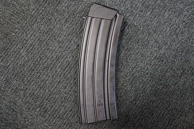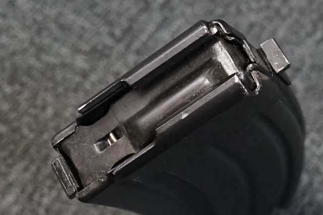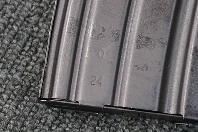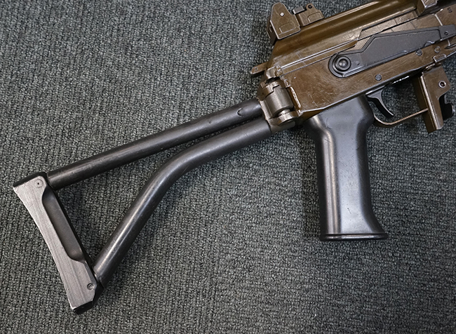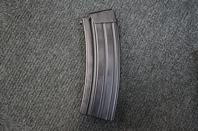 本品のレシーバーや銃身といった金属部はODがかった色合いの焼付塗装仕上げとなっており、ガス・チューブやセレクター・レバー、トリガーといった細かい部品は黒色の仕上げとなっています。 本品は全体にやや使用感が見受けられ、金属部は全体に小傷や擦れの他、フロント・サイト・ガードやレシーバー・カバー等の一部にやや仕上げが薄くなり金属の地肌が表れている箇所が見受けられますが、目立った欠損や錆等は見受けられず、概ねしっかりとした状態が保たれています。 樹脂製のハンドガードやグリップについても、元々改修されている部分を除けば、目立った破損等も見受けられません。 折り畳みストックのチューブ部分に取り付けられたゴム製カバーは一部に打ち傷や若干の剥がれが見られるものの、概ね良好な状態が保たれています。 ストックの展開操作はスムーズに行う事が可能で、展開時のがたつきも殆ど見られません。 マガジンの着脱やリア・サイト及び夜間サイトの切り替え、セレクターの切り替えについても問題なく、セレクターを最上部のポジションに入れた際にトリガーがロックされます。 付属のマガジンは僅かな小傷を除いて目立った凹みや変形等も見られず、良好なコンディションが保たれています。 尚、マガジン・スプリングは入っています。