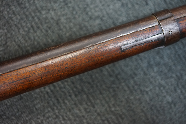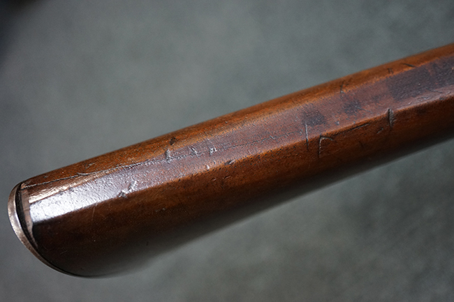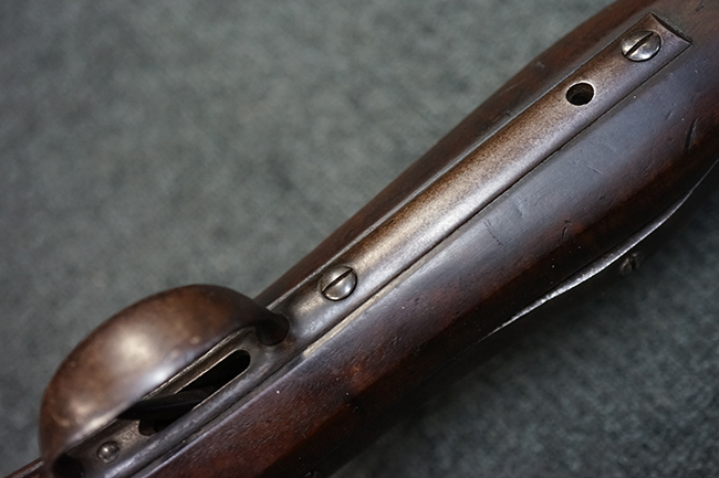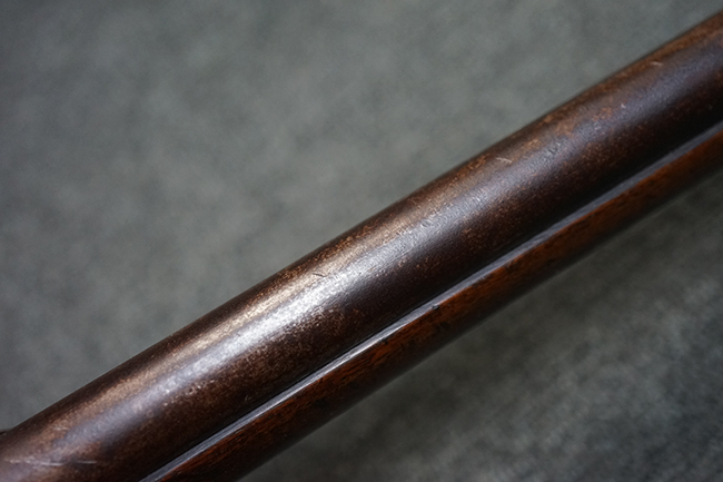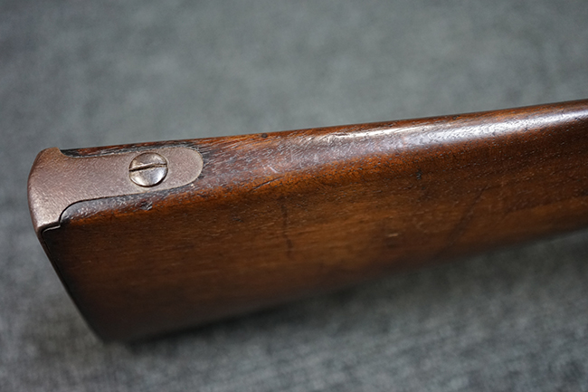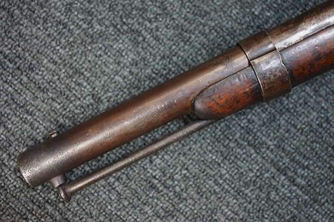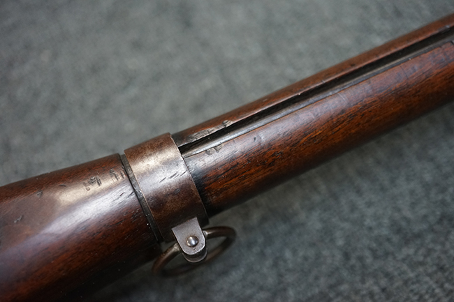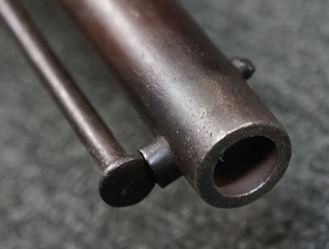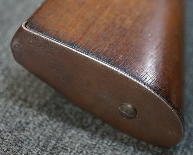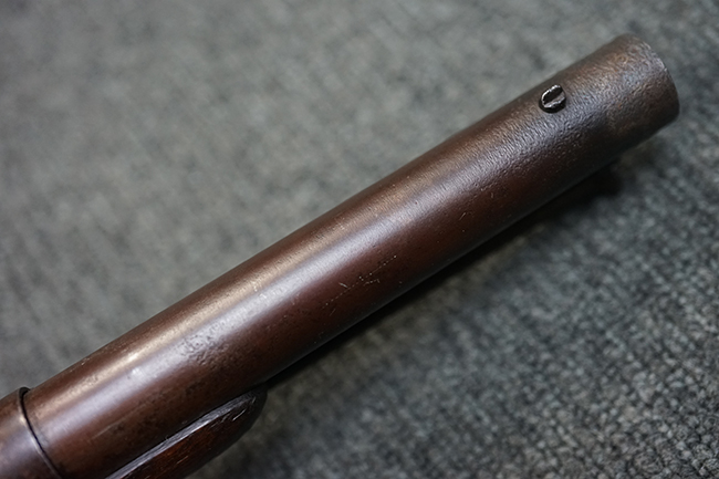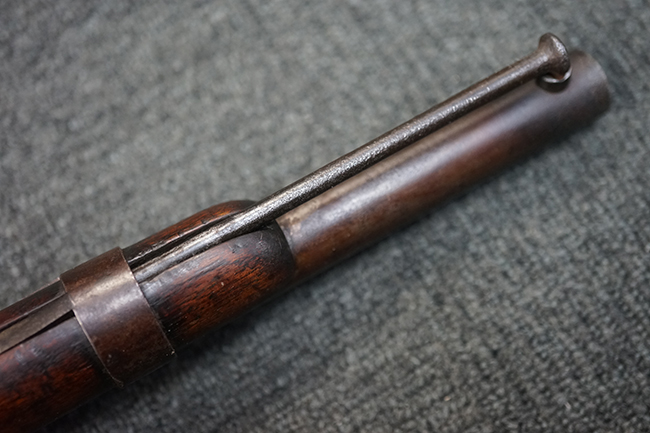 本品は全体に適度な時代感の付いた良い雰囲気となっています。 銃身や機関部といった金属部については、大部分にブラウン・パティーナと呼ばれる時代錆が付いています。 金属部は若干の打ち傷の他、銃口部や機関部の一部に若干の表面錆痕は見受けられるものの、目立った朽ち込み等は見受けられず、概ねしっかりとした状態が保たれています。 木製銃床については、やや打ち傷や線傷の他、銃床下面に長さ11cm程のひびが見受けられ、バット・プレート下部付近の木部に若干の欠けが見られるものの、全体としては比較的しっかりとした強度が保たれており、艶のある木部表面の仕上げも比較的残っています。 傷み易いバット・プレートぶについてはやや表面錆痕が見受けられるものの、大きな変形等は見られず、銃床への取り付けについてもガタつきもなくしっかりとしています。 フロント・バンドにやや打ち傷が見られますが、前後バンドともに取り付けには現状ガタつきは見られません。 "Button-head" タイプと呼ばれるオリジナルのさく杖が付属致します。