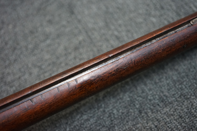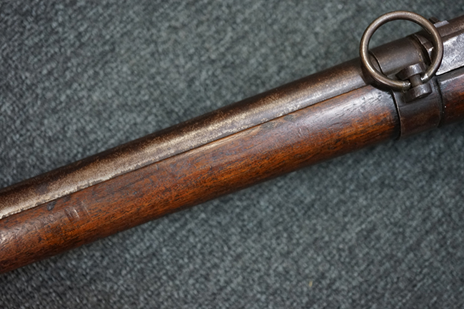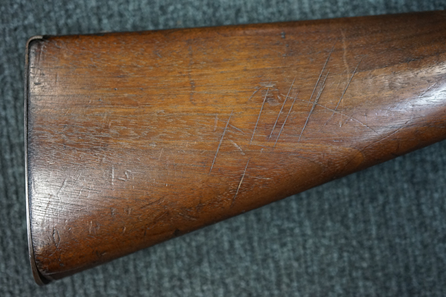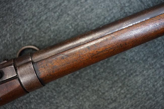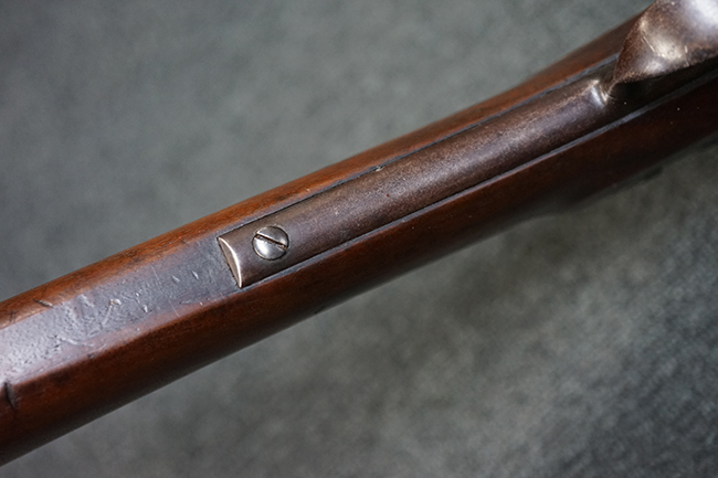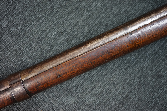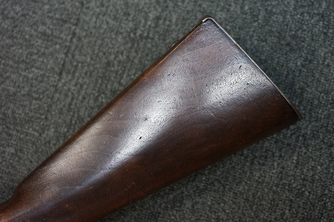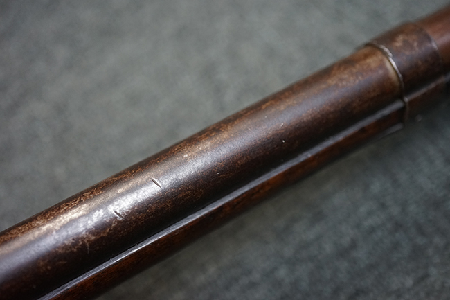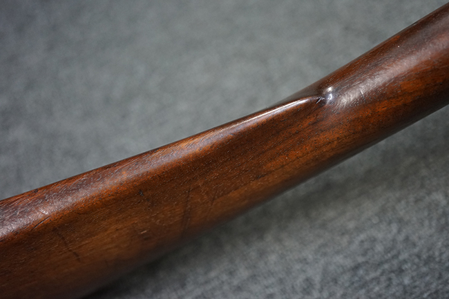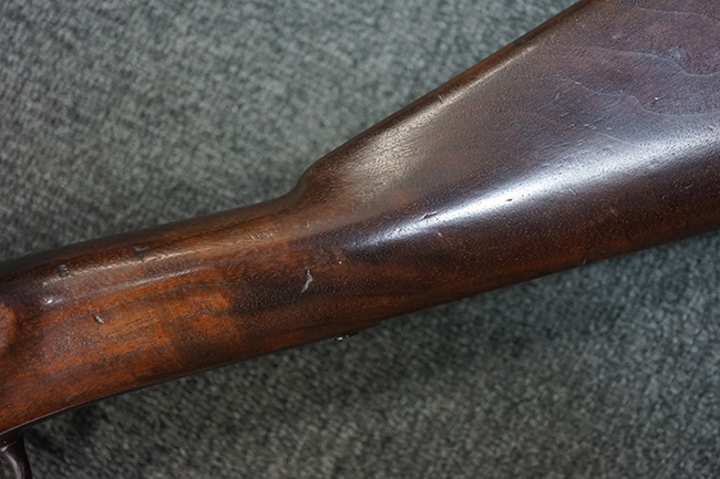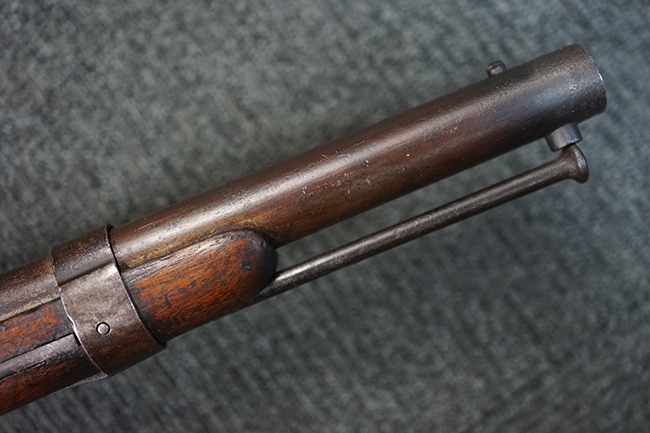 本品は全体に適度な時代感の付いた良い雰囲気となっています。 銃身や機関部といった金属部については、大部分にブラウン・パティーナと呼ばれる時代錆が付いています。 金属部は若干の打ち傷の他、銃口部や機関部の一部に若干の表面錆痕は見受けられるものの、目立った朽ち込み等は見受けられず、概ねしっかりとした状態が保たれています。 木製銃床については、やや打ち傷や線傷の他、銃床下面に長さ11cm程のひびが見受けられ、バット・プレート下部付近の木部に若干の欠けが見られるものの、全体としては比較的しっかりとした強度が保たれており、艶のある木部表面の仕上げも比較的残っています。 傷み易いバット・プレートぶについてはやや表面錆痕が見受けられるものの、大きな変形等は見られず、銃床への取り付けについてもガタつきもなくしっかりとしています。 フロント・バンドにやや打ち傷が見られますが、前後バンドともに取り付けには現状ガタつきは見られません。 "Button-head" タイプと呼ばれるオリジナルのさく杖が付属致します。
