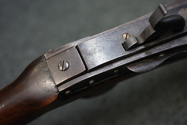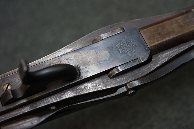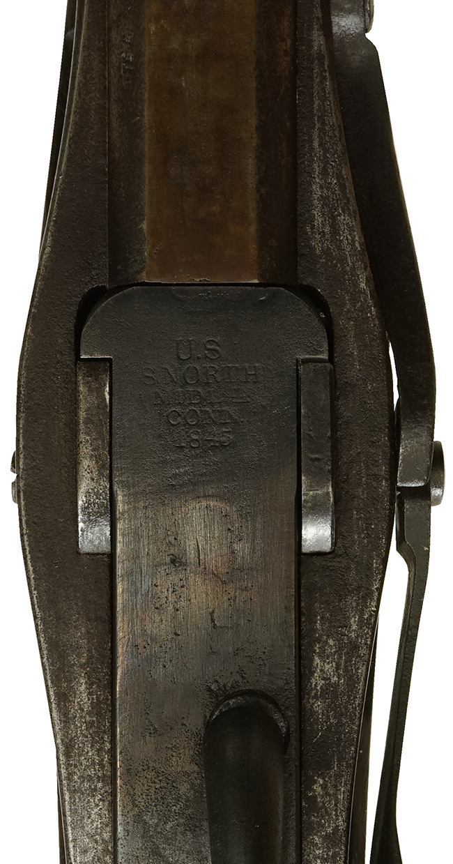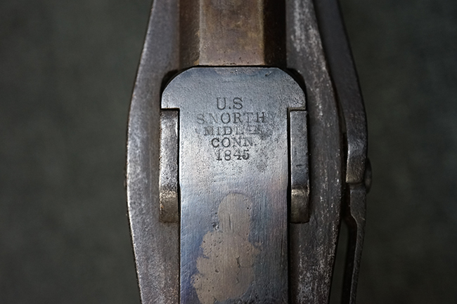 本品のレシーバーの上部には僅かに薄くなっているものの、「U.S /S. NORTH /MIDLTN /CONN. /1845」のFive-line Addressと呼ばれる刻印が確認出来ます。 また、薬室左側面には「JH」の検査刻印も入っています。