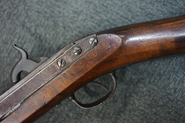 ホール小銃の後装式のシステムは日本では「遊底こう起式」と呼ばれています。 「遊底こう起式」は海外でも珍しく、日本にはホール小銃とリンドナー小銃が幕末に輸入された記録があります。 特にホール小銃は世界初の後装式軍用銃として、日本ではペリーが徳川幕府に献上したライフルとして有名です。 所荘吉氏著「増補 図解古銃事典」のP.144にも本銃と全く同じモデルが掲載されています。 尚、1852年4月に陸軍造兵廠から提供された40挺のホール小銃及び弾薬4,000発を始めとする各種武器がペリー日本来航時の4隻の黒船の1隻であるミシシッピ号に積み込まれた事が当時の記録から分かります。 また、徳川幕府にはホール小銃以外にもコルト製のパーカッション・リボルバーを始めとする管打ち式拳銃が献上された記録が有るため、ホール小銃についてもフリント・ロックのタイプではなく管打ち式のホール・ノース M1843 パーカッション カービンであった可能性が高いと考えられます。 (MM)(KK)