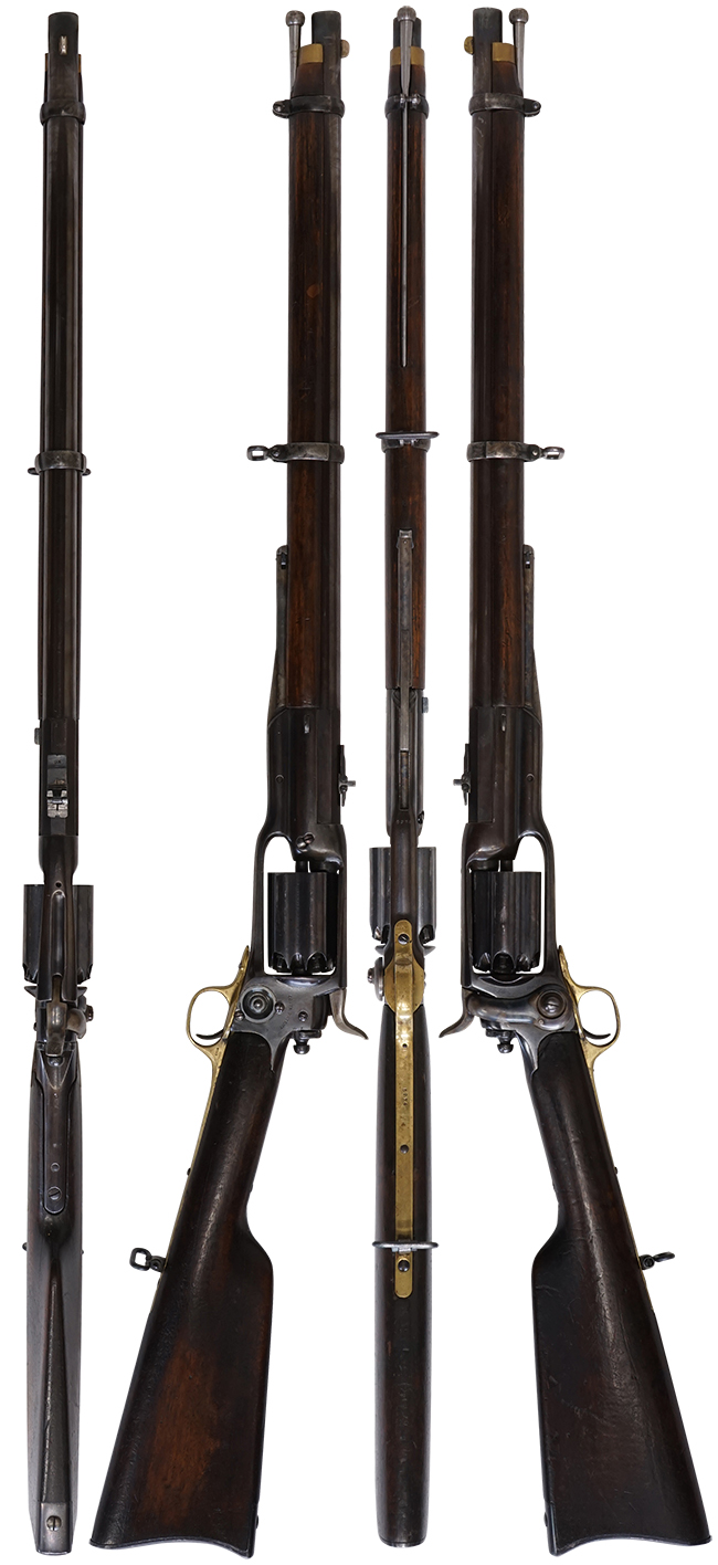コルト "ニュー・モデル" リボルビング ライフルとも呼ばれる、コルト社が1855年から1864年頃にかけて製造した初期の連発式ライフルです。 コルト ニュー・モデル リボルビング・ライフルは、機構的にはElisha K. Rootの設計によるコルト M1855 サイド・ハンマー ポケット・リボルバーを拡大したもので、.36口径、.40口径、.44口径、.50口径、.56口径といった口径の異なる様々なモデルが存在し、さらに15インチから30インチまでの銃身長の異なるライフル・モデル及びカービン・モデルが軍用若しくはスポーツ用として製造されました。