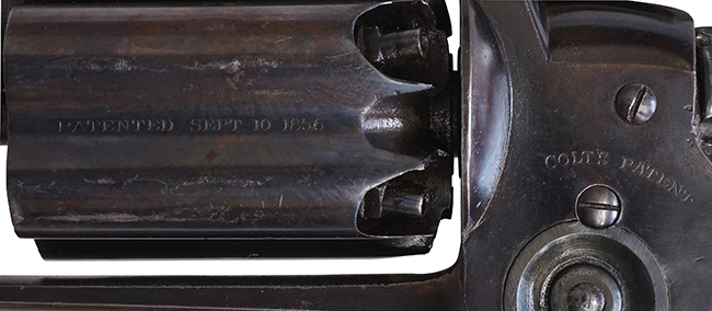 本品は1858年以降に生産が本格的に開始された.56口径モデルで、シリンダーの装弾数は5発となっています。 本品は銃身長が598mm (約24インチ) で、フォア・エンドが銃口付近まで伸びたフル・ストック・タイプのスポーティング・モデルです。 フォア・エンドは前後2箇所のバンドにより銃身に固定され、フォア・エンド内には分割式クリーニング・ロッドの前部 (鉄製) を収納加工となっています。 分割したクリーニング・ロッドの延長部 (真鍮製) はバット・ストック内のコンパートメントに収納されました。 リア・バンド下部及びロア・タング下部にはスリング・スイベルが設けられています。 また、リア・サイトは3段階で切り替え可能な起倒式となっています。 本品のフレーム左側面に「COLT'S PATENT」の刻印が入っている他、シリンダーにも「PATENTED SEPT 10 1856」のパテント刻印が入っています。 また、トリガー・ガード左側面には「56 CAL」の口径表示刻印も入っています。 シリアルNo.はフレーム下部、トリガー・ガード、バット・プレートでマッチしています。