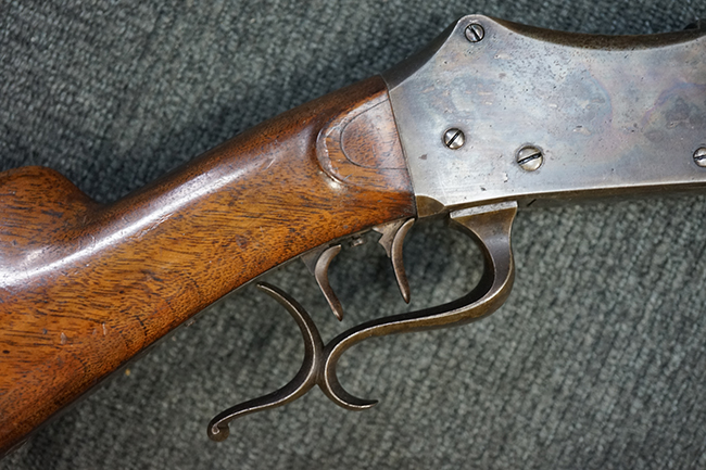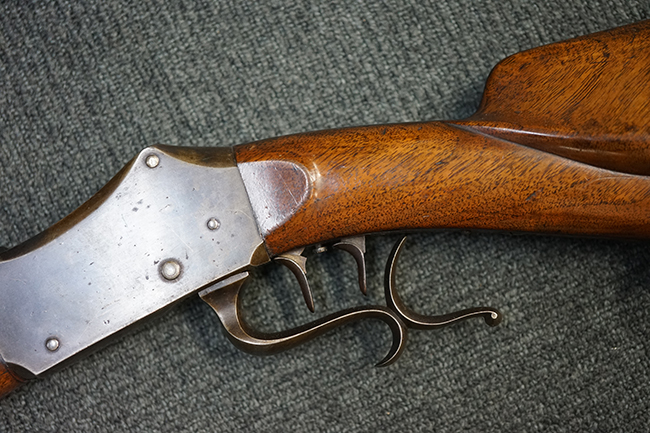 ピーボディ・マルティニ・アクションは、トリガー・ガードを兼ねたレバーを下に押し下げるとブリーチ・ブロックが後部上方を軸にして上下に薬室が開放・閉鎖され、連動してブリーチ内蔵のストライカーがコッキングされる、後装単発式機関部の完成形の1つです。 反動に強く信頼性の高いピーボディ・マルティニ・アクションは、1870年代に民間用として幅広い国で多岐に渡り利用されており、特にスイスではマルティニ・アクションの人気が高く多くの銃砲メーカーがピーボディ・マルティニ・アクションを利用した猟銃や標的射撃銃 (ターゲット ライフル) を製造し、仕上げの豪華さやクオリティを高めて争っていました。 本品はその中でも優れた仕上げを誇る逸品です。