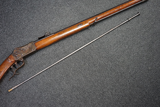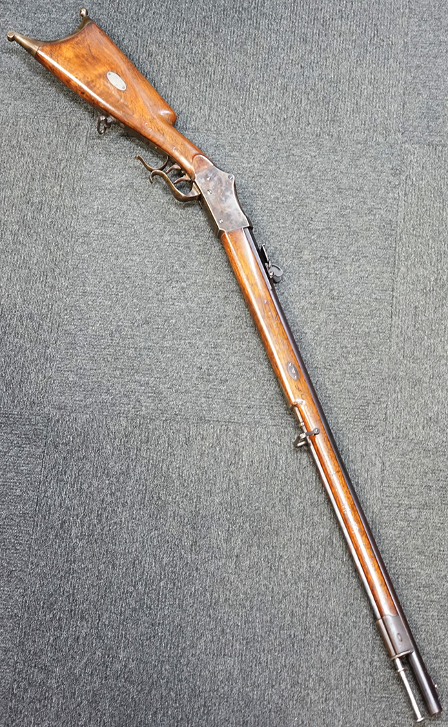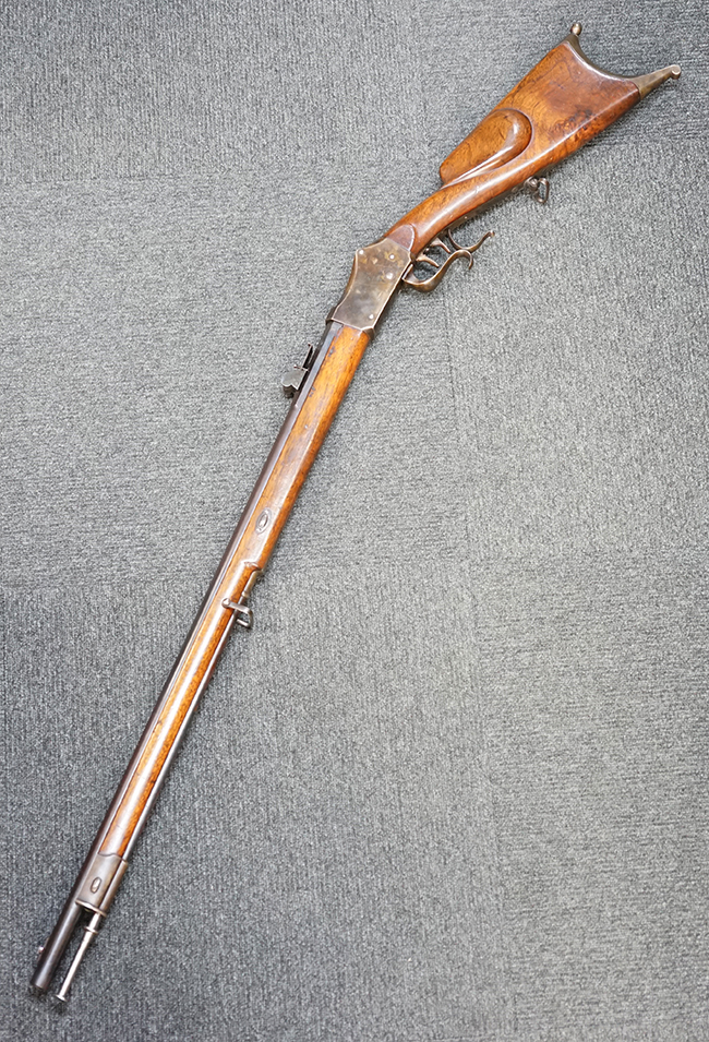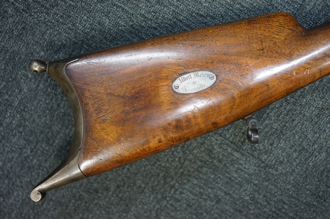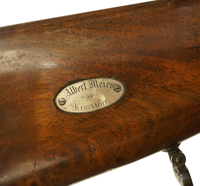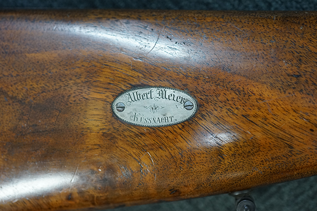 ドイツ語でSchutzenまたはFeuerstutzenと呼ばれる本ライフルは、スイスのシュヴィーツ州リギ山の麓にあるKuessnacht am Rigi (キュスナハト・アム・リギ) と呼ばれる村にあったAlbert Meier社の製品で、1880年頃に製造された品と思われます。 ヘビー・ラウンド (丸型)・バレルの後部約11cmがオクタゴン (八角形) バレルで、当時のスイス軍用銃と同じ造りになっています。 スイス軍正式小銃弾である10,4mm (10,4mm×38 Swiss Rimfire) 弾を使用します。