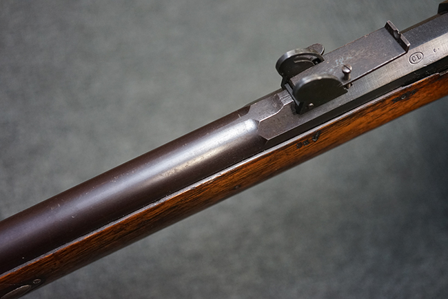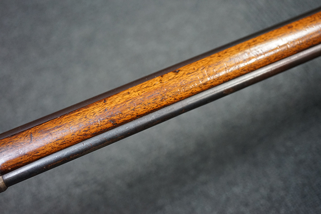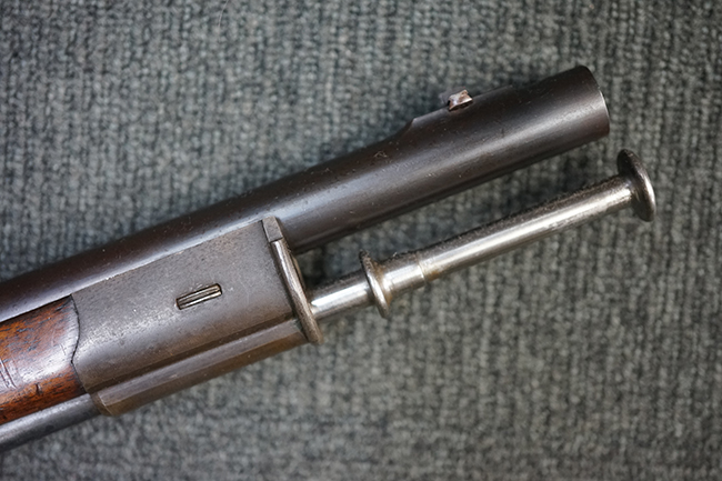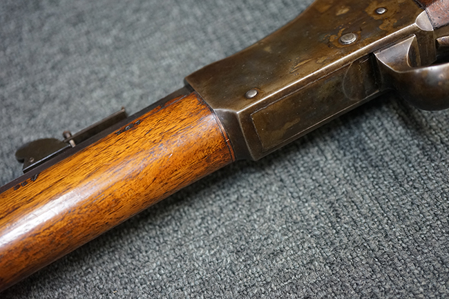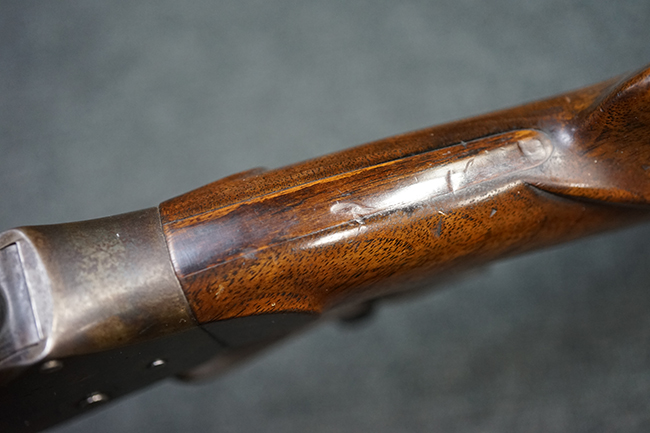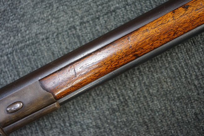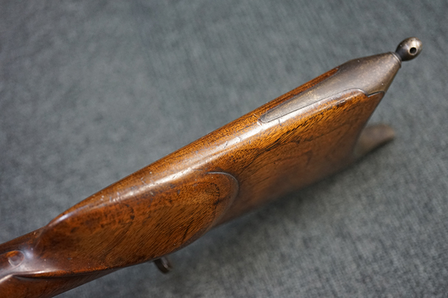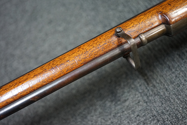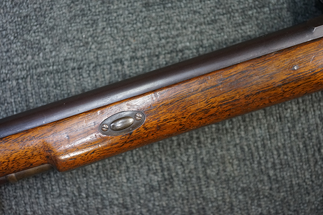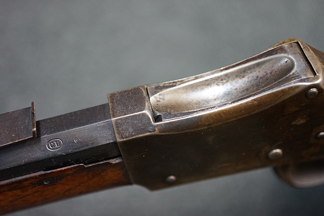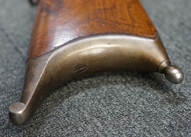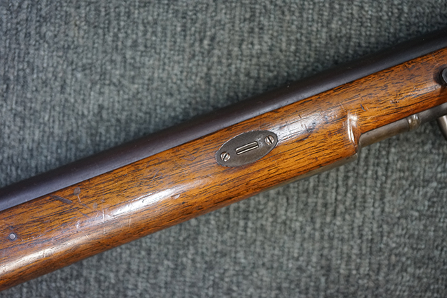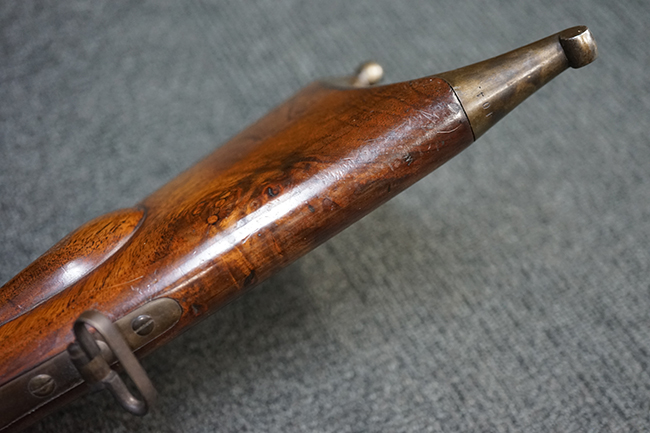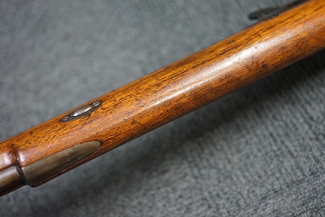 ハンドガードの左側面後方に僅かな欠けがありますが150年近く経った品と考えれば全く問題を感じない許容範囲です。 また、グリップ部上面に長くのびたアッパー・タングの溝を埋木しており、同様に右側面にもサイド・ロックの溝を埋木しているため、古いM1851 小銃系ストックを流用しているものと思われます。 埋木は大変丁寧に処理されており、周囲に違和感無く馴染んでいますので、指摘されないと判らない程度です。 この仕事は後年の修理ではなく、150年近く前の当時マルティニ・アクションを軍用ストックに載せ代えた際に行われる一般的なものです。 ハンド・ガードの後端にも似たような調整が見られます。