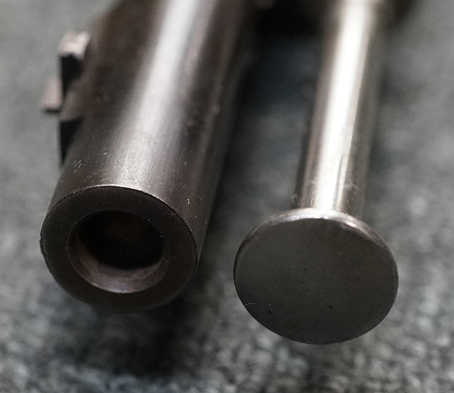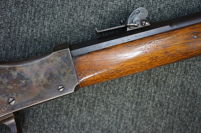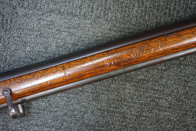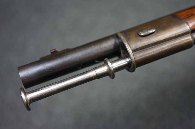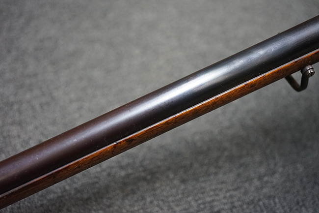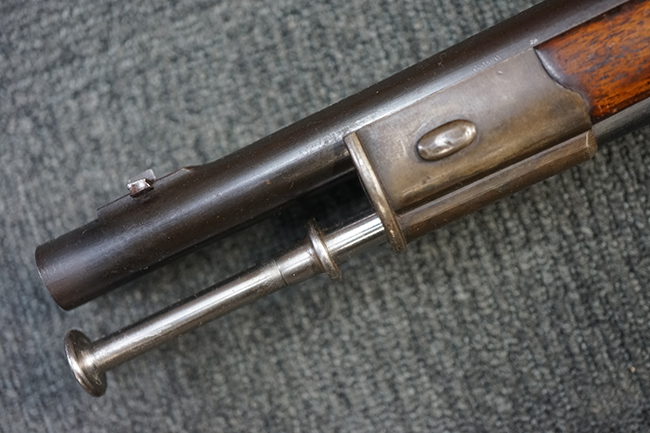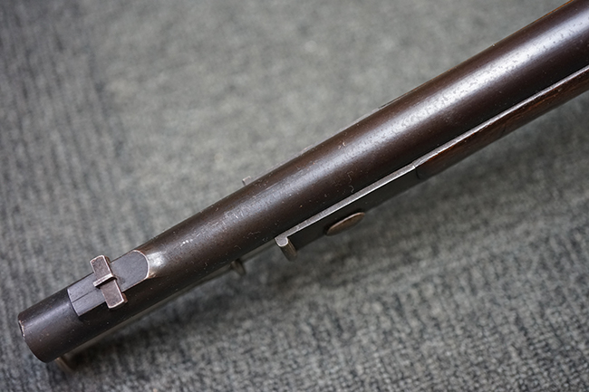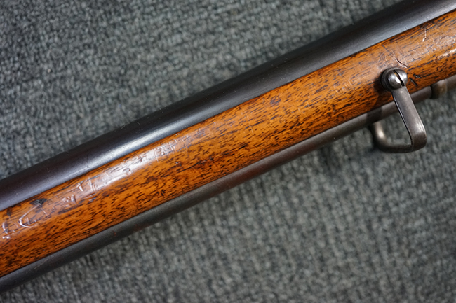 機関部やブリーチ・ブロックなどには美しいケースハードン仕上げが多く残っている程度の良い品 (ケースハードン仕上げによるブラウン系の色合いになっています) です。 ヘビー・ラウンド・バレルも薄く表面錆のあとが散見されますが、ブルーが95%以上残った素晴らしいコンディションです。 銃身後部のオクタゴン部分左側面に楕円形に「CL」の刻印が入っています。 ハンドガード後部左側面に「353」と「707」の数字が刻印されている他、バット・プレートとノーズ・キャップに「404」の刻印が見られます。 この「404」のマッチしたシリアル刻印は銃床がM1851 小銃であった頃の名残です。 軍用型ではありますが非常に上質の木部にはオリジナルの仕上げが美しい艶を残しており、素晴らしいコンディションです。 ハンドガードは側面からの楔(くさび)一本で留めてあり程度も良い品です。 楔はスムーズに着脱できますが非常にタイトに固定され、造りの良さが感じ取れます。