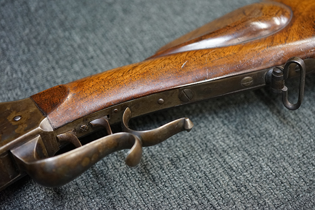 バット・ストックにはSchutzen スタイルと呼ばれるチーク・ピース部分が膨らんだ作りになっています。 一世紀以上前に造られたスイス軍で使用された木製銃床は、素材の良さと木目の美しさに定評があります。 美しい木製バット・ストックとチーク・ピース、そして独特のバット・プレートを備えたスイス製Schutzen ライフルは一挺だけでも壁に掛けて展示しても十分に見栄えがする豪華さがあります。 バット・プレートはダブル・ホックと呼ばれる上方と下方の肩当て部分が大きく出ているスタイルです。 同じくスイス軍用のハンドガードがセットになっています。 スイス軍用の1851 小銃系と同じ木部と思われます。 軍用と同じ精密射撃用のダブル・セット・トリガーが標準装備されています。 (MM)