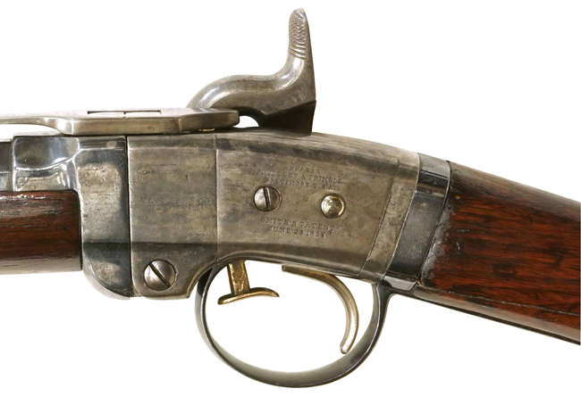 スミス カービンは、トリガー・ガード内のトリガー前方に設けられたリフター (Lifter) またはリフティング・レバー (Lifting Lever) と呼ばれる真鍮製のラッチ・レバーを上方に押し上げる事により、レシーバーと銃身を接続する上面のトップ・ストラップ (Top Strap) と呼ばれる棒状の部品の後部が持ち上がります。 これにより、トップ・ストラップによってロックされていたレシーバーと銃身が中折れ (ブレーク・オープン) し、レシーバー内のブリーチに前方から装填する事が可能となる、特殊な構造になっています。 また、弾薬についても非常に特殊で、ラバー・カートリッジ (Rubber Cartridge) と呼ばれる、ケース (薬莢) がゴム製となっており、ブリーチ内でガス圧によって密閉される.50 Smith弾を使用しました。 この弾薬は、不発の際に弾薬をブリーチ内から取り出すのが難しいという欠点がありました。 しかしながら、軽量でシンプルな構造から、上記3社で1861年から1865年の間に合計30,000挺強が生産され、その殆どが合衆国政府に納品されて南北戦争で使用されました。 スミス カービンには1st モデルと2nd モデルがあり、1st モデルはハンドガードを留めるバンドにスリング・スイベルが設けられており、バット・ストック下面にもスリング・スイベルを備えています。 これは銃を背負って携帯する騎兵隊を始めとする乗馬兵科だけではなく、砲兵など他の兵科でも使用出来る事を想定したものでした。 そのため、米国では1st モデルが「Artillery Models (砲兵モデル)」と呼ばれ、スリング・スイベルが付いていない2nd モデルが「Cavalry Models (騎兵モデル)」と呼ばれます。 1st モデルは、僅か約11,000挺のみが1863年8月までに生産され、殆どが南北戦中に消耗されました。 2nd モデルは、他の米国製カービン (騎兵銃) と同じように、レシーバー左側面にサドル・リングが装備され、前後のスリング・スイベルが廃されました。