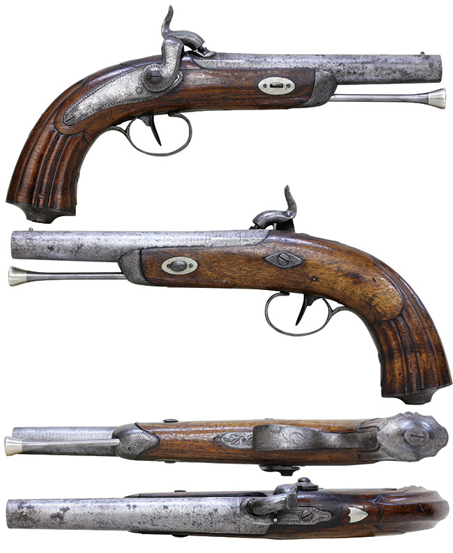 フランスで1850年頃に製作されたと思われる、中型サイズのパーカッション式 (管打式) のシングル ・ショット ピストル (単発拳銃) です。 本品はバック・アクション パーカッション ロック (Back-Action Percussion Lock) と呼ばれる、ハンマーがサイド・ロック・プレートの最も前に位置する1850年代以降のスタイルです。 このタイプのロックは一見古いモデルと思われていますが、バック・アクション自体は1800年代中期頃の品に多く見られる形式です。 フリント・ロックからパーカッション・ロックへの移行期 (1800年前期) は、当り金があった名残りからハンマーがサイド・ロック・プレートの比較的後方にありました。 一方、バック・アクション・ロックのハンマーは最も前方に配置されている他、鉄製のサイド・ロック・プレートが、木部に最も負担のかかるグリップ部分まで覆っており補強の意味でも優れていました。 本品の銃身は、銃床側面を貫通するウェッジ (Wedge) と呼ばれる平らな楔状の部品及び銃身後部から伸びるアッパー・タング (鳶の尾) によって銃床に固定されています。 銃身は緻密なダマスカス銃身となっている他、各部のネジ一本一本にも彫刻が施された丁寧な造りとなっています。 また、トリガー・ガードや銃床先端のエンド・キャップには植物を象った彫刻が施されています。 本品の銃身下部、アッパー・タング下面、ハンマー裏面にはアルファベットのAの刻印が見られますが、その他の目立ったプルーフ刻印等は見られません。 グリップ背面に洋銀製と思われる盾型の象嵌が施されています。 グリップは表面に溝の彫られたフルーテッド・グリップ (Fluted Grip) になっており、下方に向かって少し広がる優雅で珍しいデザインになっています。 (KK)