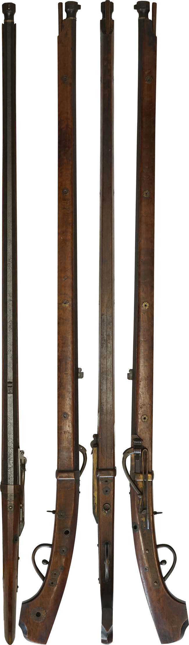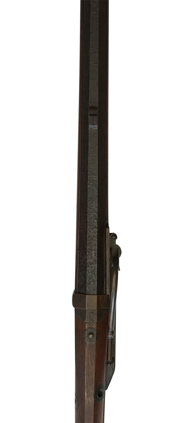 本品の銃身を含む鉄部は黒錆に覆われていますが、これは当時の日本における防錆方法であった錆付けによるもので、欧米のようにブルー仕上げがなかった日本では一般的なものでした。 銃床に隠れる銃身下部等にやや表面錆や若干の朽ち込み痕が見受けられるものの、大きな欠損等は見られず、概ね良好な状態が保たれています。 銃身下部の目釘金具と銃床の目釘穴の位置は4か所とも一致しています。 銃床は全体に若干の経年による打ち傷や擦れが見られる他、現状先端部内側に16cm程度の亀裂が見られ、亀裂を中心に銃床が左右にやや広がって隙間が生じていますが、現状では他に大きな破損や欠損は見受けられず、全体に概ねしっかりとした状態が保たれています。