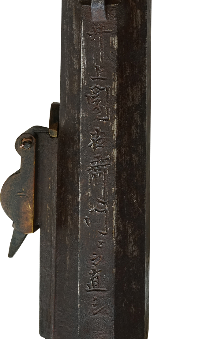 本品は在銘で、銃身下部に「井上関右衛門ニテ直シ」の銘が入っています。 井上関右衛門は堺鉄砲鍛冶の代表的な一門で、全国鉄砲鍛冶銘鑑P.31-32にも摂州住として掲載されています。