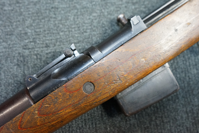 この2社の銃は計らずも同じようなコンセプトを持ち、同じような使用方法、同じような外観を持つ銃となりました。 このため、Gew.41の場合、モーゼル社には(M)、ワルサー社には(W)の頭文字がモデル名の後に付けて区別されていました。 結果としてワルサー社に軍配が上がり、Gew.41(W)はGewehr 41として1942年12月に正式採用になりました。 このため正式採用されてからの生産品には、試作品に見られた(W)の刻印がなくなり、G.41のみ刻印されています。 本品もその(w)が付いていない品です。 しかしながらまだまだ過渡期の自動小銃であり、そのガスシステムを中心とした機関部は問題を残しており、さらなる改良が求められました。 その後、トカレフ半自動小銃やシモノフ自動小銃を参考にしたと思われるガス圧利用システムをGew.41に組み込むことにより、後のGew.43が完成されることになります。 Gew.41は、ワルサー(ac)社とベルリン・リューベッカー(duv)社の2社により、Gew.43採用後も1944年初めまで生産が続けられたとされています。