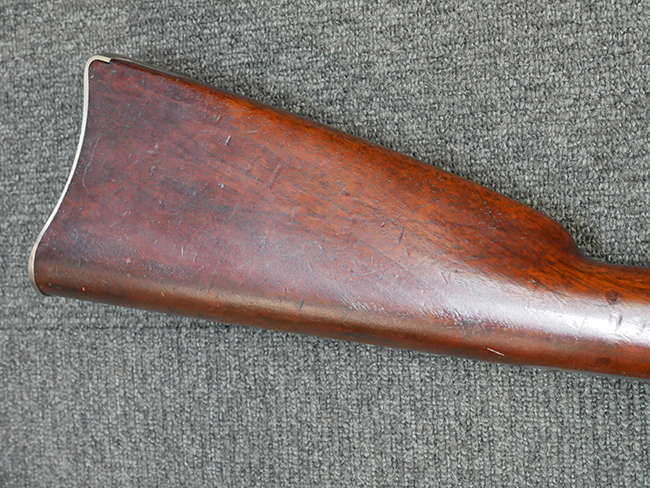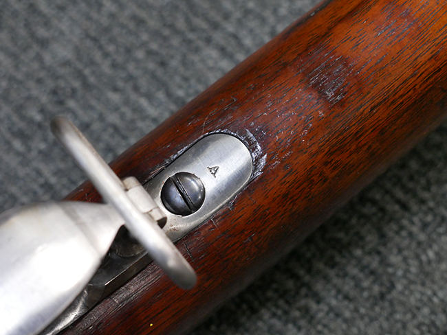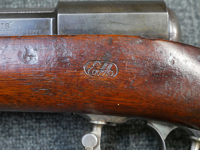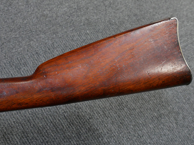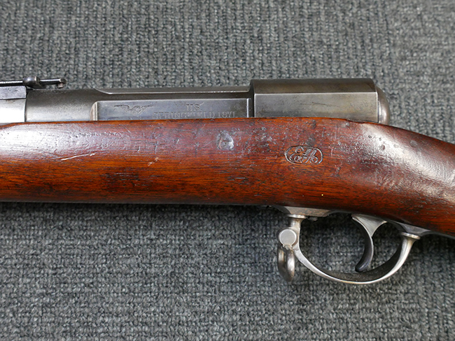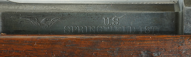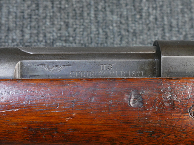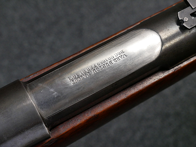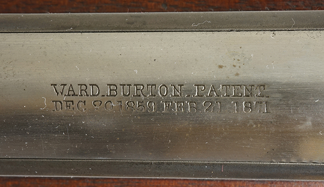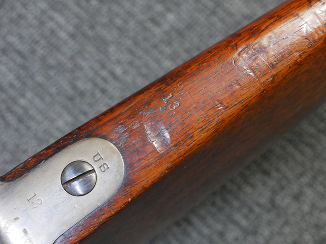 本品の機関部左側面には「U.S. SPRINGFIELD 1871」の刻印の他、スプリングフィールド造兵廠を示す翼を広げたアメリカン・イーグルの刻印が入っています。 ボルト・ヘッド上面には「WARD BURTON. PATENT. DEC. 201859. FEB.21 1871」のパテント刻印が入っています。 その他、銃床右側面の機関部下部付近には楕円形の中に「EFA」の文字が入ったCartouchesと呼ばれる軍の検査官刻印が入っています。 また、バット・ストック後部上面にトライアル時の米軍の管理番号と思われる「13」の刻印が入っている他、バット・プレート上面にも「US 13」の刻印が入っています。