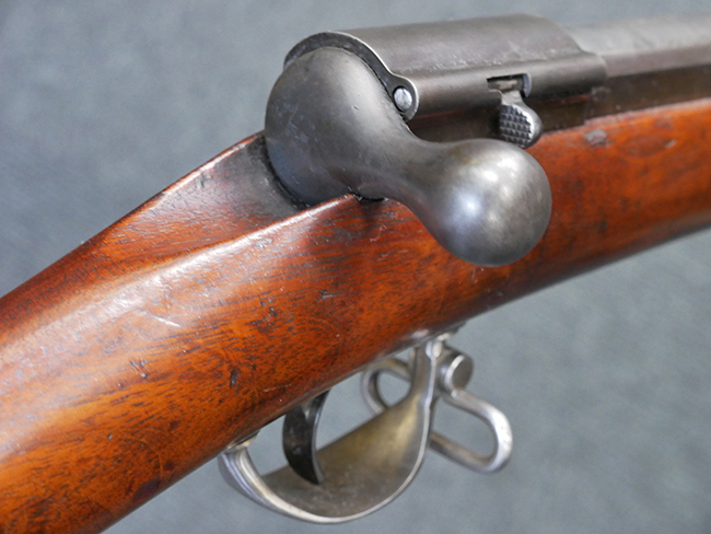 M1871 ウォード・バートン 小銃は、マサチューセッツ州のスプリングフィールド造兵廠で米陸軍のトライアルに向けて銃身長32 5/8インチの歩兵銃が1,011挺製造された他、銃身長22インチの騎兵銃モデルも316挺が製造されましたが、本体にはシリアルNo.は打刻されませんでした。 製造されたM1871 ウォード・バートン 小銃の大半は1871年に米軍が実施したトライアルに投入されましたが、当時トラップドア式小銃の優位性を疑わなかった軍部にとって本銃の評価は芳しいものでは無く、試験的な運用に留まりました。 トライアルでの審査は多くの保守的な将軍達の発言力が強く、古くからのサイド・プレートに装着されたハンマーによる外火式が撃発ポジション(フルコック、ハーフコック、セーフ)が明確であるのが安心(信頼性)の根拠でした。 M1871にもレシーバ右側面にレバー・セーフティが設けられており、ボルト・ハンドルが約15°開いた状態でロックされます。 それによってシアとファイアリング・ピンとの連動が切られて暴発を防ぐ構造になっていました。 トライアルの一環として第13歩兵部隊(US 13th Infantory)に支給されて、実際にYellowstone Expendition of 1873でも使用され実戦試験も行われました。 シンプルなボルト・アクション・メカニズムでありながらも、従来の小銃(トラップドア)と操作方法が全く異なっていた事もあり、トライアル部隊からも良い評価が得られませんでした。
