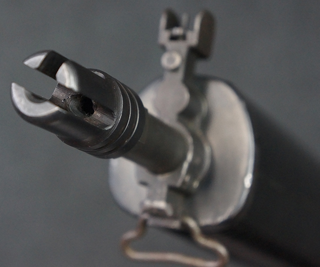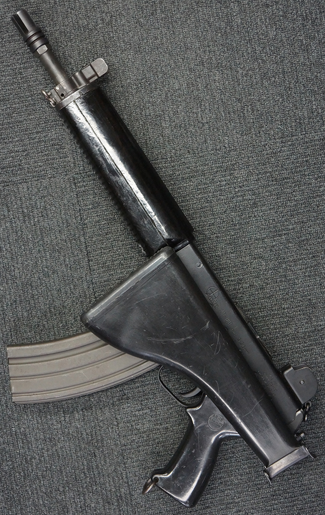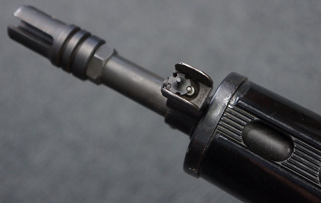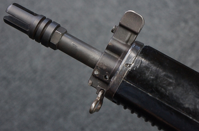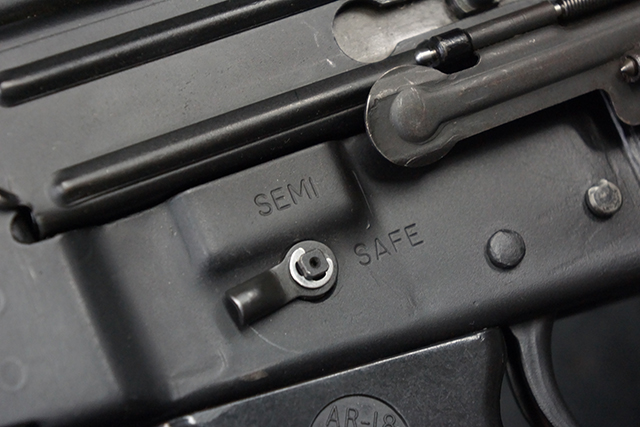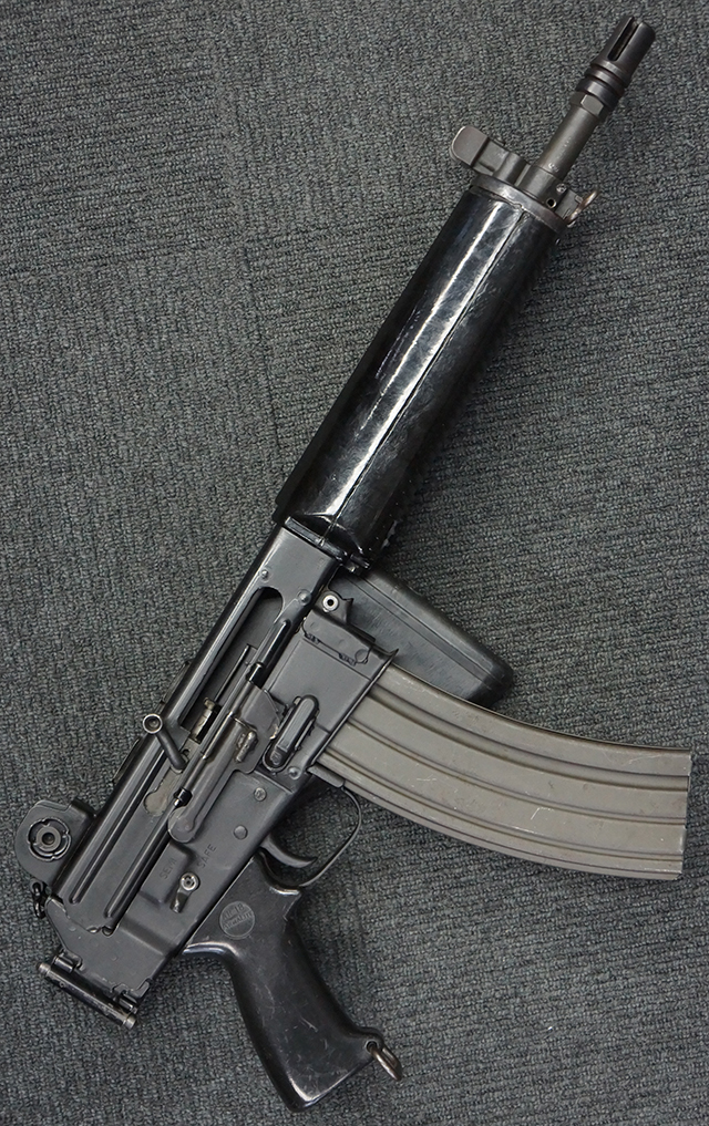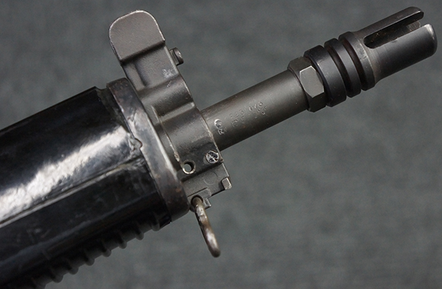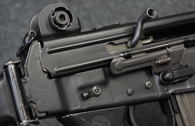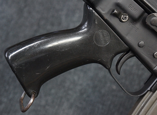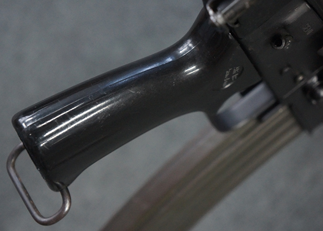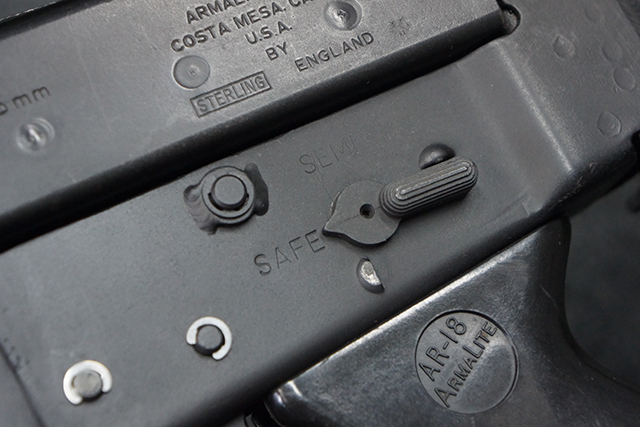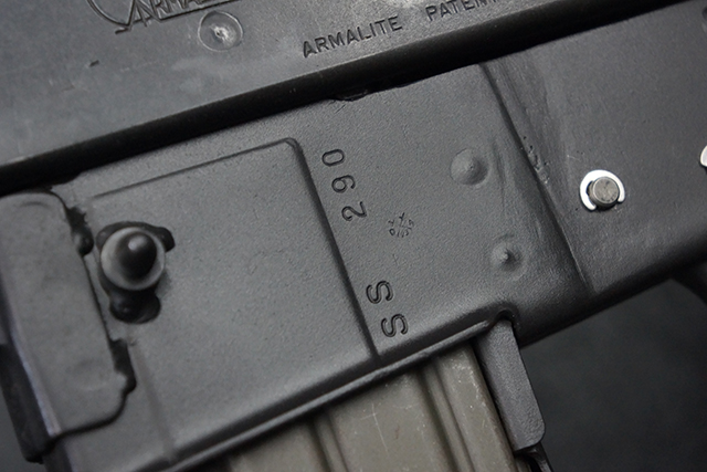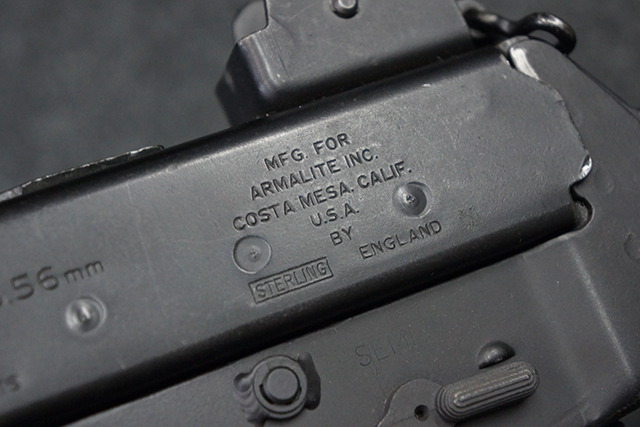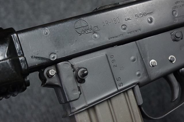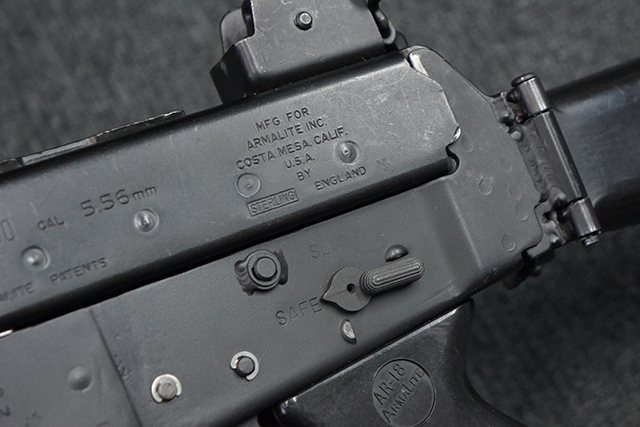 本品はスターリング・アーマメンツ社で製造されたAR180Sで、アッパー・レシーバー左側面にはアーマライトのロゴや「AR-180 CAL 5,56mm」のモデル名刻印の他、スターリング社で製造された事を示す「MFG. FOR ARMALITE. INC. COSTA MESA. CALIF. U.S.A. BY STERLING ENGLAND」の刻印が入っています。 ロア・レシーバー左側面にはシリアルNo.SS290が入っています。 本品はAR180Sのため、セレクターは「SAFE」及び「SEMI」のポジションのみとなっています。 本品はショート・モデルながらサプレッサーがフルサイズのライフル・モデルと同じ品で、ハンドガードは下部にバーティカル・グリップが元々取り付けられない形状になっています。