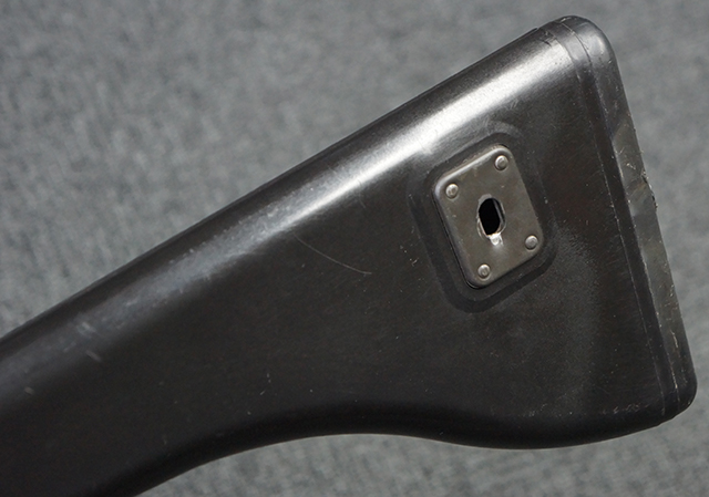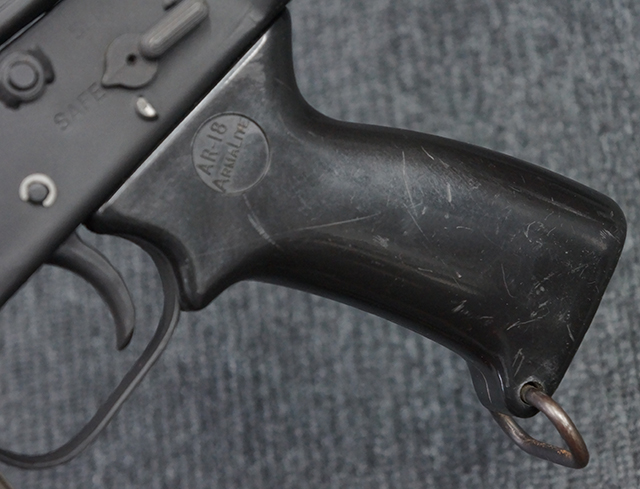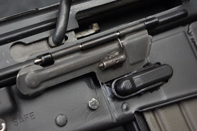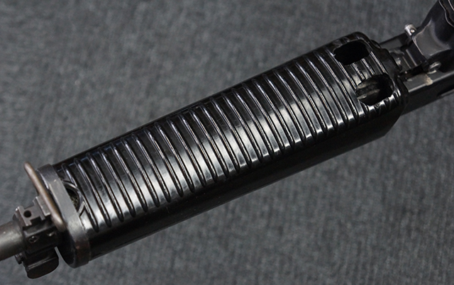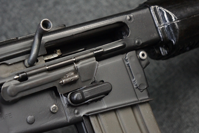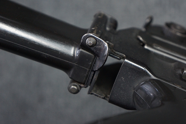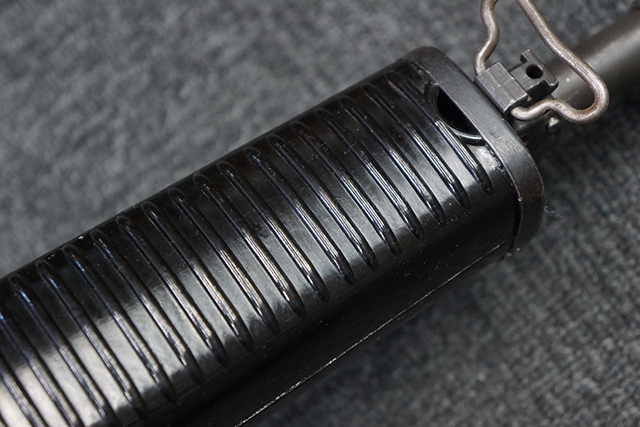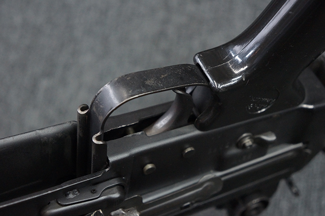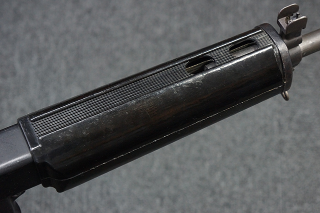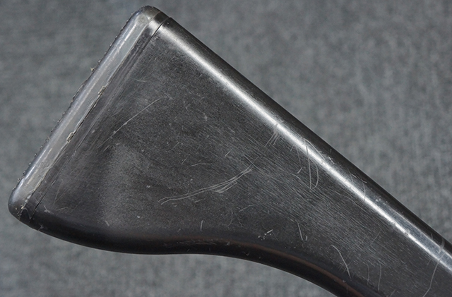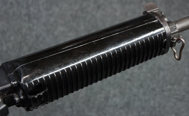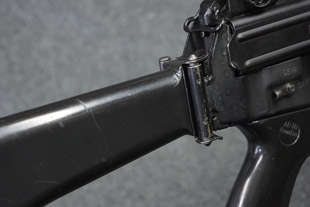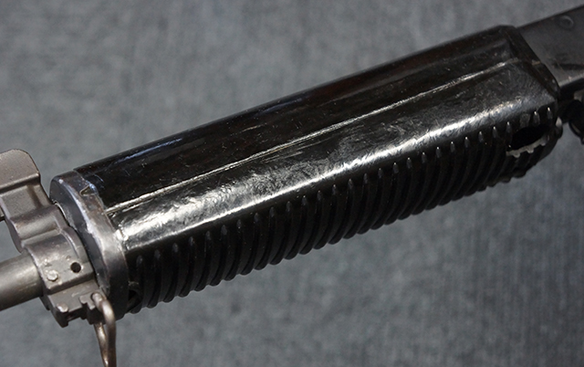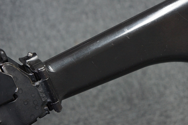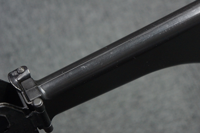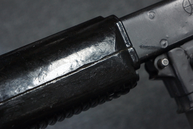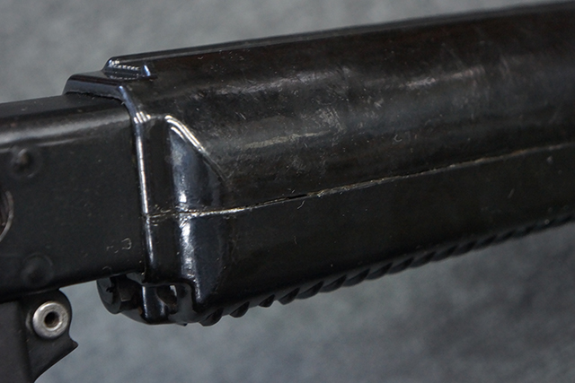 本品は全体に適度な使用感が見受けられ、金属部はやや小傷や擦れ等が見受けられるものの、大きな欠損等は見受けられず、概ねしっかりとした状態が保たれています。 焼付け塗装仕上げの上下レシーバーは、アッパー・レシーバーがロア・レシーバーに比べて僅かに黒味の強い色合いとなっていますが、大きな違和感は有りません。 樹脂製のハンドガードやグリップ、バット・ストックについても、やや打ち傷や線傷は散見されるものの、大きな破損は見られず、概ねしっかりとした状態が保たれています。 ハンドガード下面後部に僅かな欠けが見られる他、ハンドガード前端部分に一部欠けを補修した痕跡が見られるものの、外観上はそれほど気にならないレベルのものです。 傷み易いバット・プレートについては、やや打ち傷が目立ちますが、大きな割れや欠けは見られず、取り付けもがたつきもなくしっかりとしています。