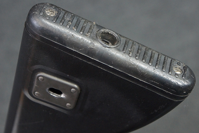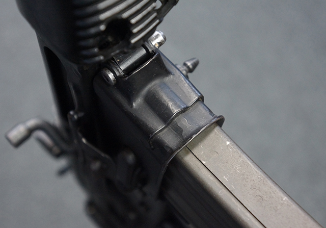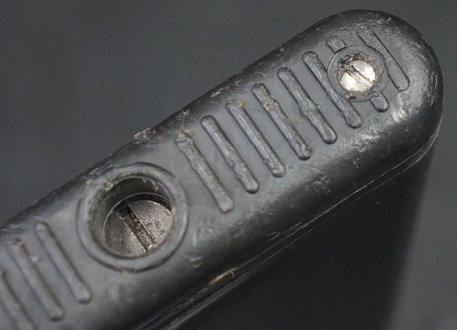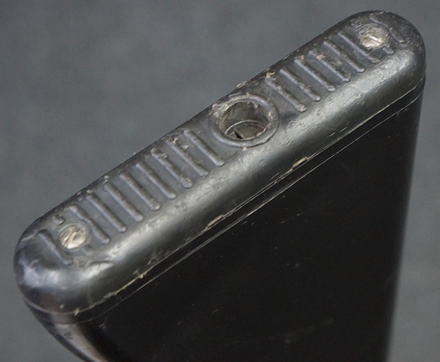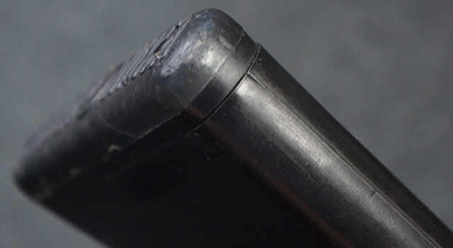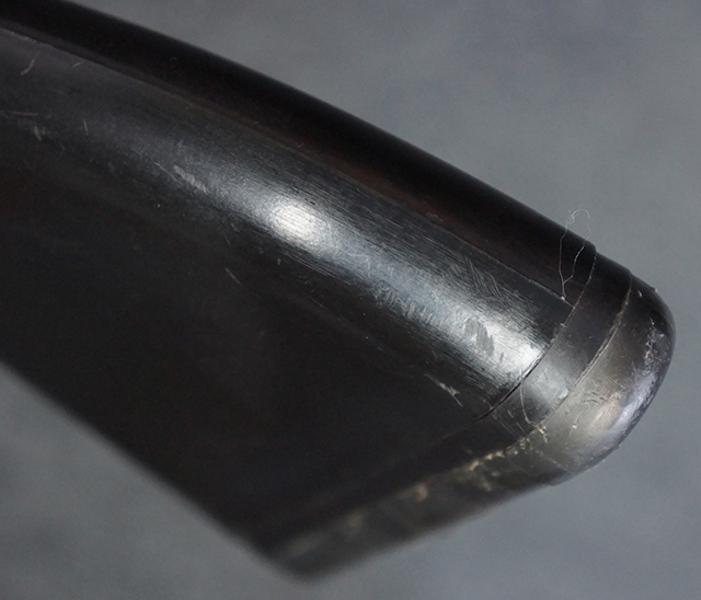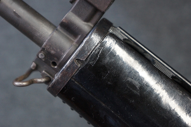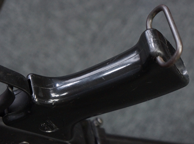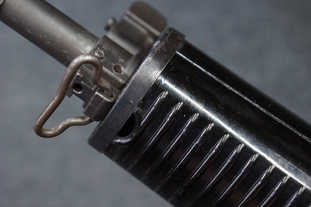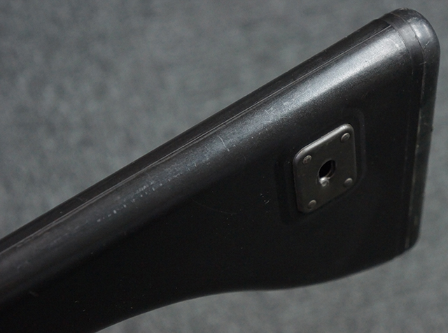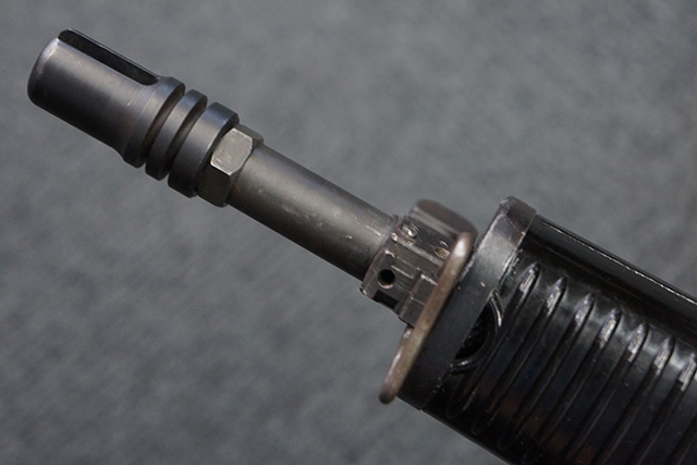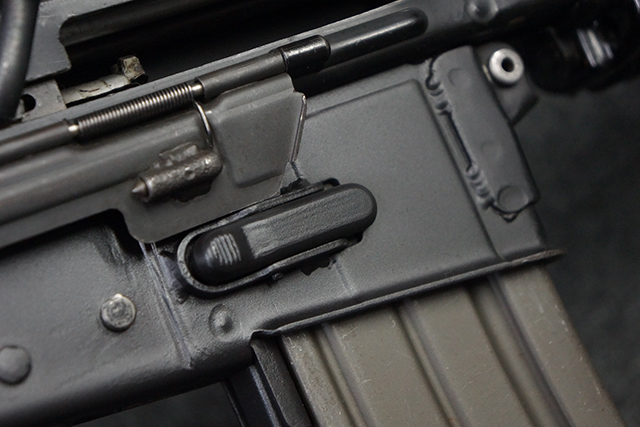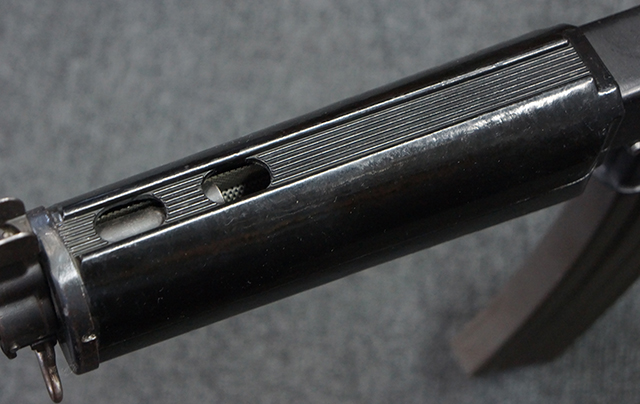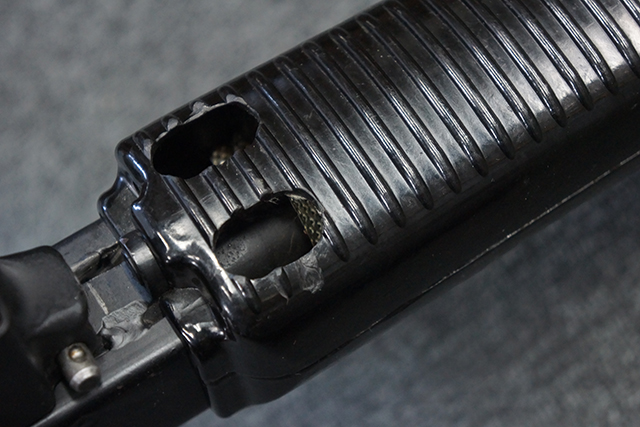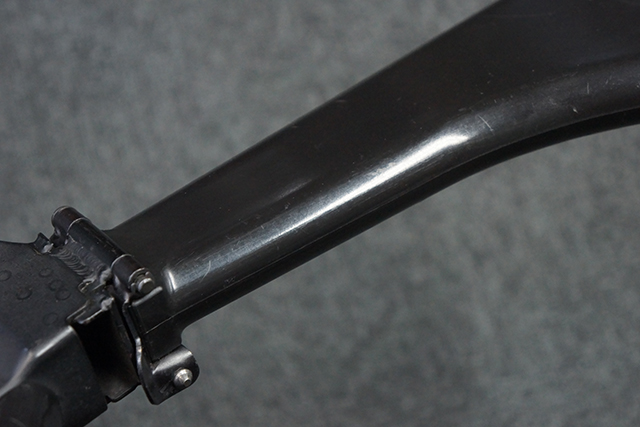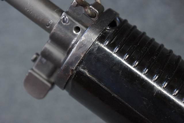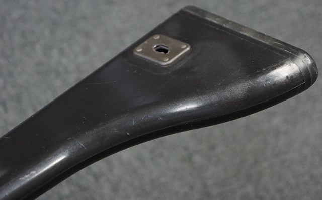 本品は全体に適度な使用感が見受けられ、金属部はやや小傷や擦れ等が見受けられるものの、大きな欠損等は見受けられず、概ねしっかりとした状態が保たれています。 焼付け塗装仕上げの上下レシーバーは、アッパー・レシーバーがロア・レシーバーに比べて僅かに黒味の強い色合いとなっていますが、大きな違和感は有りません。 樹脂製のハンドガードやグリップ、バット・ストックについても、やや打ち傷や線傷は散見されるものの、大きな破損は見られず、概ねしっかりとした状態が保たれています。 ハンドガード下面後部に僅かな欠けが見られる他、ハンドガード前端部分に一部欠けを補修した痕跡が見られるものの、外観上はそれほど気にならないレベルのものです。 傷み易いバット・プレートについては、やや打ち傷が目立ちますが、大きな割れや欠けは見られず、取り付けもがたつきもなくしっかりとしています。