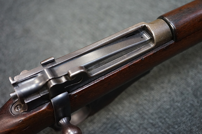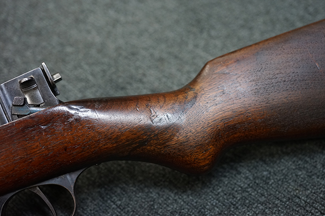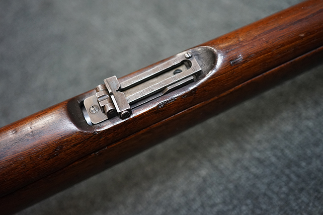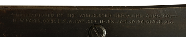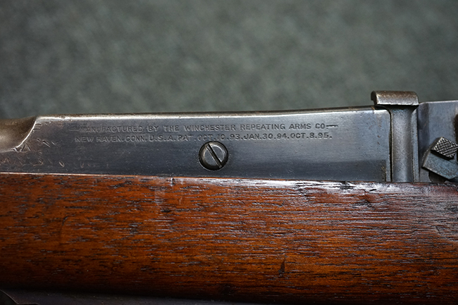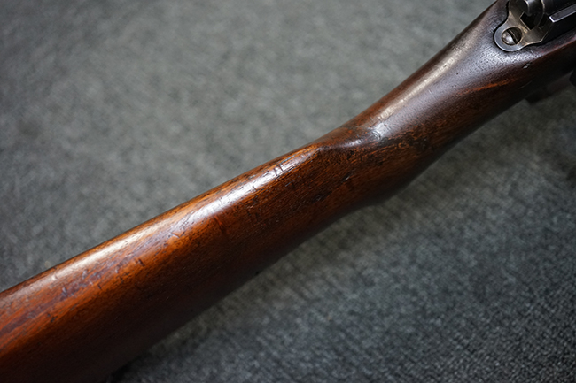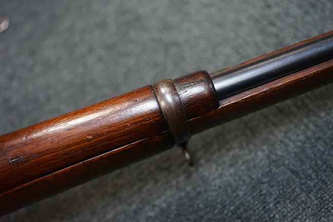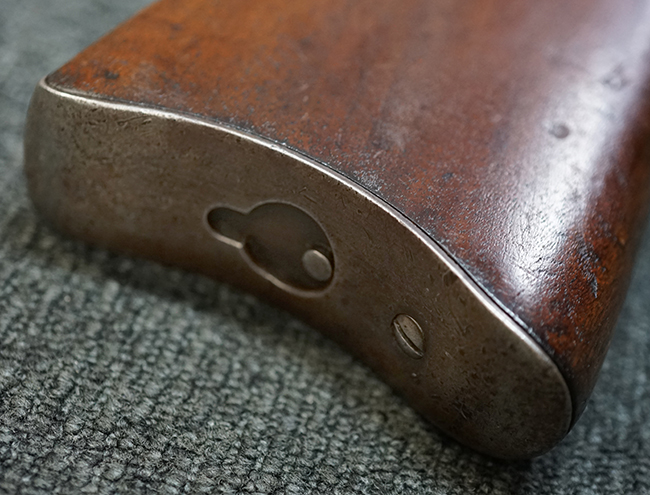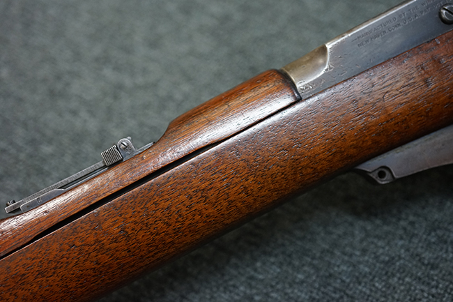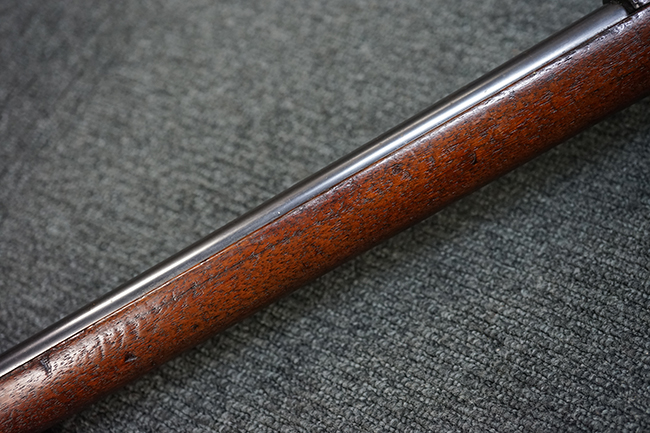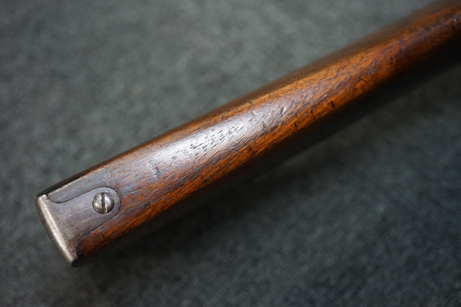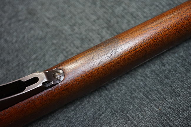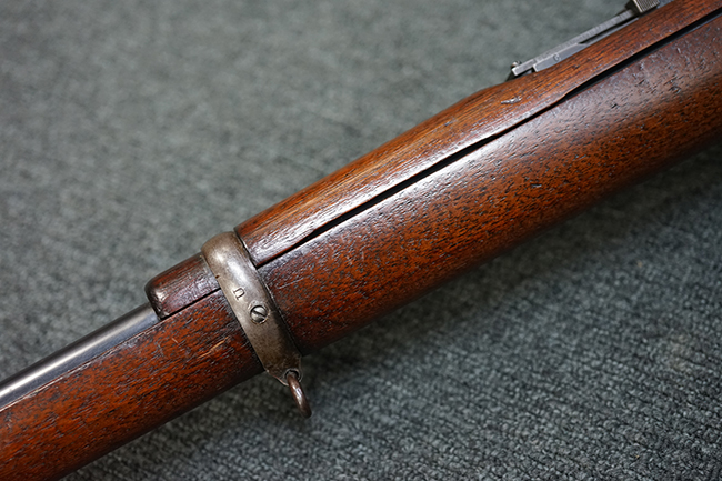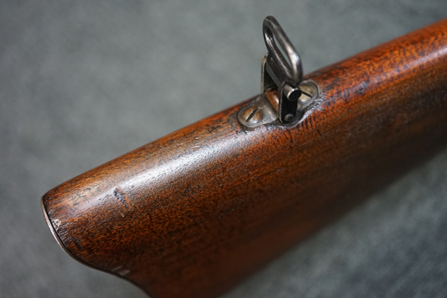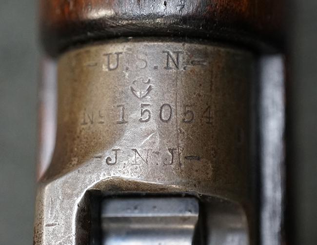 銃身は美しいブルー仕上げがほぼ完全に残っています。 銃身を除く金属部分であるレシーバー、マガジンと一体になったトリガー・ガード、フロント&リア・バンド、ボルト・ハンドルは多少使用感が見られますがオリジナルのブルー仕上げが60%以上は残っているので製造時代を考えると十分許容範囲以上です。 薬室上部に「-U.S.N.-( 一行目)、アンカー(二行目)、No.15054(三行目)、-J.N.J-(四行目)」の刻印があります。 一行目/二行目は米海軍/海兵隊を表し-J.N.J-は検査官のイニシャルになります。 三行目のシリアルNo.から第二回目契約(2nd Contract)での最初の54挺目に当たる本品は中国に派遣された米国海兵隊が装備ひした可能性が高い品です。また機関部左側面には「-MANUFACTURED BY WINCHESTER Repeating ARMS CO.-( 一行目)、NEW HAVEN. CONN.U.S.A. PAT. OCT. 10. 93. JAN. 30. 94. OCT. 8. 95. 」のメーカー刻印とパテント刻印が入っています。 更にセンターバンド、フロント・サイド・カバーに米軍用を表す「U」の刻印が入っています。 木部は金属部とマッチした美しいアメリカン・ウォルナット製で僅かな小傷はありますが、オリジナルの仕上げがほぼ完全に残った非常に美しい状態です。 しかしながらストックのグリップ部に古いひびの修理跡が見られますが、殆どきにならない程度です。 ストックとハンドガードの色合い材質もマッチしています。 バット・プレートに付いているさく杖(さく杖は付属しておりません)収納用の蓋は可動します。 バット・ストックに付いたスリング・スイベルは取り外し式で、マガジン前方の位置にも変更可能です。