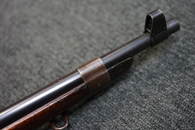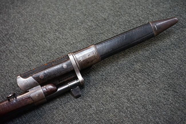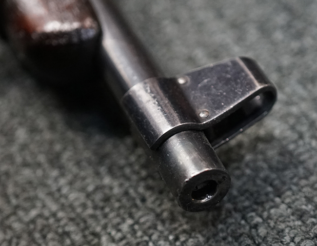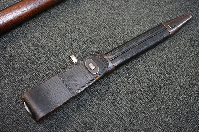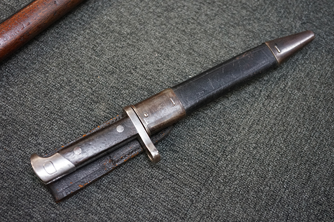 トリガーテンションのある、ボルトが閉じた状態で固定された旧加工品です。 専用のナイフ型銃剣 (剣身は切断済) が付属します。 (MM)