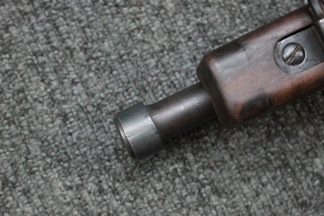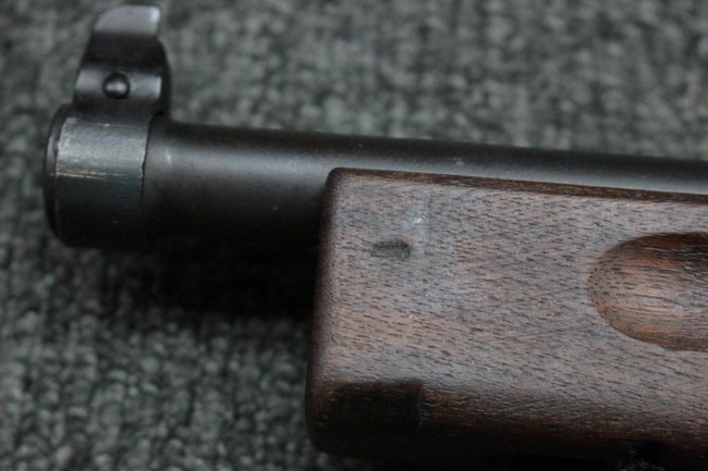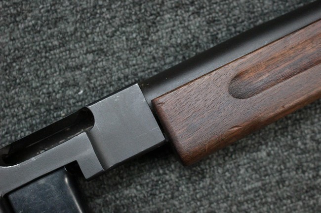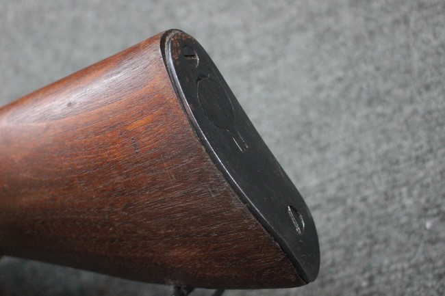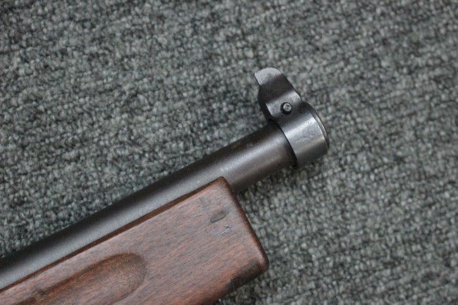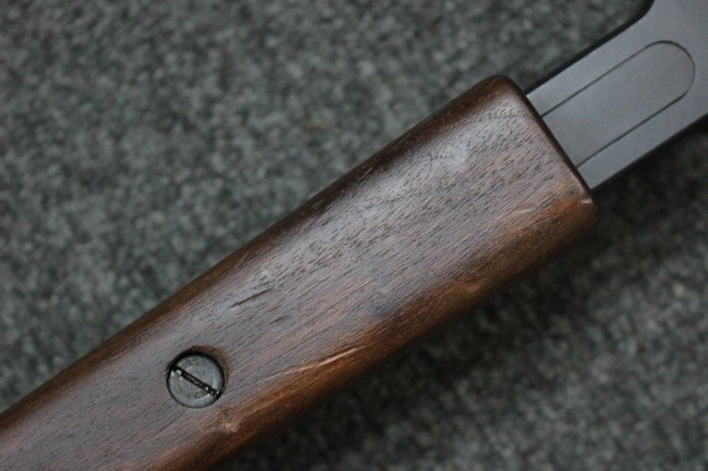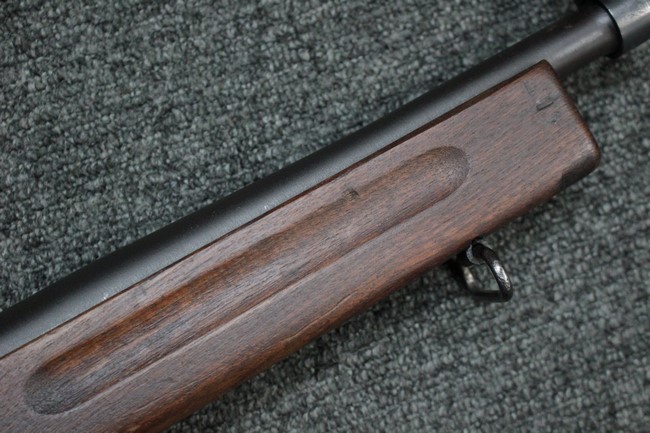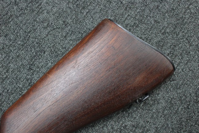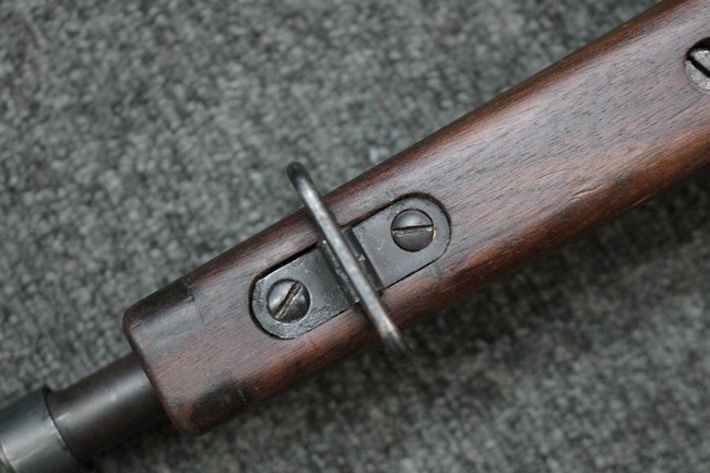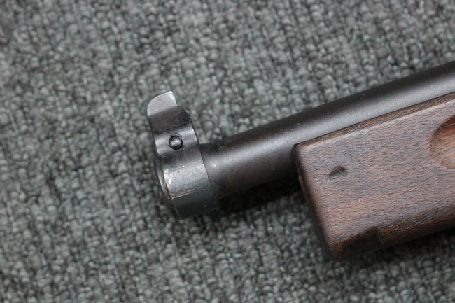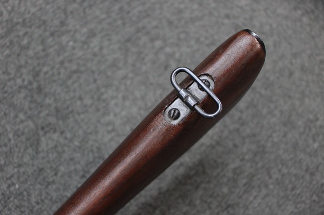 本品の金属部はやや小傷や擦れが見受けられる他、一部に仕上げが薄くなっている箇所が見受けられるものの、目立った欠損等は見られず、パーカー仕上げも比較的良好に残っています。 木製のハンドガードやグリップ、バット・ストックについても、やや打ち傷や線傷、一部に仕上げの剥落が見られる他は大きな割れや欠け等は見られず、各部の取り付けも現状目立ったがたつきはなくしっかりとしています。 ストックとグリップに比べてハンドガードが僅かに明るい色合いとなっていますが、こちらもそれほど違和感は感じられません。 フロント・スイベルは全体に仕上げが落ちて金属の地肌が表れています。 バット・プレート上面に若干の錆が見受けられますが、全体の状態は良好で、コンパートメント・ドアの開閉も問題ありません。