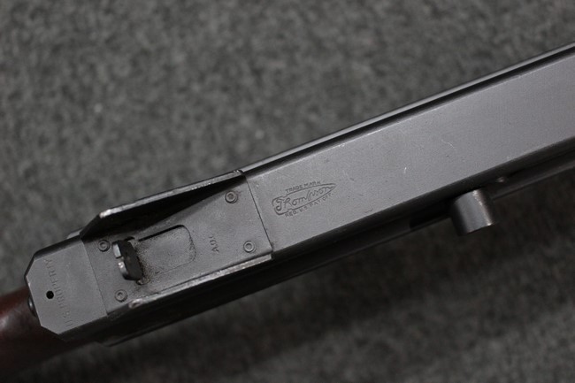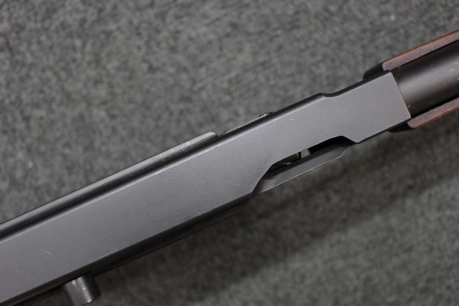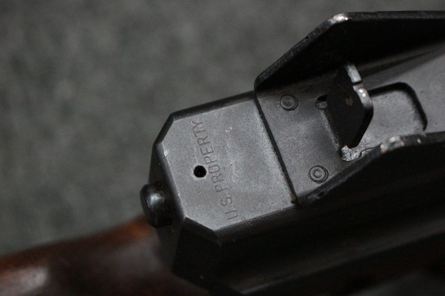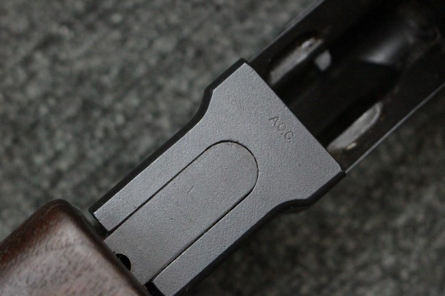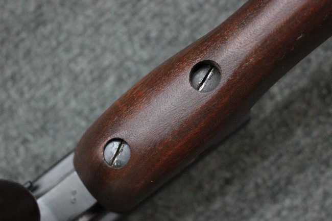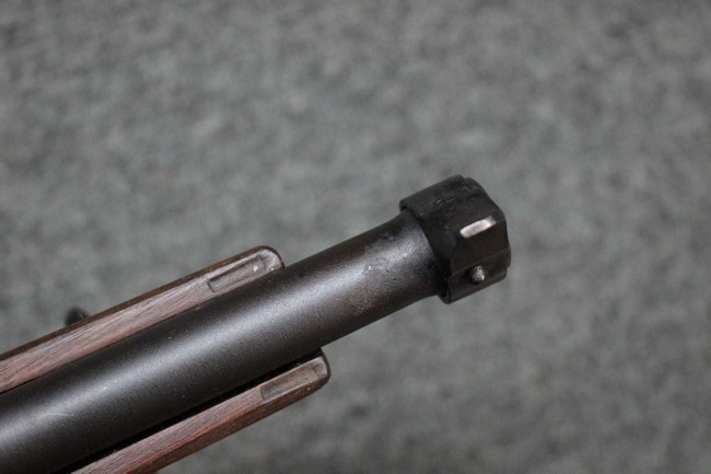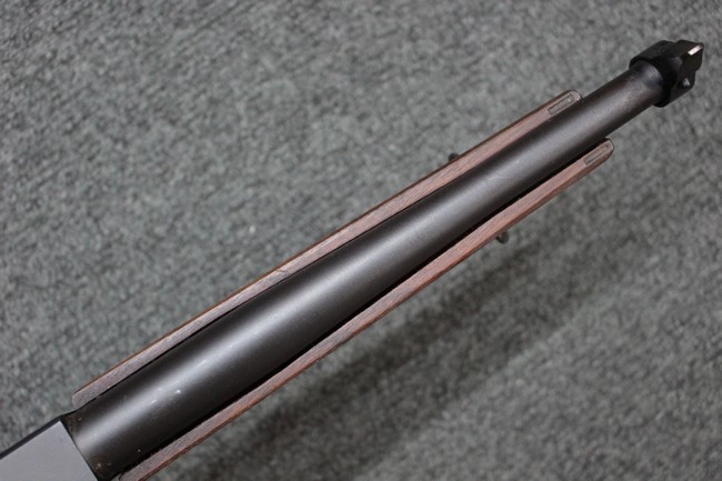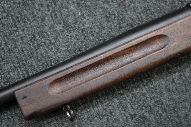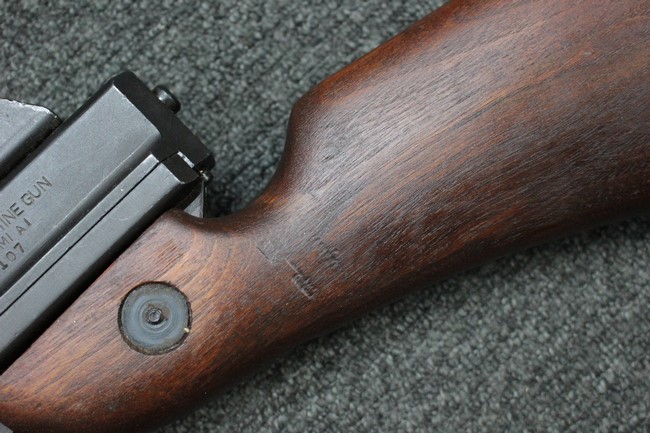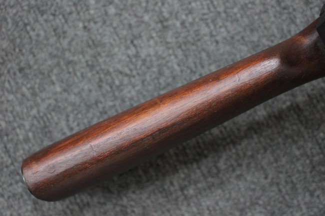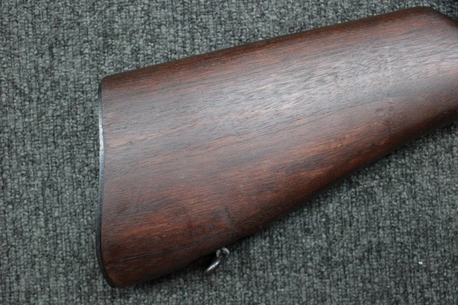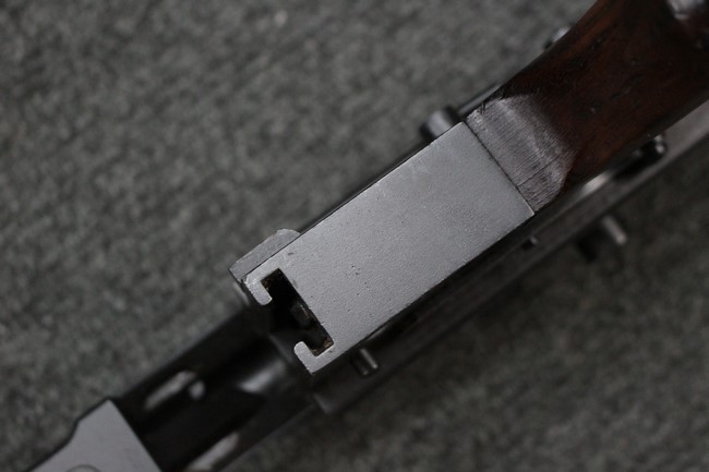 本品の金属部はやや小傷や擦れが見受けられる他、一部に仕上げが薄くなっている箇所が見受けられるものの、目立った欠損等は見られず、パーカー仕上げも比較的良好に残っています。 木製のハンドガードやグリップ、バット・ストックについても、やや打ち傷や線傷、一部に仕上げの剥落が見られる他は大きな割れや欠け等は見られず、各部の取り付けも現状目立ったがたつきはなくしっかりとしています。 ストックとグリップに比べてハンドガードが僅かに明るい色合いとなっていますが、こちらもそれほど違和感は感じられません。 フロント・スイベルは全体に仕上げが落ちて金属の地肌が表れています。 バット・プレート上面に若干の錆が見受けられますが、全体の状態は良好で、コンパートメント・ドアの開閉も問題ありません。