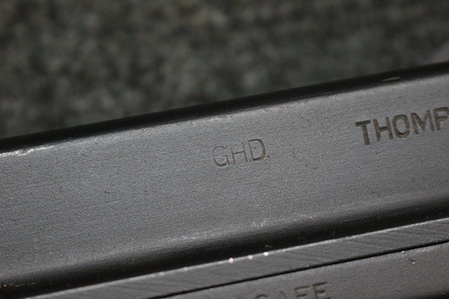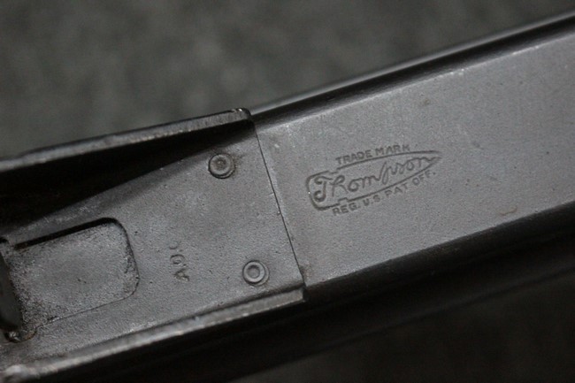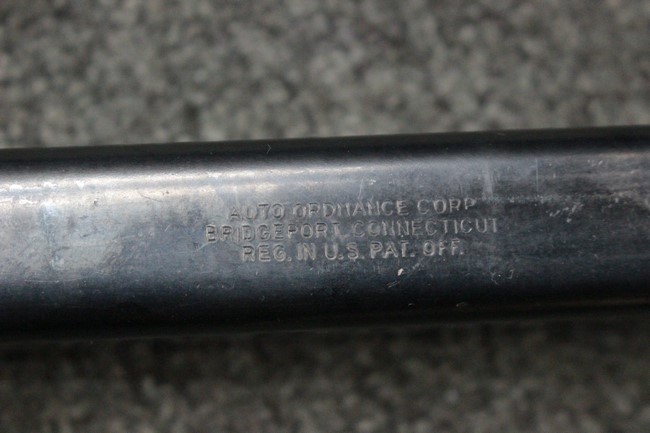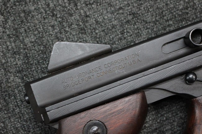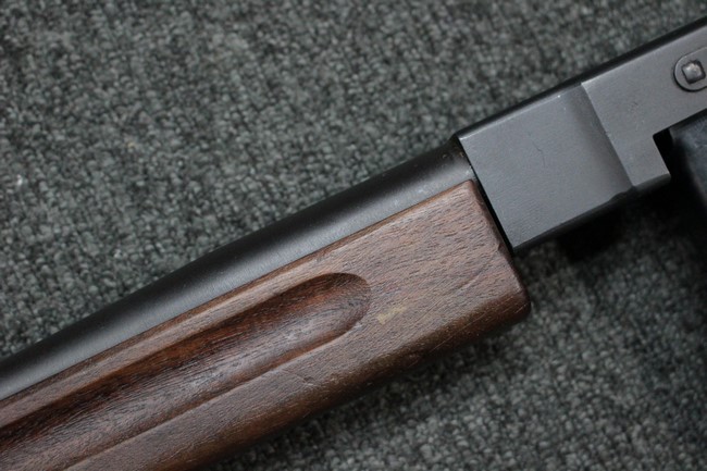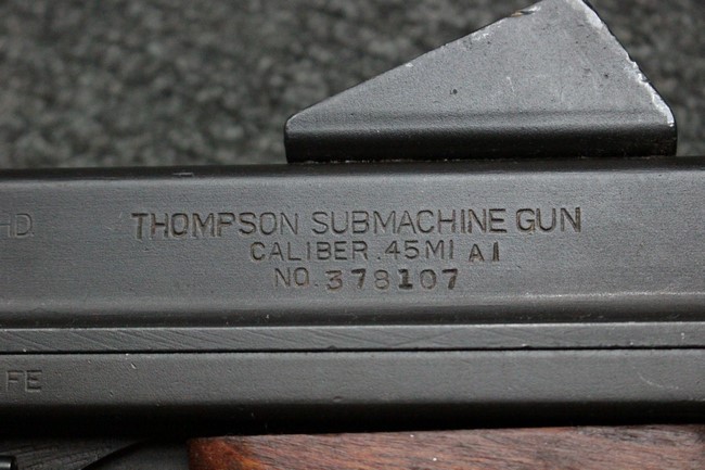 本品はレシーバー左側面に「THOMPSON SUBMACHINE GUN CALIBER .45 M1 A1」の刻印及びシリアルNo.378107の刻印が見られます。 モデル名のA1は追加で打刻されており、リア・サイトは三角形のガード付きのM1A1タイプとなっています。 また、レシーバー右側面には「AUTO-ORDNANCE CORPORATION BRIDGEPORT, CONNECTICUT, U.S.A」の刻印が入っています。 その他、レシーバー上面にはトンプソンのロゴが入っています。 セーフティ・レバー及びセレクター・レバーはがピン・タイプで統一されています。 尚、アッパー・レシーバーにオート・オードナンス社製を示すA.O.C.、スプリング・ガイド、セーフティー・レバー及びセレクター・レバー、にはサベージ社製を表すSの刻印が入っています。