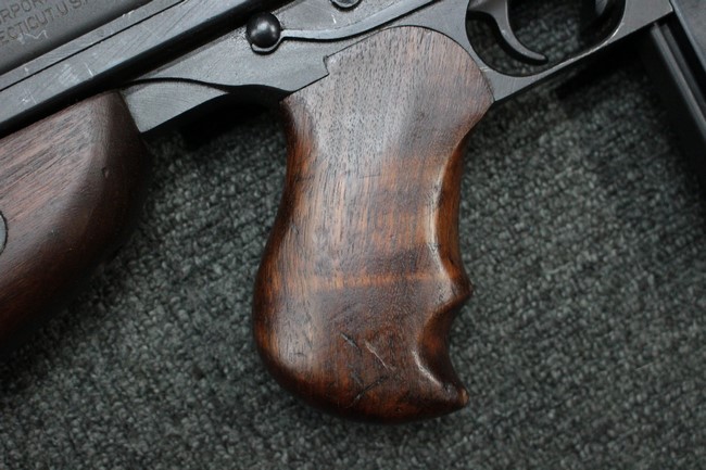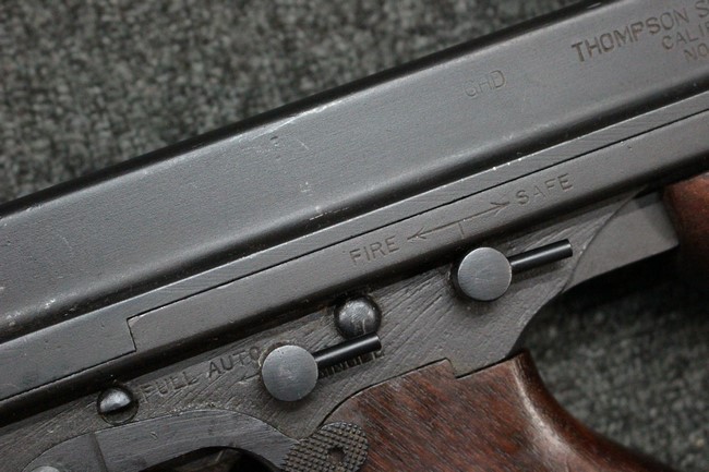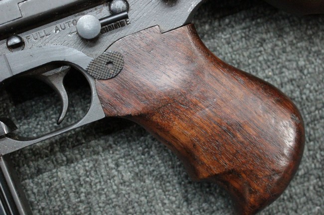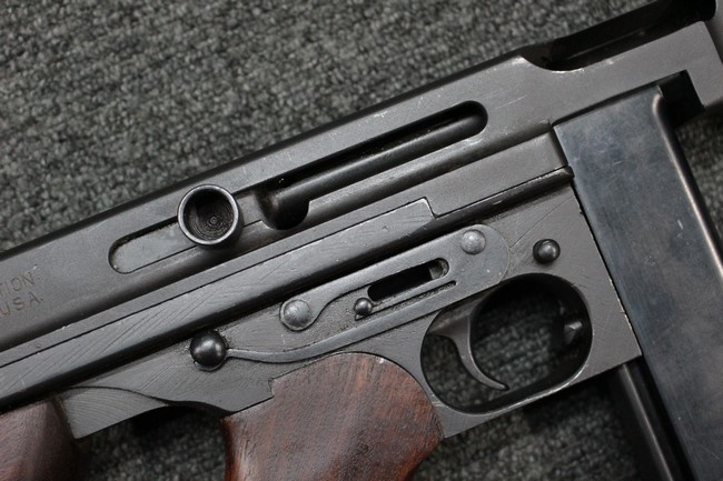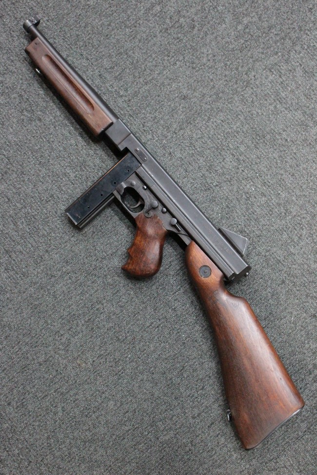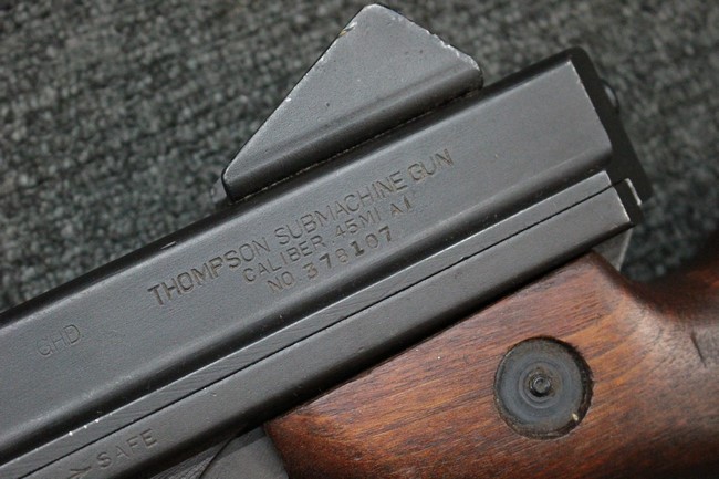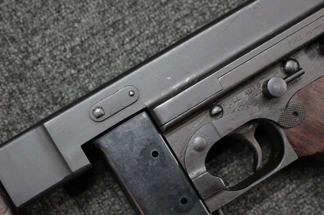 トンプソンM1928A1短機関銃の製造コストを下げるために各部を改良したトンプソンM1短機関銃に対して、さらに撃針の固定化等の追加改良を加えたモデルです。M1A1ではリア・サイトの変形を防止する為、三角形のリア・サイト・ガードが標準装備されるようになりました。また、元々はM1として製造された物の中にも、後にM1A1に準じた改修を受けてA1刻印を追加された個体も存在します。