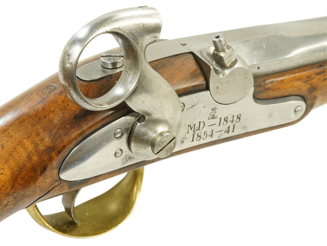 150年前に製造されたのにも拘らず全体的に見れば準未使用と呼べる素晴らしい状態の品です。銃身の裏側(木部で隠れている部分)に「DDM」の刻印が比較的大きく鮮明入っており、他に「王冠にD?」のプルーフ刻印が、薬室の裏側にも鮮明に「38M」そして判読不明の小さな刻印が幾つも入っています。 アッパータングの裏側(尾栓)に製造年を表す「18??」が入っていますが、銃床に隠れているために外部からは見えません。 多くの部品にデンマーク王国の検査刻印が打たれています。 第三帝国の「アムト刻印」に相当する検査刻印です。 木部にも刻印が入っています。 サイド・ロック・プレートにKjobenhavns Toihuus(コペンハーゲン造兵廠)の王冠プルーフ刻印が一番上にあり、その下にモデル名「MD-1848」が鮮明に入っています。 一番下に1854年製を表す「1854」とデンマーク軍独特の製造年の後に続くアッセンブリー番号「41」の刻印がはっきりと入っています。 銃身、サイド・ロック等の金属部分全体に白磨き仕上げになっていますが時代錆も出ておらず未使用のような状態です。 木部はオリジナルの艶がほぼ全て残った最高に良い状態です。 さく杖は元々付かないモデルです。 弊社でも19世紀の制式軍用拳銃は入荷する事が少なく、無骨な軍用銃の魅力がある品です。 小国デンマーク王国軍用の古式銃は世界的にも少なくデンマーク特有のリング・ハンマーが付いた騎兵拳銃は特徴的で、弊社でも本品が唯一の品です。 本品と同じモデルは国内には殆ど入っていないと思われます。(MM)