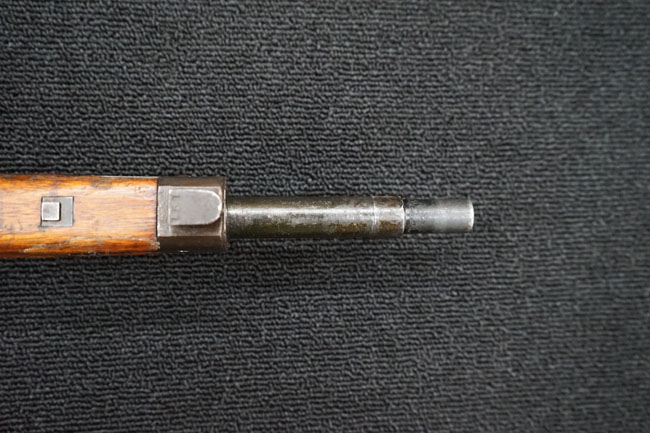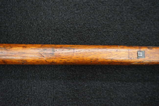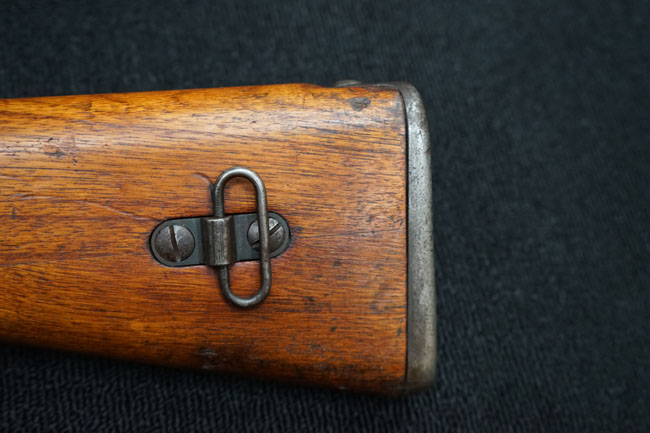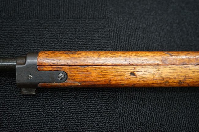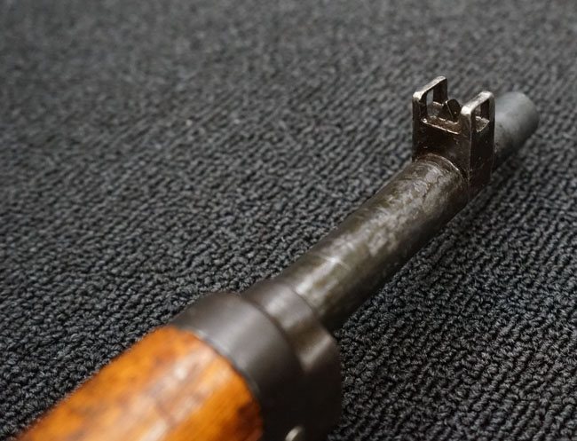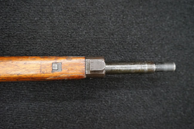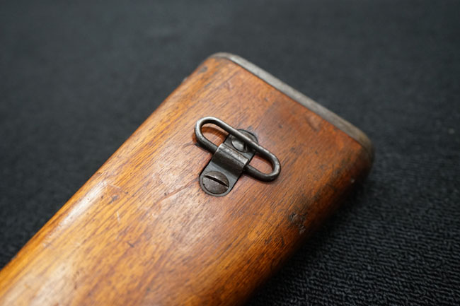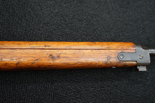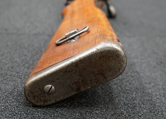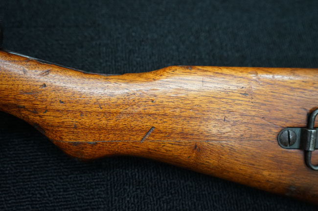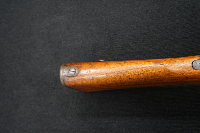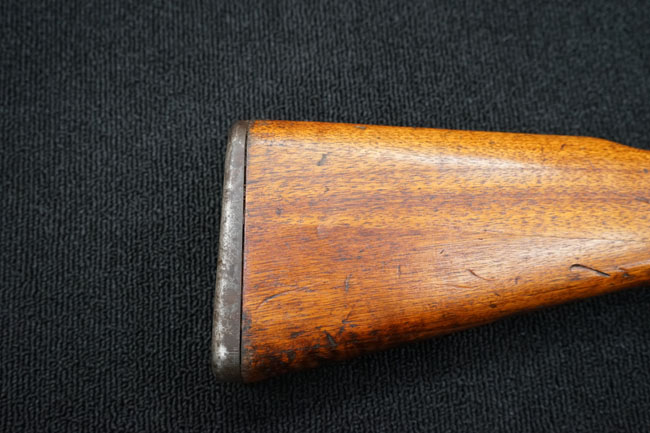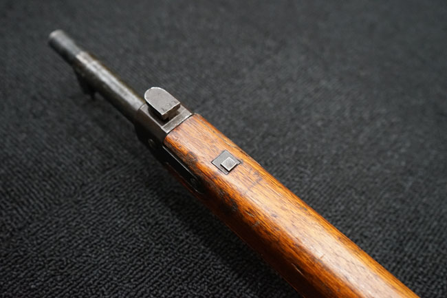 本品の金属部は全体に経年感が見受けられ薬室には擦り傷、他にも表面錆などの見受けられる箇所はあるものの、全体大きな朽ち込み等は見られず、良好な状態が保たれています。 木製銃床は、全体に打ち傷が散見される他、ストック先端右面の一部などに欠けが見られますが、大きな破損等は見られずこちらも比較的良好な状態が保たれています。 旧軍特有の銃床上下の継ぎ目については、左右側面はピッタリと合わさっておりガタつきなくしっかりとしています。 傷み易い床尾板については、全体に小傷や擦れが見受けられ、仕上げが落ちて金属の地肌が表れている箇所が見られるものの、大きな変形や朽ち込み等は見られず、銃床への取り付けもガタつきもありません。