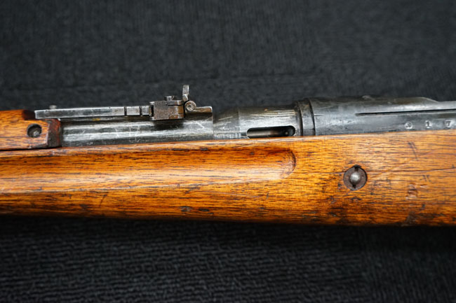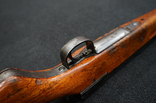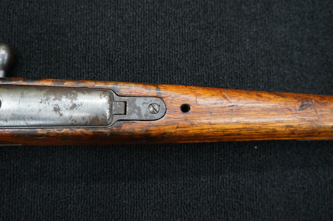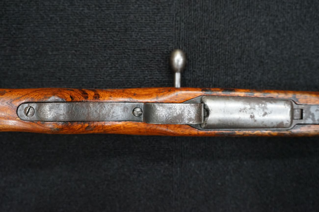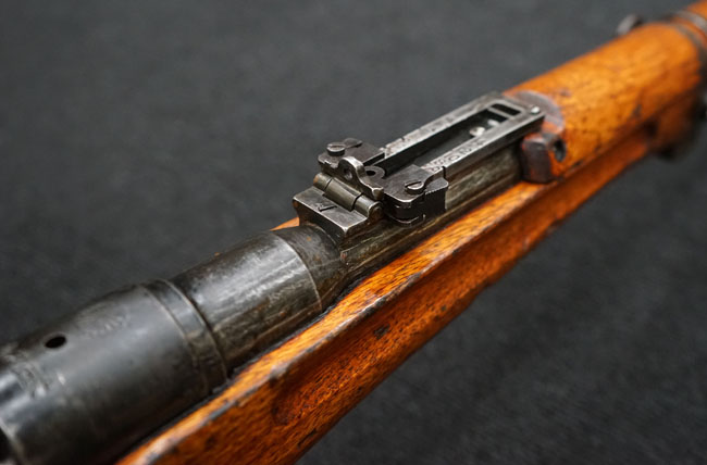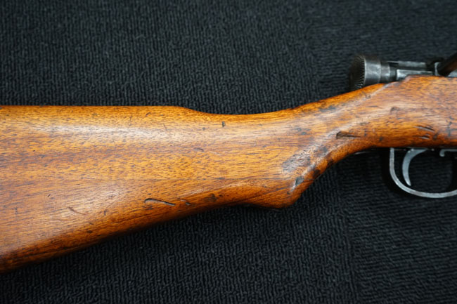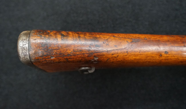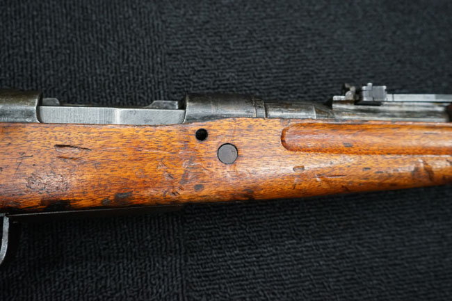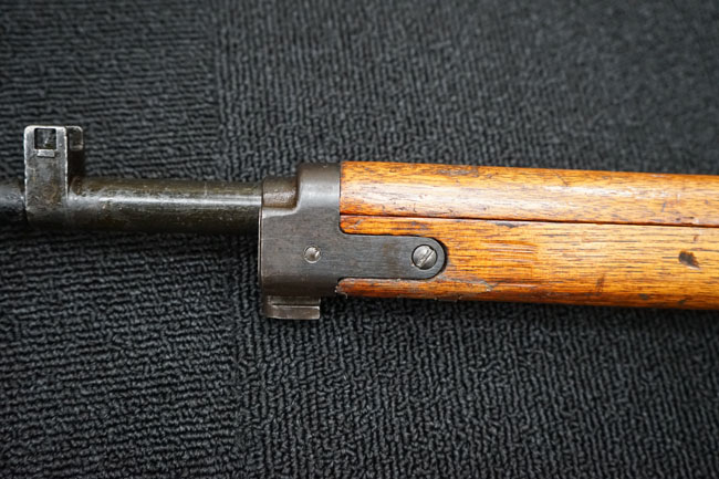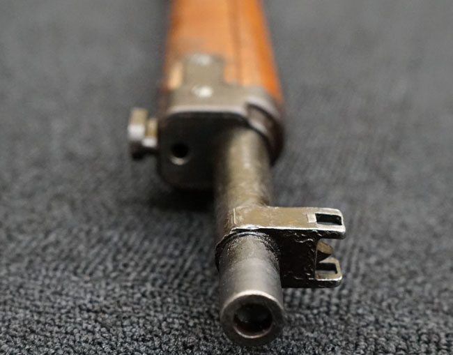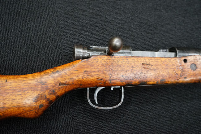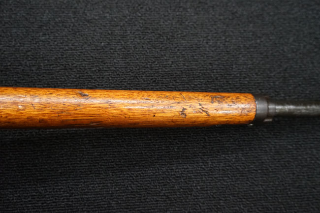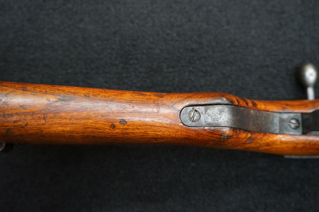 本品の金属部は全体に経年感が見受けられ薬室には擦り傷、他にも表面錆などの見受けられる箇所はあるものの、全体大きな朽ち込み等は見られず、良好な状態が保たれています。 木製銃床は、全体に打ち傷が散見される他、ストック先端右面の一部などに欠けが見られますが、大きな破損等は見られずこちらも比較的良好な状態が保たれています。 旧軍特有の銃床上下の継ぎ目については、左右側面はピッタリと合わさっておりガタつきなくしっかりとしています。 傷み易い床尾板については、全体に小傷や擦れが見受けられ、仕上げが落ちて金属の地肌が表れている箇所が見られるものの、大きな変形や朽ち込み等は見られず、銃床への取り付けもガタつきもありません。