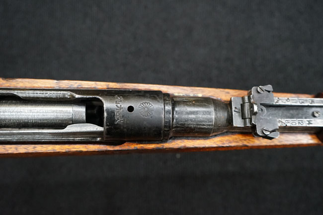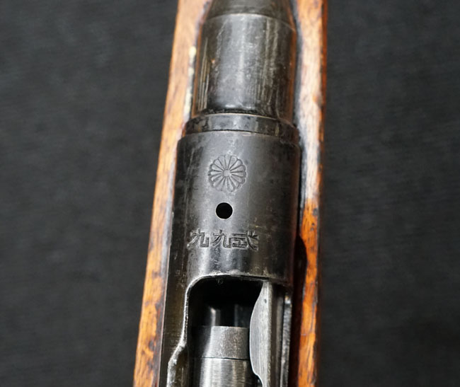 本品の機関部左側面にはシリアルNo.17032の他、仁川工廠製を示す刻印及び<メ>のシリーズ名が入っています。 下帯は一脚取り付け部のあるタイプで、照尺については高射表尺のないタイプとなっています。 槓桿は楕円形、安全子は美しいローレットが施されたものとなっています。 銃床先端のさく杖用穴については長寸のさく杖が装着が装着できる長さになっています、また床尾板はカップ型です。 薬室上面には「菊花紋章」と「九九式」の刻印が確認できます。