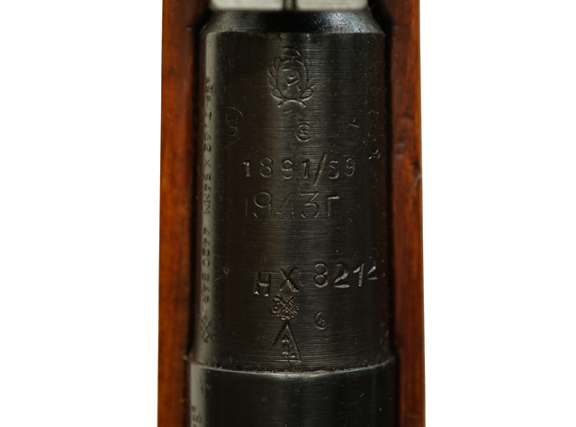 本品の薬室上面には元々のM1891 歩兵銃の刻印に加えて、「1891/59」のモデル名刻印が入っています。 薬室上面の刻印から、本品の機関部が元々1943年にイジェフスク造兵廠で製造された事が判ります。 機関部のシリアルNo.は8212で、ボルト及びバット・プレートのシリアルNo.とマッチしています。 尚、弾倉底板のみシリアルNo.が431となっています。
