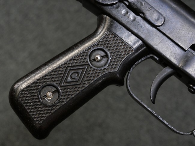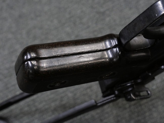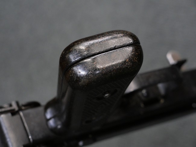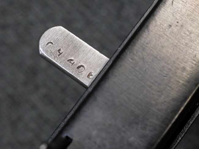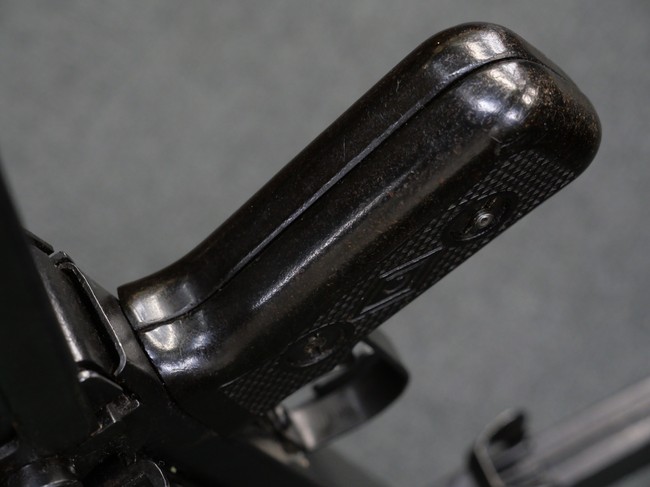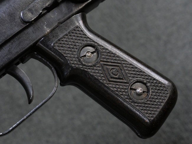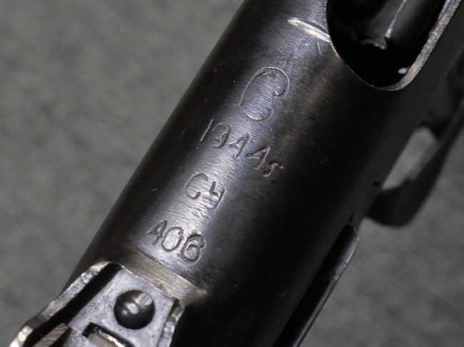 本個体のレシーバー上部には「1944」の製造年刻印とモスクワ第828工場製を示す「C」の刻印の他、シリアルNo.406の手彫り刻印が見られます。 コッキング・ハンドル裏側にもレシーバーとマッチした「406」の刻印が見られます。 グリップ・パネル両側面にはレシーバーと同様に「C」のモールドが入ってます。