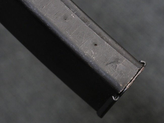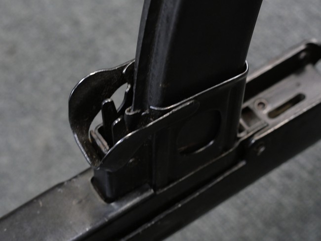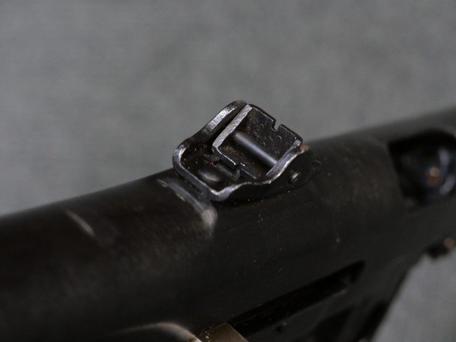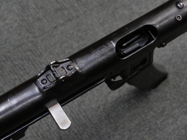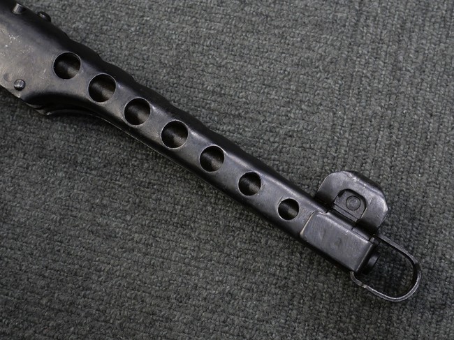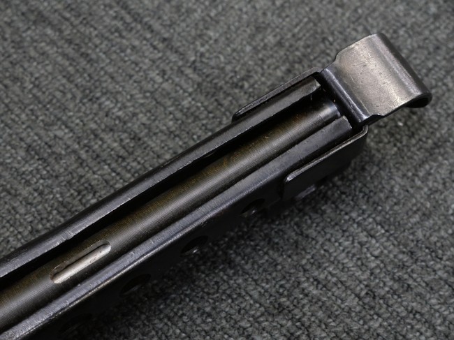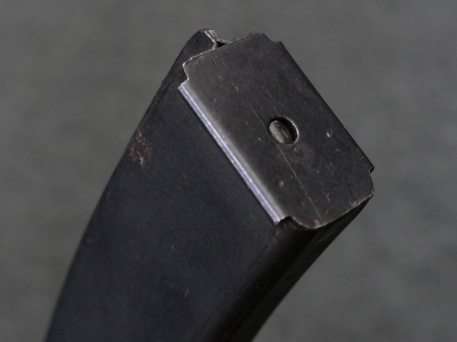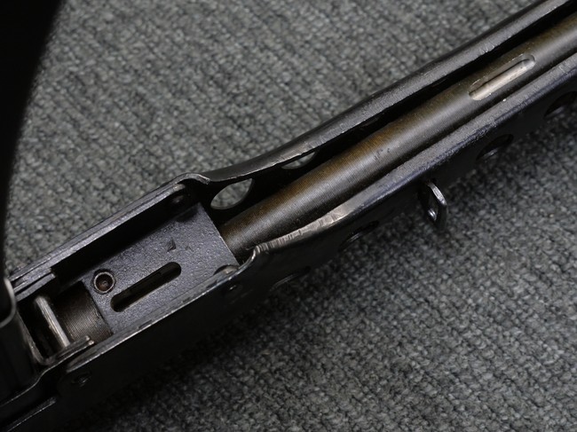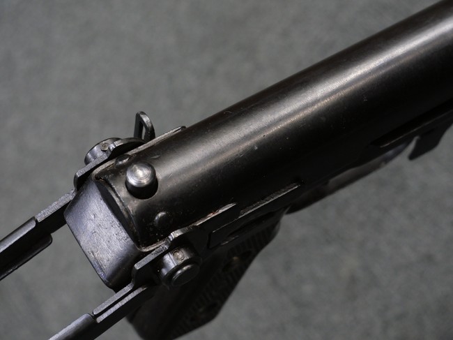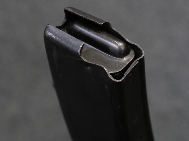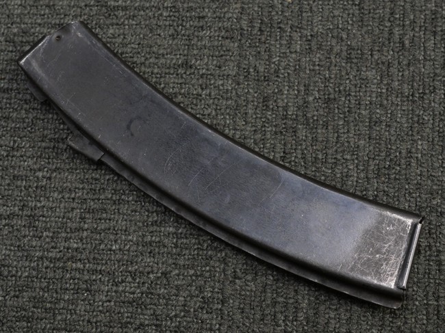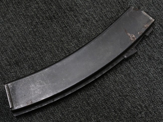 本品は全体にやや使用感が見受けられ、打ち傷や擦れが見られるものの大きな破損や変形等は見受けられず、大部分にオリジナルのブルー仕上げが残った比較的良好な状態が保たれています。 樹脂製のグリップについては僅かな打ち傷や角部に摩耗が見られますが、滑り止めのモールドも良好に残っています。 グリップ・パネルの取り付けについてもガタつきは無く良好な状態です。 折り畳みストックについても大きな破損や変形は無く、展開・収納操作もスムーズです。 ストックは展開時に若干のガタつきが見られるものの、十分許容範囲内といった程度の物です。 リア・サイトの切り替え、マガジンの着脱は問題無く行う事が可能です。 付属のマガジンは一部に表面仕上げが薄くなり金属の地肌が覗いてる箇所や表面錆痕が見られますが、目立った凹みや変形は無く、大部分にブルー仕上げが残った状態です。 尚、マガジン・スプリングは入っています。
