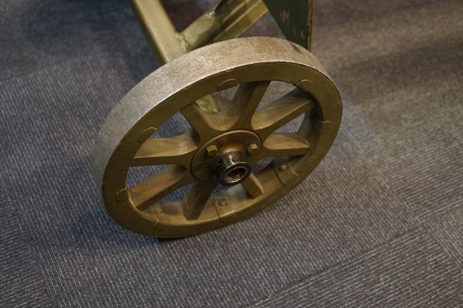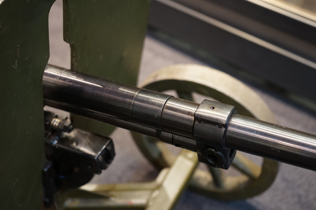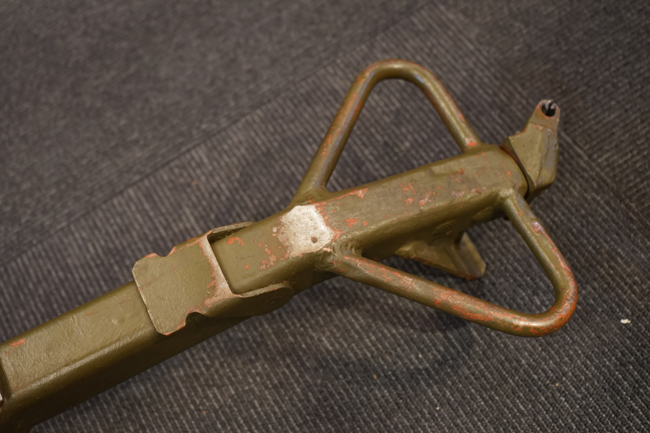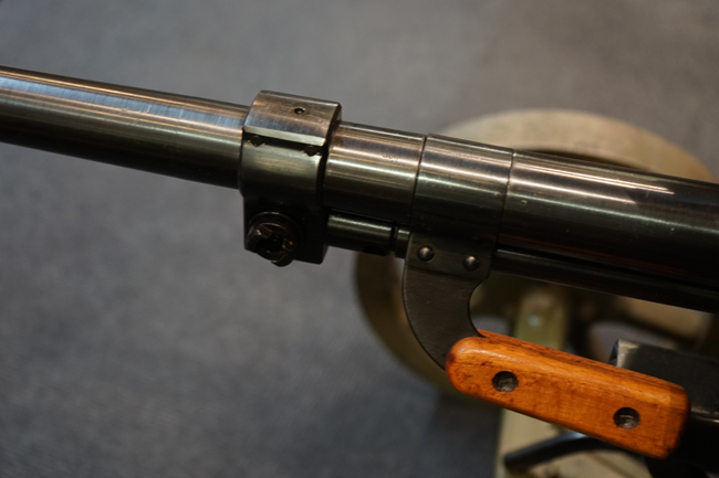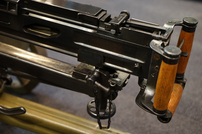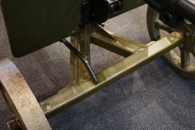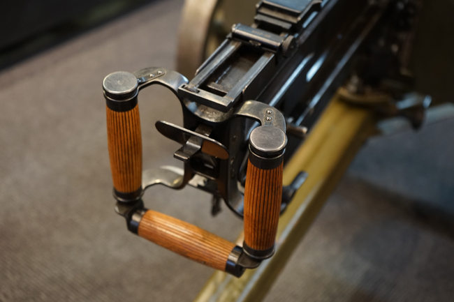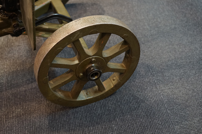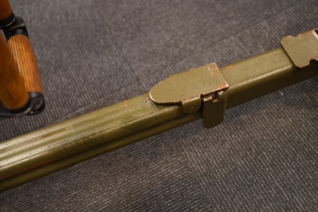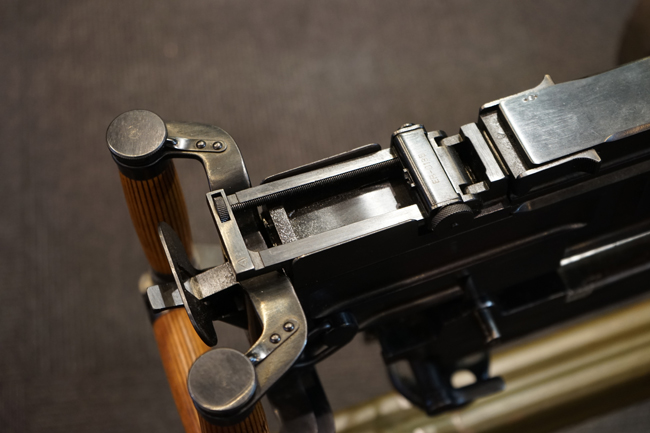 本品は全体に使用感も殆ど見受けられず、本体の金属部は僅かな保管に伴う小傷や擦れを除いて目立った錆や欠損等も見受けられず、オリジナルのブルー仕上げが全体に残った美しい状態が保たれています。 木製のスペード・グリップ及びコッキング・ハンドル、キャリング・ハンドルについても、若干の打ち傷を除いて目立った割れや欠け等は見られず、こちらもコンディションは極めて良好です。 スペード・グリップ内蔵のオイラー・ブラシについても左右とも付属しています。 リア・サイトの起倒・調整やフィード・カバー及びフィード・トレイの開閉については問題なく行う事が可能です。 付属のソコロフ銃架はシリアルNo.こそ銃本体とマッチしておりませんが、こちらも全体にOD色の仕上げが良好に残っています。 車輪部分にやや表面錆が見られますが、殆ど気にならないレベルのものです。 地上姿勢及び対空姿勢で銃本体を銃架に取り付けての展示についても問題なく、地上状態での仰俯角調整や旋回等も問題なく行う事が可能です。
