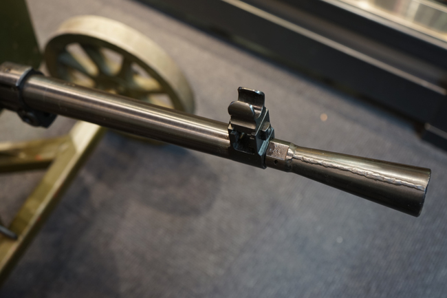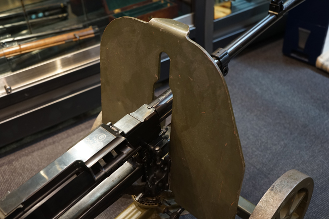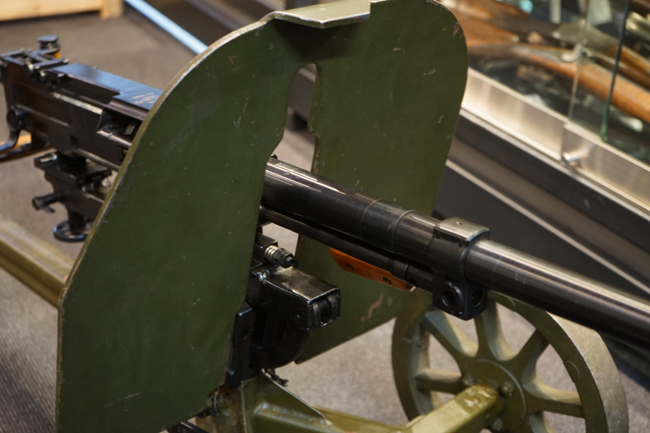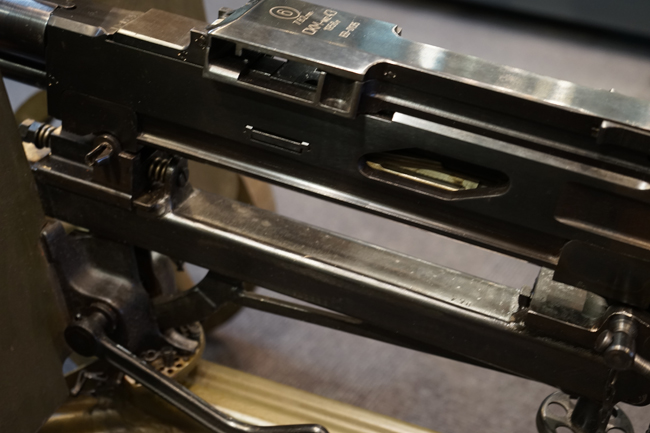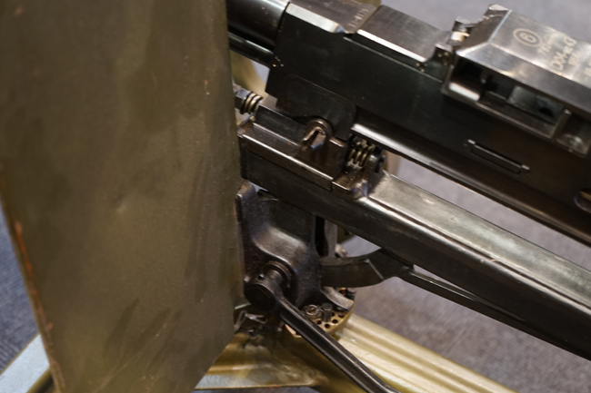 SG43は1943年にマキシムM1910の後継機としてP.M.ゴリューノフが設計し、ソ連軍に採用された重機関銃です。 水冷式であったマキシムから空冷式へと変更され、銃身交換も改良されたロック機構によって比較的容易に行う事が出来るようになりました。 通常は防弾板と車輪のついたT字型のM1943マウントに搭載して運用され、その為の口径の割には大型の重機関銃に見えます。 SG43用のマウントは、ソコロフ・マウントと呼ばれるマキシム用を改良したモデルになっており、追加部品を使用することなく対空射撃姿勢を取る事が可能です。