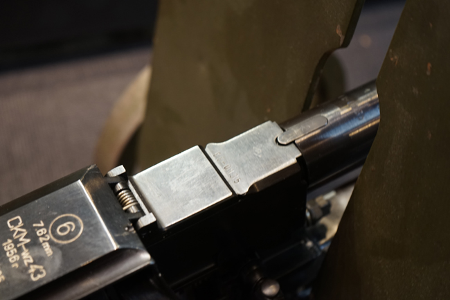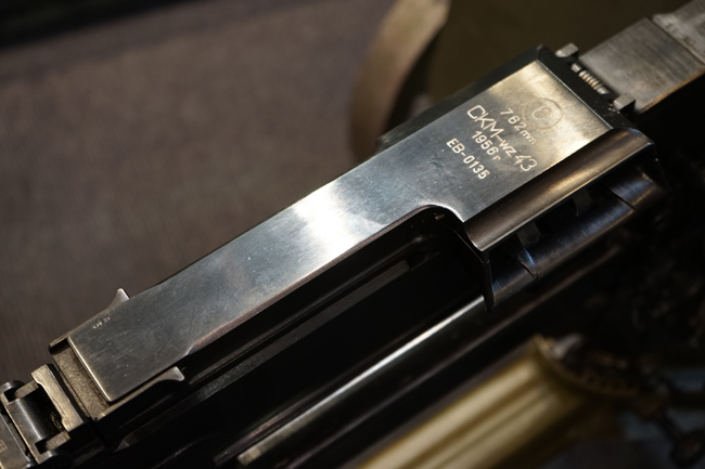 本品のシリアルNo.はEB0135で、レシーバー、銃身、フィード・カバー、フィード・トレイ、ボルト、リア・サイト、スペード・グリップ基部でマッチしています。 フィード・カバー上面にはシリアルNo.及び「7,62mm CKM-wz43」のモデル名の他、1956年製を示す刻印及びポーランド ポズナンのHCP社(H.ツェルギスキ・ポズナン社) を示す円形の中に数字の「6」が入ったマークが打刻されています。