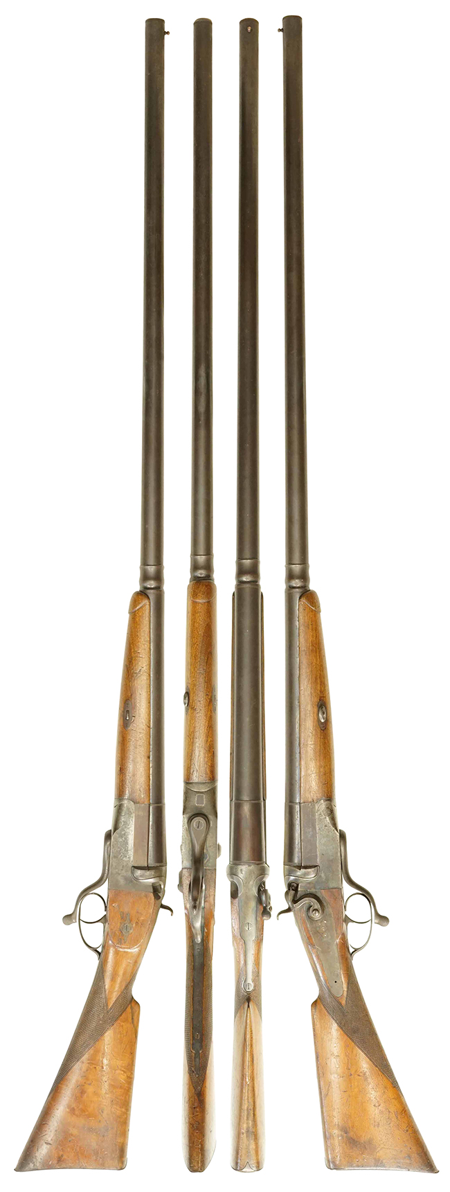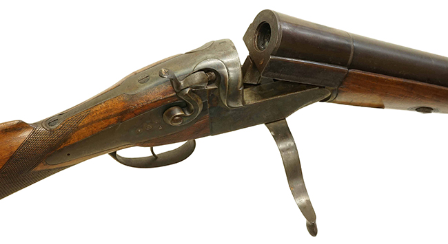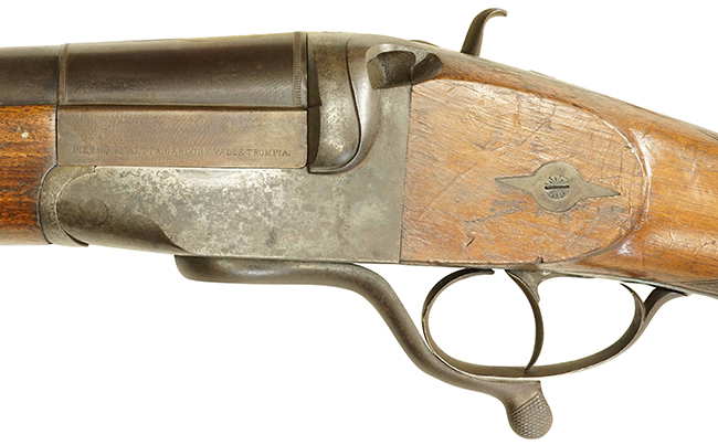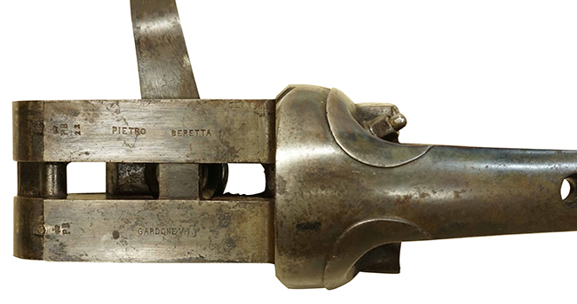 本品は19世紀初頭から20世紀初頭に登場したパントガン(Punt gun)である可能性もあります。 パントガンは商業狩猟(Commercial hunters)のために使われた大型の散弾銃で、1度の射撃で大量の水鳥を撃ち落とすために開発されました。 第一次大戦で散弾銃の使用が効果的であったことから防御陣地に配備されました。 本品はイタリアのピエトロ・ベレッタ社製で、単発式のブレイク・オープン型散弾銃をスケール・アップした構造になっています。 イタリアではパントガンを使用した商業狩猟は行われなかったので軍用として用いられたと思われます。 センター・ファイア(通常Wall gunはパーカッションまで)の4ボアの散弾を用いたと思われます。 このような品はヨーロッパでは非常に珍しく、特に本品はイタリアの老舗メーカーであるP. ベレッタ社製であることも大きな魅力です。(MM)