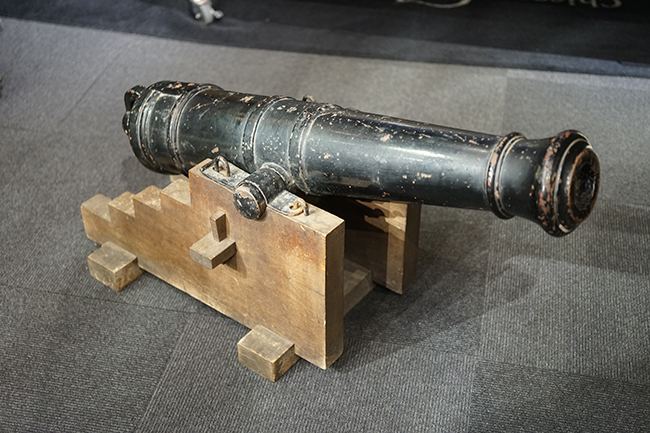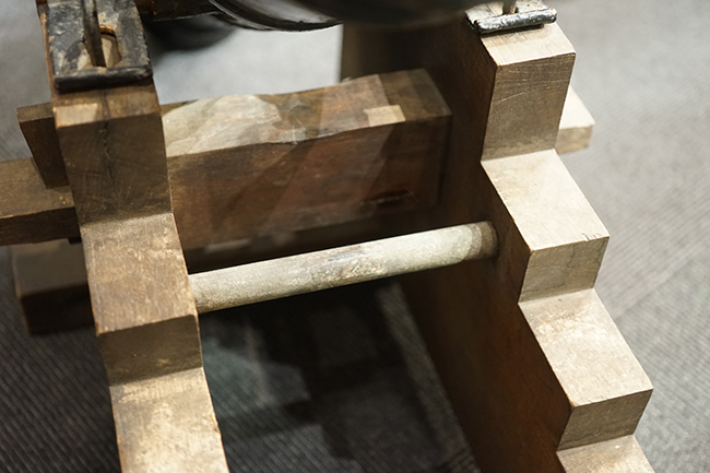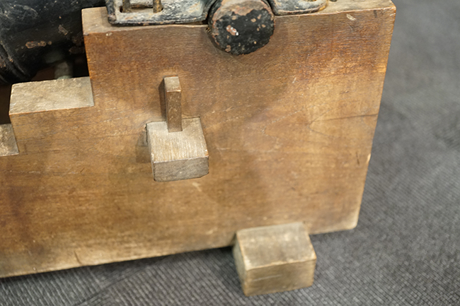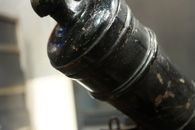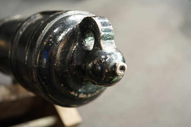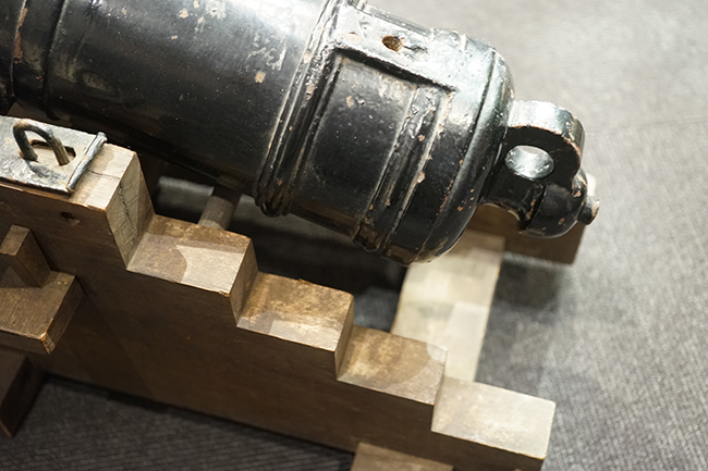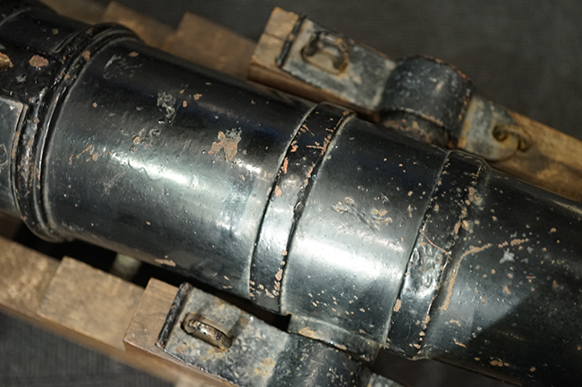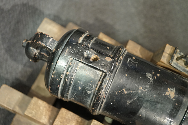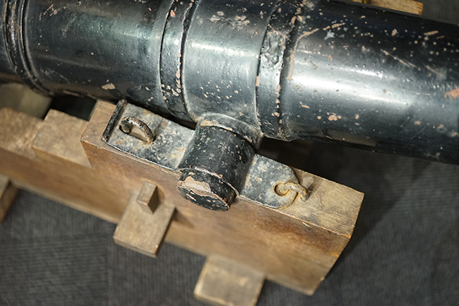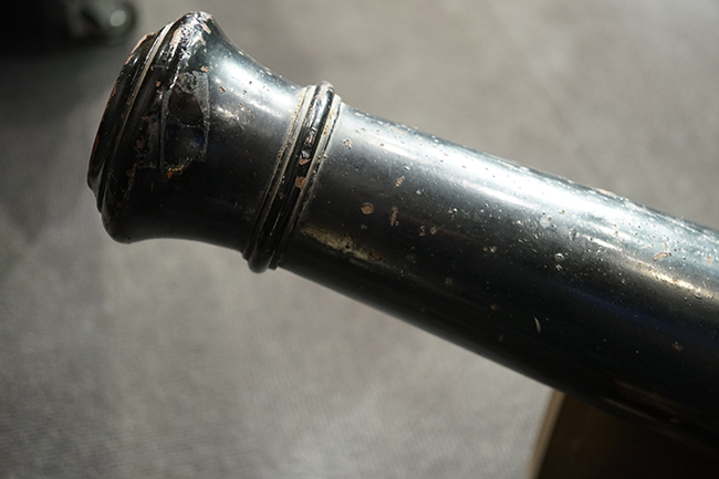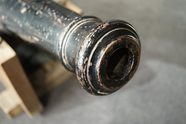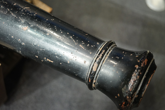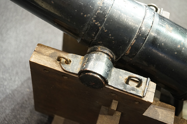 本品は製造された時代を考慮すれば総じて良好な状態が保たれています。 鉄部表面は大部分が黒色の塗料により保護されています。 尚、砲身には製造メーカーや製造年を示す刻印等は現状確認出来ません。 砲身表面の塗膜は一部に剥落が見受けられ、塗膜剥落箇所にやや表面錆が表れていますが、現状大きな腐食等も見受けられず、概ねしっかりとした状態が保たれています。 砲身内はやや表面錆や朽ち込みが見受けられるものの、砲口から砲身後部まで完全に抜けて (通って) おり、火穴も抜けています。 付属の木製台座は時代が下りますが適度に時代感が付いており、砲身と合わせた際の雰囲気もマッチしています。 台座は重量のある砲身を支えられるだけのしっかりとした作りとなっており、台座に載せた状態で砲身を上下に動かす事が可能です。