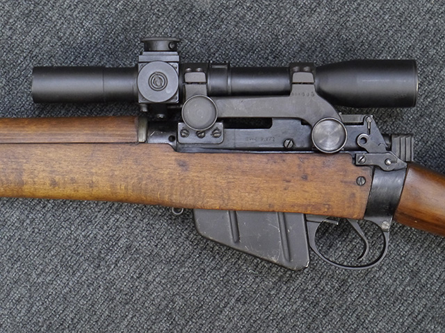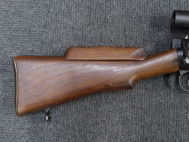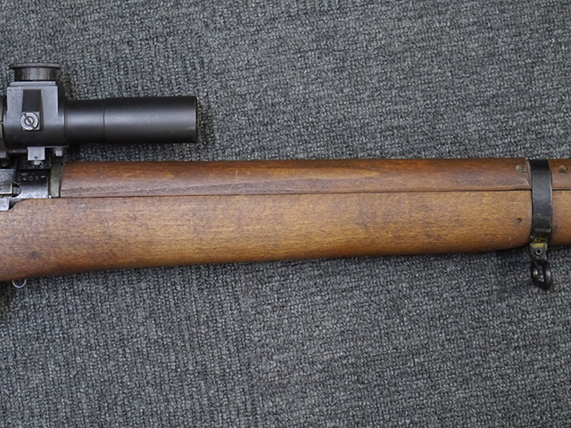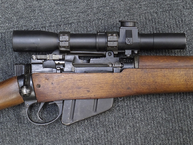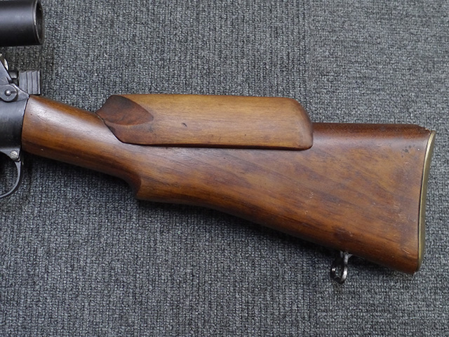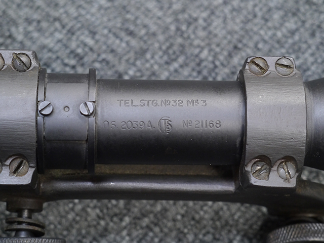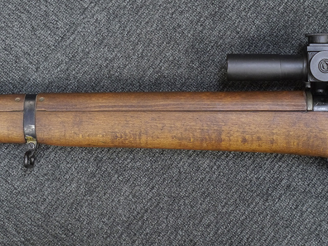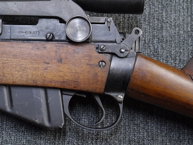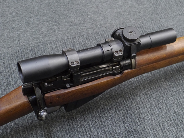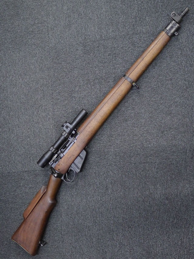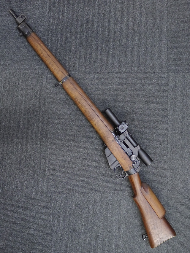 No.4 Mk 1 (T) は1942年に英軍に制式採用された狙撃銃で、No.4 Mk I小銃の中から精度の良い個体を選び、3.5倍率のNo.32スコープ及びその取り付け用ブラケットや木製チーク・ピースを取り付けたモデルです。 No.32スコープは、1942年に採用されたMk 1から1944年のMk 3まで各種バリエーションが存在します。 No.32 Mk 3はMk 1やMk 2と異なり、ウィンデージ・ノブ及びエレベーション・ノブの位置が前後にオフセットされていないのが外観上の特徴です。 尚、元々No.4 Mk I小銃のリア・サイトに設けられていたピープ・サイトは、スコープに干渉しないよう削り落とされています。 No.4 Mk I小銃から本銃への改修は、英国内では主にHolland & Holland社で行われた他、カナダのオンタリオ州ロング・ブランチにあったSmall Arms Limited及びCanadian Arsenals Limitedでも製造が行われ、それらの大半は英軍用として供給されました。 No.4 Mk I (T) 狙撃銃は、その後7,62mm×51 NATO弾を使用出来るように同銃を改修したL42A1狙撃銃が制式となった1970年代初頭まで第一線で使用されました。 約1,080挺のNo.4 Mk I (T) 及びNo. 4 Mk. I* (T) 狙撃銃がL42A1に改修されたと言われています。 (KK)