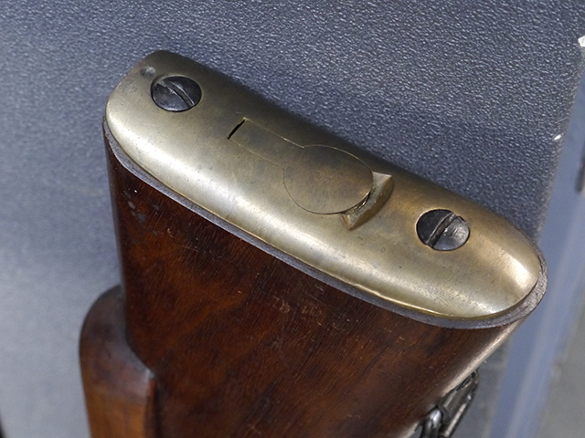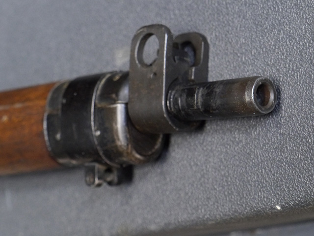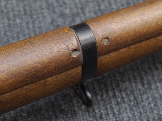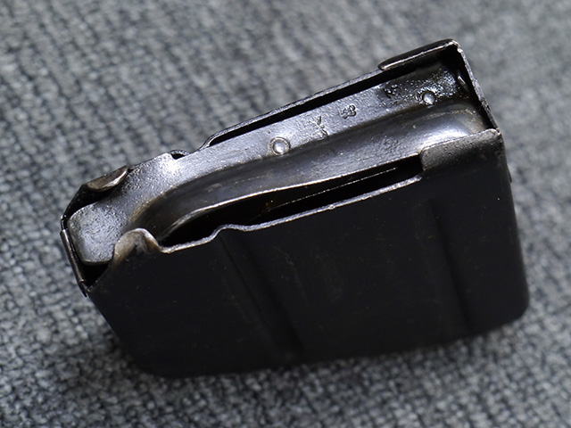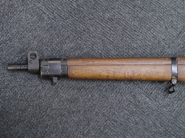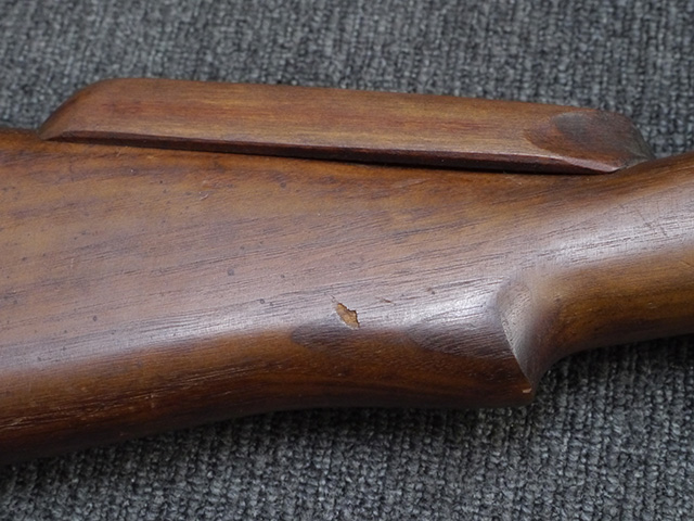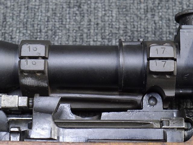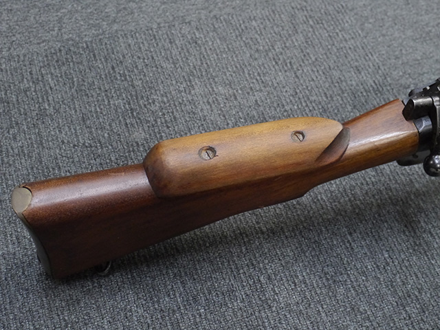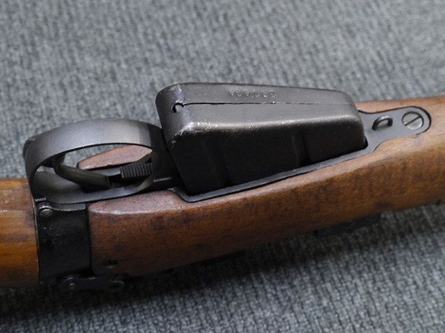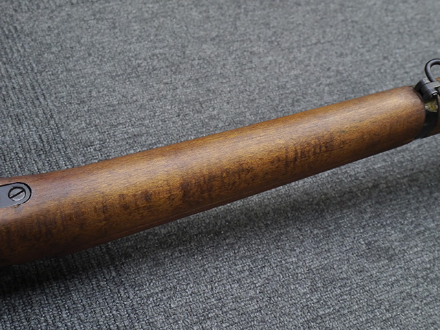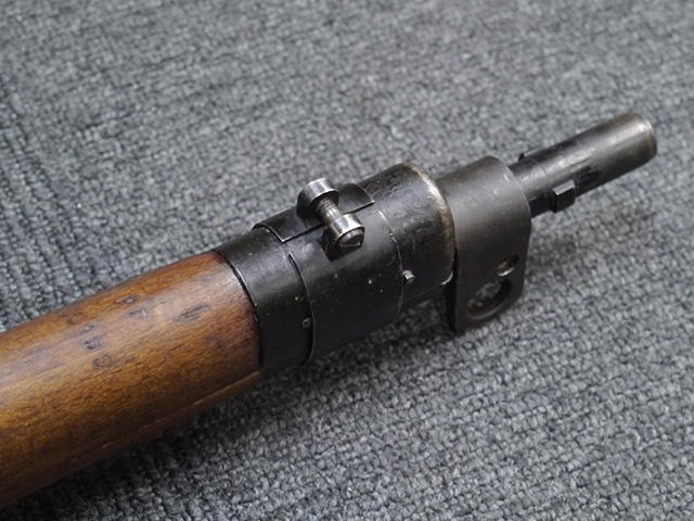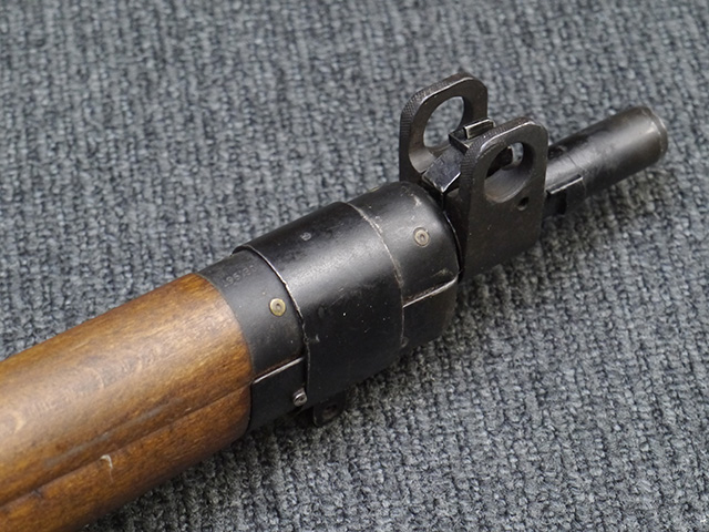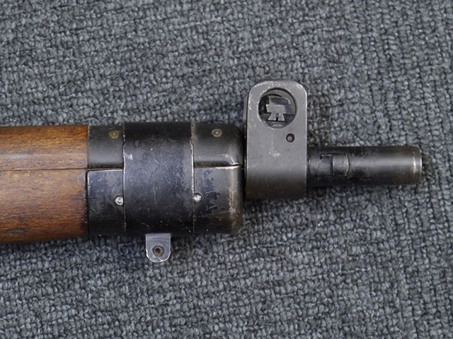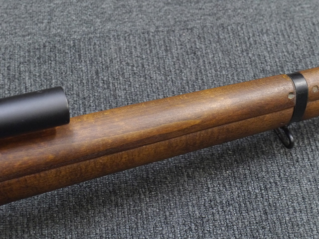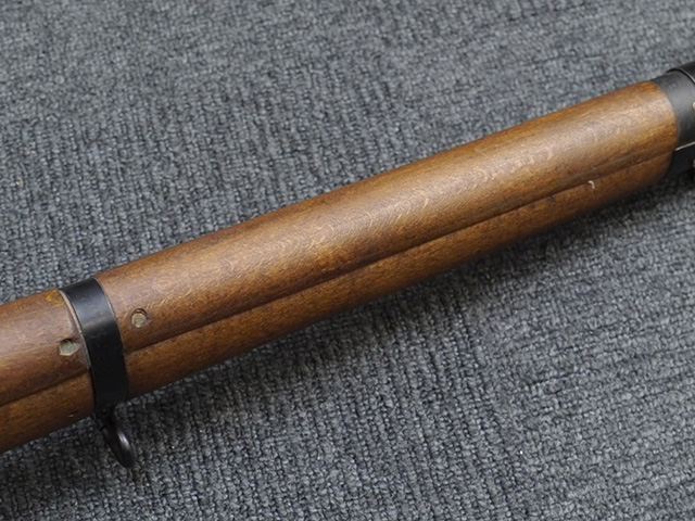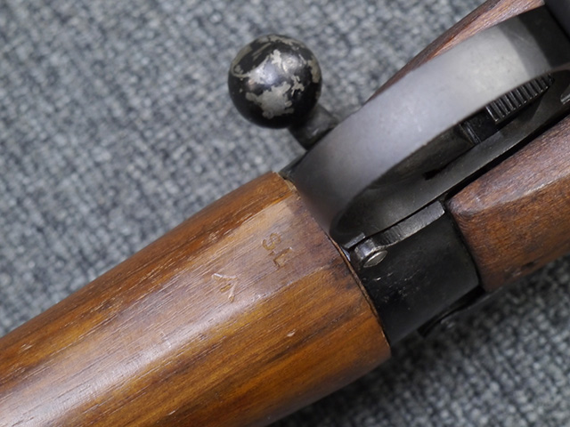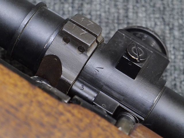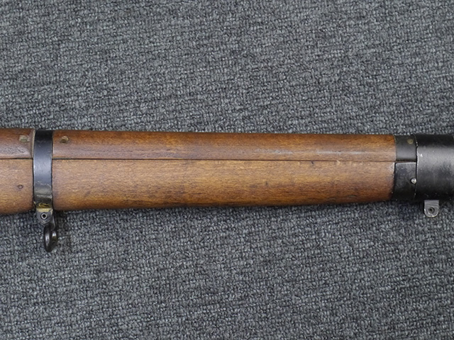 本品は狙撃銃に改修されてから殆ど使用されていないものと思われ、黒色焼付塗装仕上げの金属部については、若干の小傷や擦れの他、ボルト・ハンドルなど一部に塗装の剥落が見られるものの、目立った欠損等は見受けられず、概ね良好な状態が保たれています。 木部についても同様にコンディションは良好で、ストック、フォア・エンド、ハンドガードといった各部の色合いもほぼ揃っています。 木部は保管に伴う若干の打ち傷やストックの角などに極小の殆ど気にならない程度の欠けが見られる他は、これ以上は望めない良好な状態が保たれています。 真鍮製のバット・プレートについても打ち傷や腐食等は殆ど見られず、ストック内コンパートメントの蓋の開閉も問題なく行う事が可能です。 付属のNo.32スコープは艶消しの黒色塗装仕上げとなっており、外装は傷なども最小限です。 視野内はやや曇りや塵の混入は見られますが、コンディションは概ね良好です。 銃本体への取り付けもスムーズで、ガタつき無くタイトに固定されます。 リア・サイトの起倒・調整やマガジンの着脱については問題なく行う事が可能です。 付属のマガジンについては若干の小傷や擦れは見られますが、目立った凹みや変形も見られず、比較的しっかりとした状態が保たれています。 尚、マガジン・スプリングは入っています。