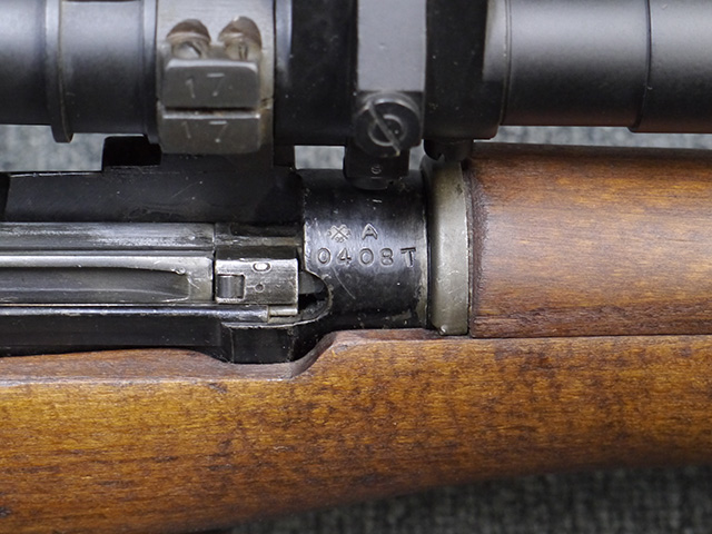 本品のバット・ソケット左側面には「F.R. 1962 R.F.I」の刻印が見られる事から、英国で製造されたNo.4 MkI (T) 狙撃銃の銃本体を1962年にインド イシャポール造兵廠にてNo.4 MKI/2仕様に改修した事が判ります。 薬室上部にはシリアル#A0408Tとイシャポール造兵廠のプルーフ・マークが打刻されており、機関部左側面にはモデル名を示す「No4 MK.I/2」が打刻されています。 また、ストック基部にはブロード・アロー刻印及び英国のサブ・コントラクターSykes Ltd.を表す「S.L」の刻印が見られます。 シリアルNo.は機関部、ボルト・ハンドルでマッチしています。 付属のNo.32 Mk3サイト (スコープ) には、「TEL. STG. No.32 MK3 OS.2039A No 21168」の刻印及び英国ヨークのCooke, Troughton & Simms社を示す「CTS」のロゴの他、ブロード・アロー刻印が入っています。