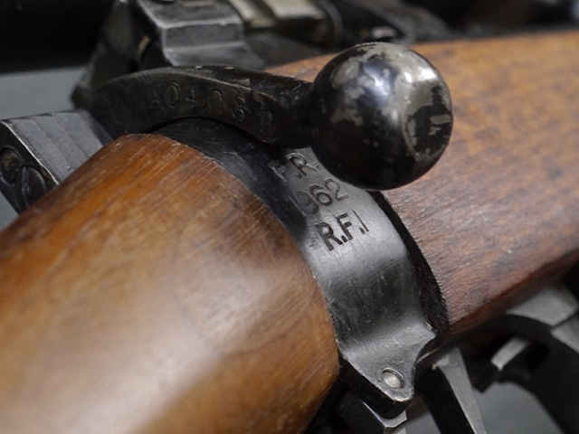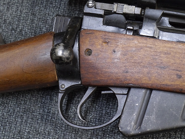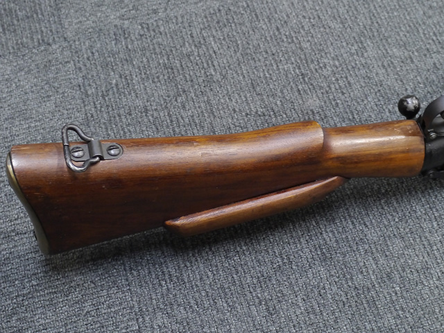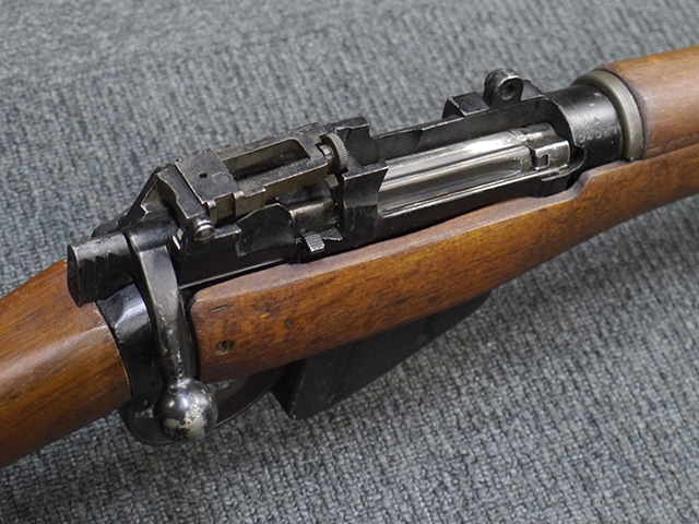 リー・エンフィールド No.4 小銃は、SMLE No.1小銃の改良型で、第二次世界大戦中期以降のイギリス軍主力小銃です。 ダンケルク撤退で小銃不足となった1941年から大量生産が開始されました。 リー・エンフィールド小銃はボルトのロッキング・ラグが同時期の他のボルト・アクション・ライフルと比較して後部に配置されていた為、ボルト・ストロークが短くなり、より短時間で連射する事が可能でした。 No.4 小銃のSMLE No.1小銃からの大きな改良点は、リア・サイトが機関部後部に移り、ストックより僅かに突出した銃身先端にスパイク・バヨネットを取り付けるようになった点です。