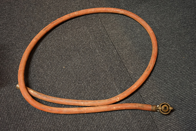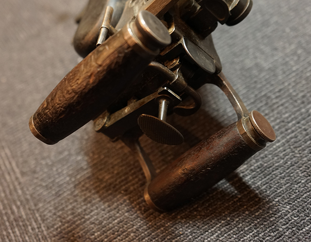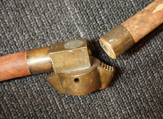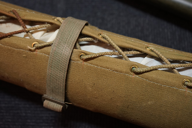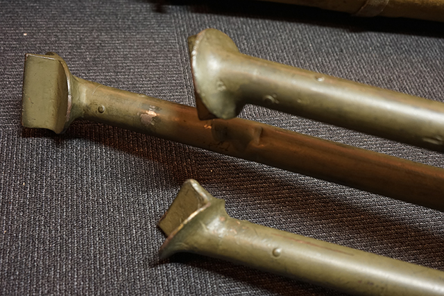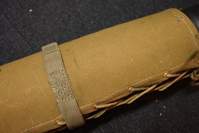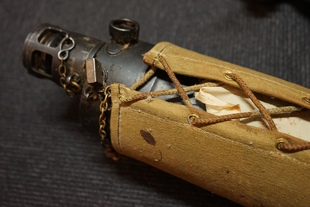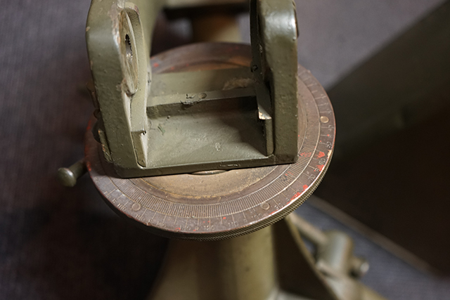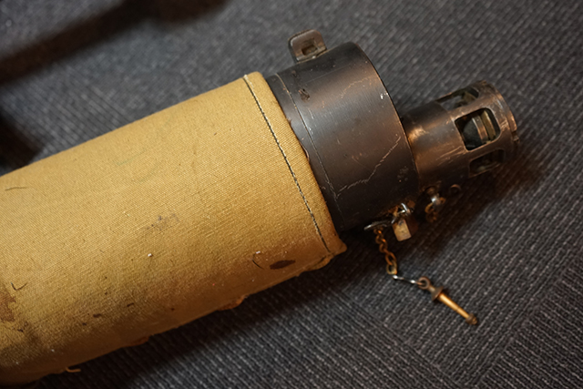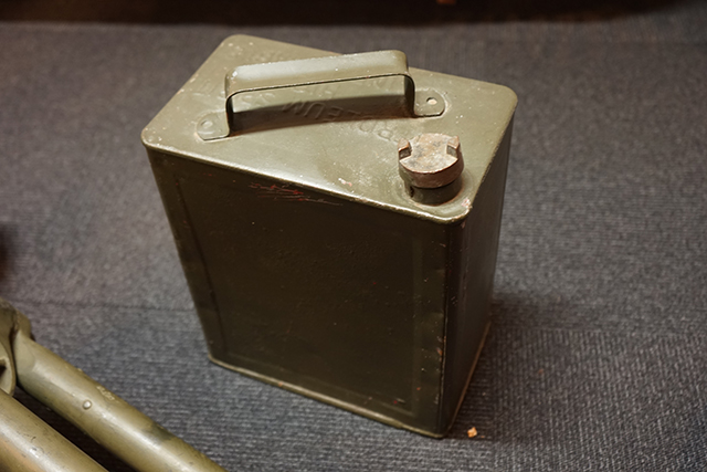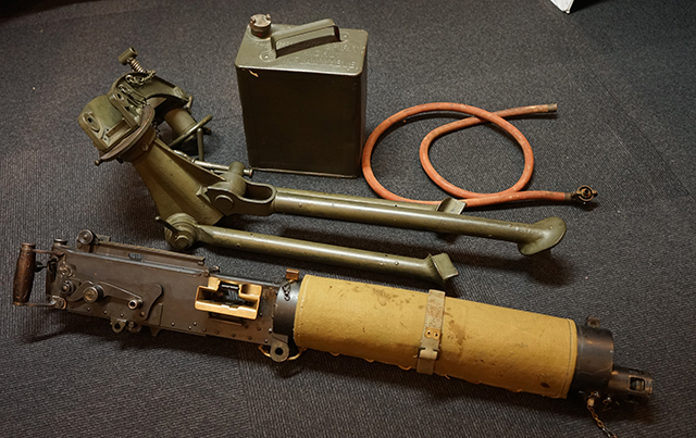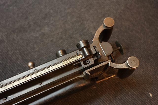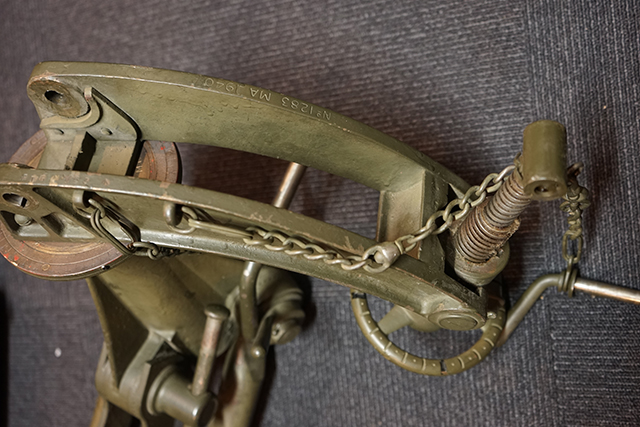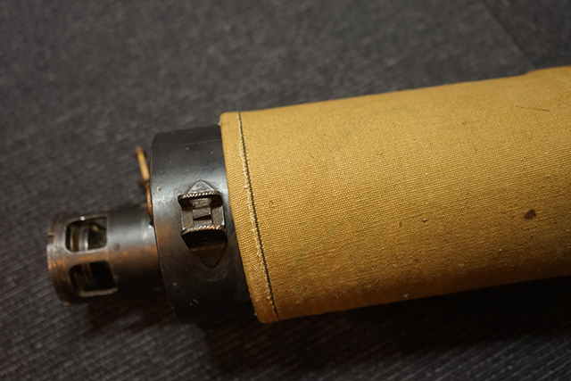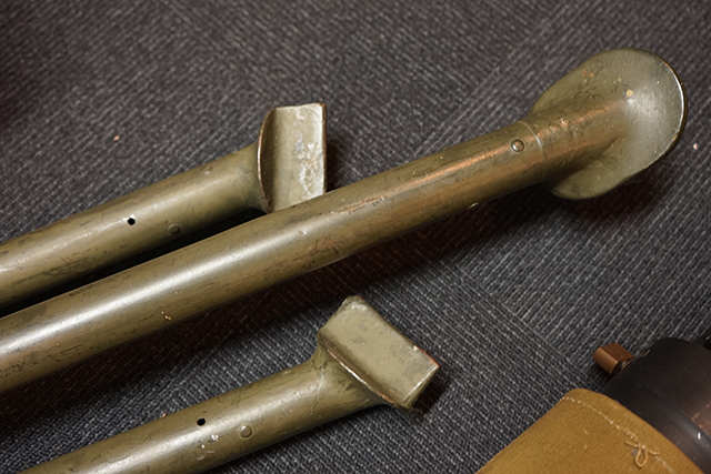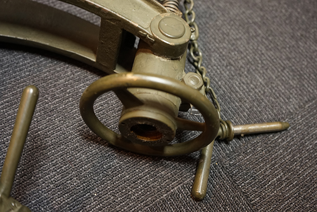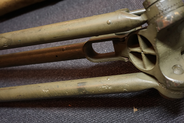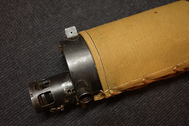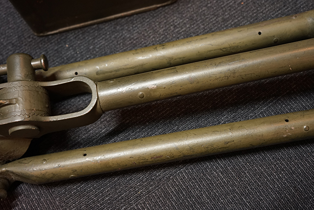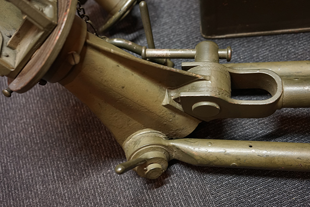 本品は全体に適度な使用感が見受けられ、レシーバー等の金属部についてはやや小傷や擦れは見受けられるものの、目立った欠損等は見受けられず、概ねしっかりとした状態が保たれています。 水冷ジャケットについてはジャケット・カバーに覆われていたためか、目立った傷や凹み等は見受けられず、良好な状態が保たれています。 真鍮製のフィード・トレイやダイヤル・サイト・ブラケットについても目立った破損や腐食等は見受けられません。 木製スペード・グリップについては機関部に比べてやや使用感が見られ、全体に打ち傷が見られる他、一部にひびが見られますが、現状強度的にはしっかりとした状態が保たれています。 スペード・グリップ内のオイラー・ブラシについても残っていますが、蓋とブラシの組み付けが緩くなっており、右側の蓋のゴム製ガスケットが欠品しています。 水冷ジャケットについては、水冷ホース接続部のコルク栓のコルク部分が欠品していますが、それ以外の各栓は残っています。 リア・サイトの起倒や調整については問題なく行う事が可能です。 付属の三脚についても本体と同様に概ね良好なコンディションが保たれています。 三脚のマウント部には「MOUNT. TRIPOD. M.G. MK.IV.」のモデル名の他、シリアルNo.1283や1940年にオーストラリアのリスゴー造兵廠 (MA=Munitions Australia) で製造された事を示す「MA 1940」の刻印が入っています。 また、「FTR MA/53」の刻印が入っている事から、1953年にリスゴー造兵廠にて各部品の強度検査や摩耗した部品等の正規の交換修理であるFTR (Factory Through Repair) を受けた事も窺えます。 三脚のマウント部については目立った腐食や変形等も見られず、銃の取り付けについては問題なく行う事が可能です。 また、脚についても一部に塗装の剥落や若干の朽ち込み痕は見られるものの、大部分に暗緑色の塗装が残った良好な状態が保たれています。 水冷ホース及び水冷缶が付属致します。