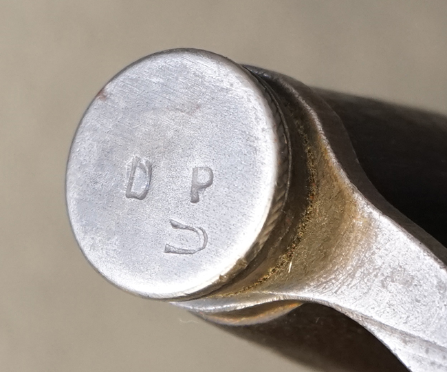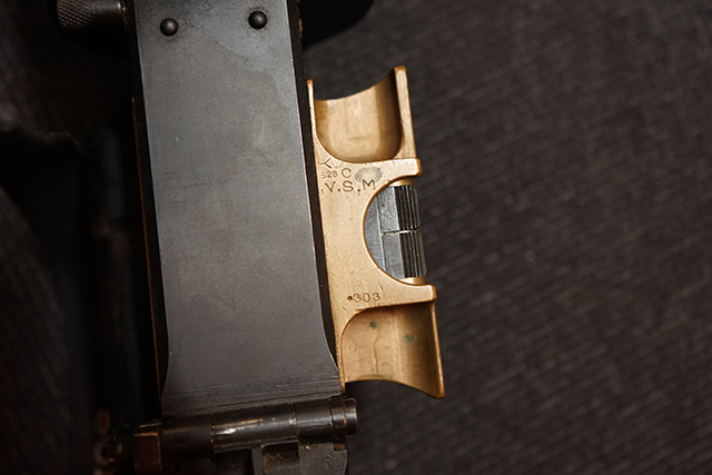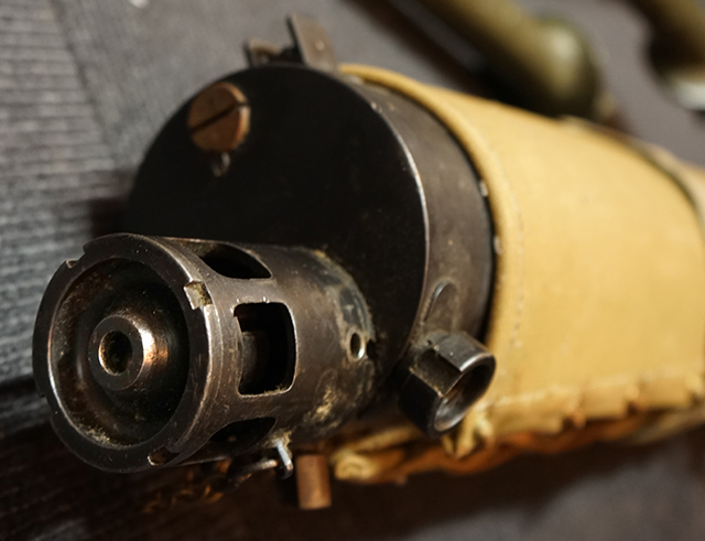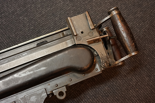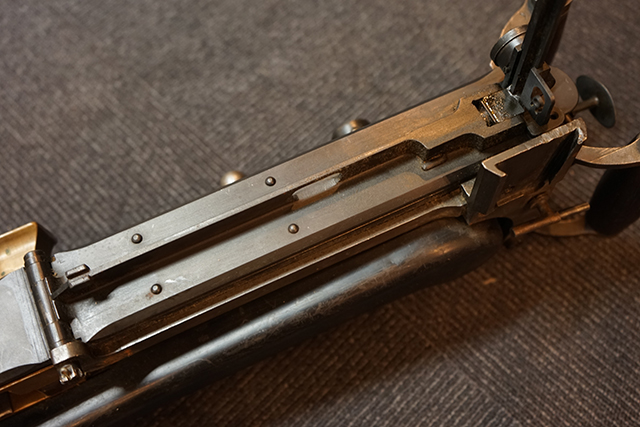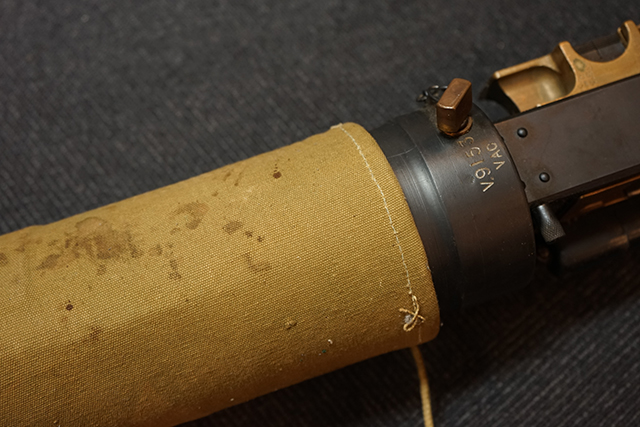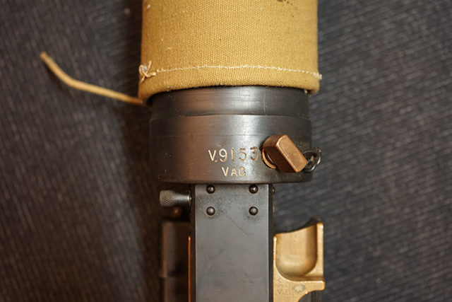 本品のバレル・ジャケット基部上面にはV9153のシリアルNo.が入っています。 また、バレル・ジャケット基部を始め、各部にビッカース・アームストロング・クレイフォード (Vickers Armstrong Crayford) を示す「VAC」の刻印が確認できます。 また、真鍮製のフィード・トレイやロック (ボルト相当部) にはVickers, Sons & Maximを示す「V.S.M」の刻印も見られます。 各部のシリアルNo.は、コッキング・ハンドルに513、レシーバー下面にC110となっています。 スペード・グリップ左側のオイラーの蓋部分に訓練用 (Drill Purpose) を意味するDPの刻印が入っています。