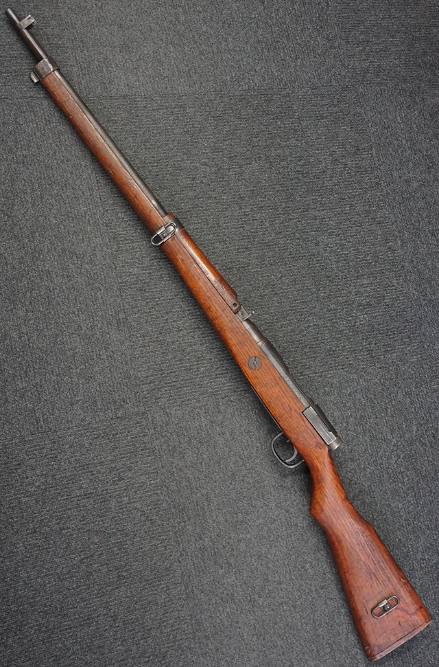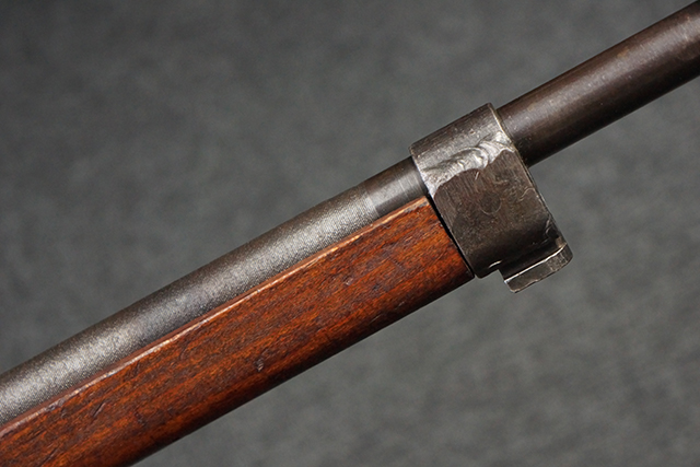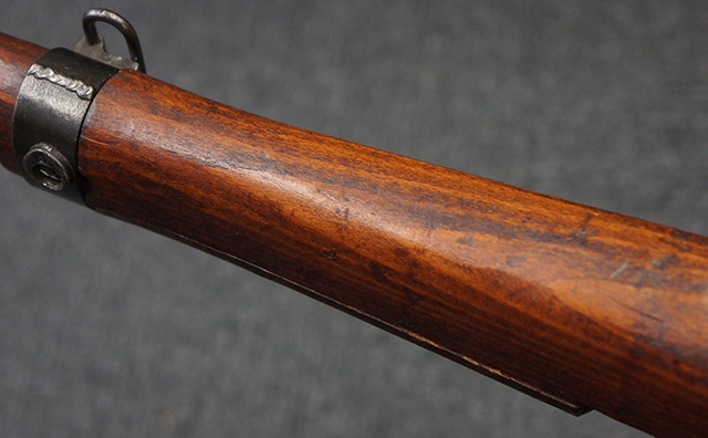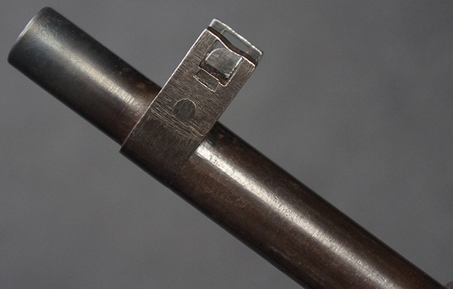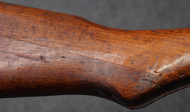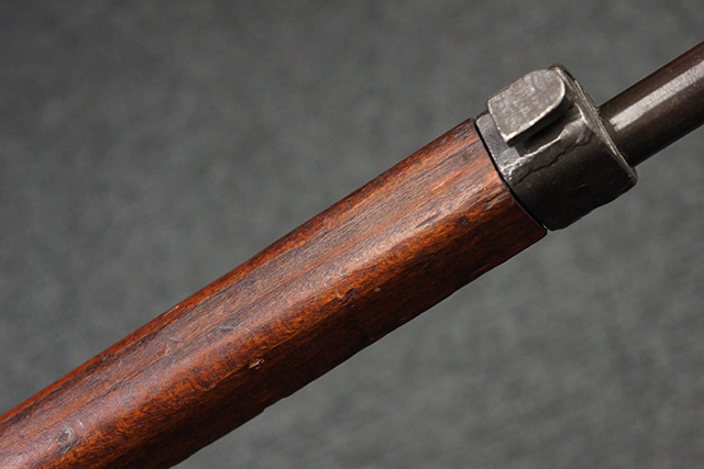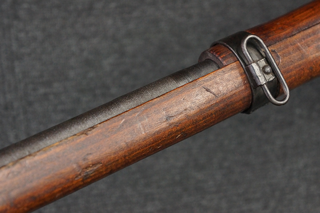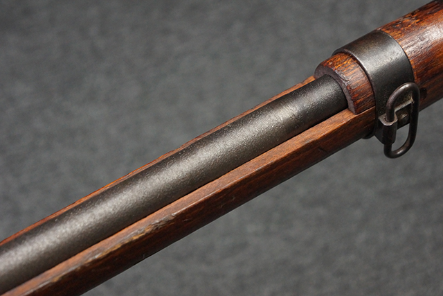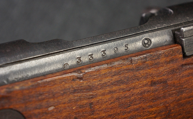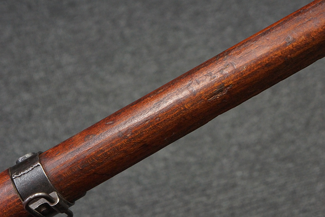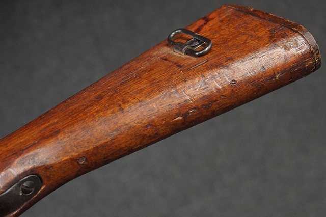 本品は九九式短小銃 末期型 (名古屋製) です。 名古屋工廠は他の工廠と比べ末期型への移行が早く、12シリーズの生産の内末期型は約4.5シリーズ分あり、照尺などにもバリエーションが有ります。 末期型では基本的に薬室上部の「九九式」の刻印は省略されており、本品も元々「九九式」の刻印が省略されたタイプです。 本品は照尺がピープ・タイプの簡易型となっていますが、照星のガードは省略されていないタイプとなっています。 床尾板については木製となっており、床尾負革止はネジ1本のみで固定されたタイプとなっています。 槓桿 (ボルト・ハンドル) は円筒形で、安全子は粗い溶接痕の有るタイプとなっています。 本品の機関部左側面にはシリアルNo.の他、名古屋工廠を示す刻印や<チ>のシリーズ名が打刻されています。 <チ>シリーズは1944年 (昭和19年) の6月から9月頃にかけて製造されました。 銃床についても名古屋工廠製で、銃床下部には名古屋工廠製を示す「名」及び「リ」の刻印が確認できます。 その他、用心金や照尺基部にも「リ」の刻印が小さく入っており、槓桿や安全子にも名古屋工廠の検査刻印である「W」の刻印が確認できるなど、総じてオリジナル度の高い品です。 尚、菊花紋章については削られています。