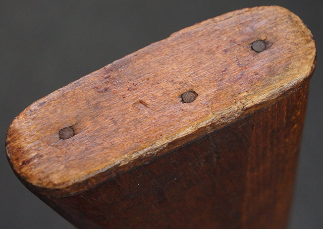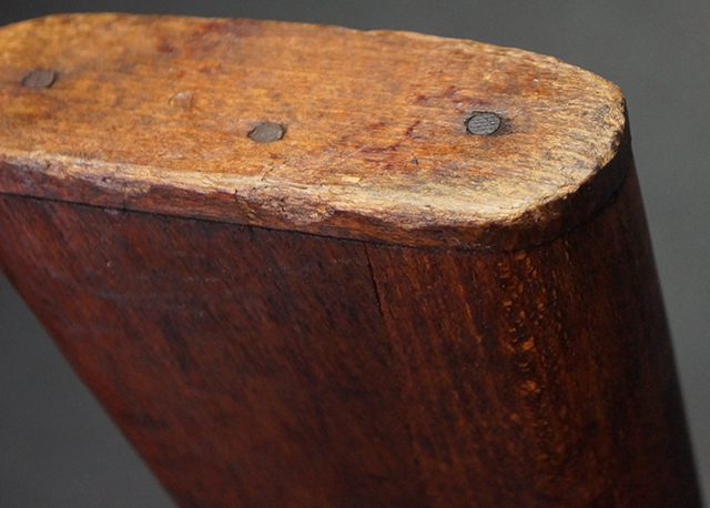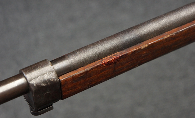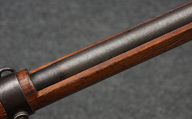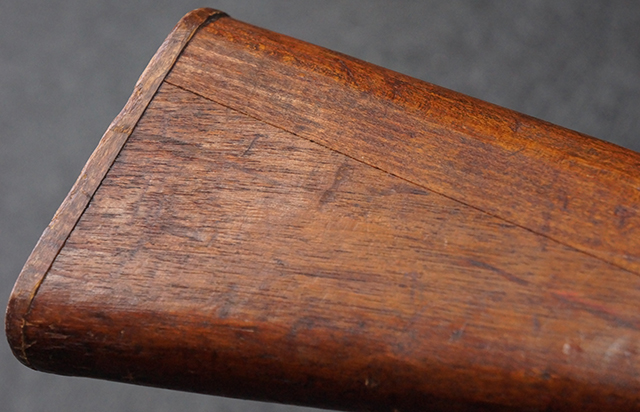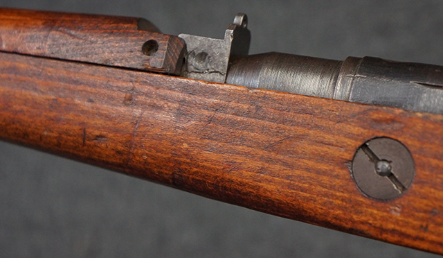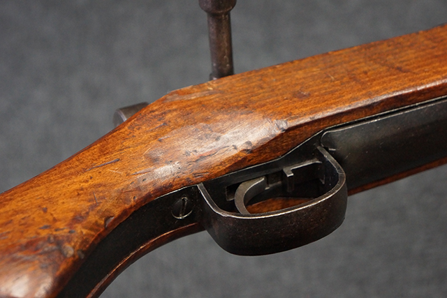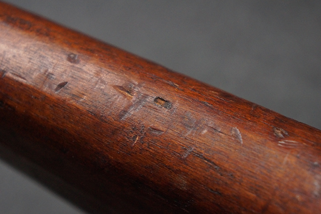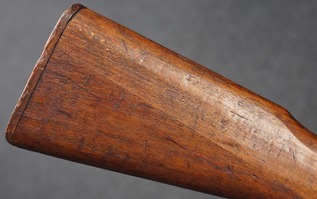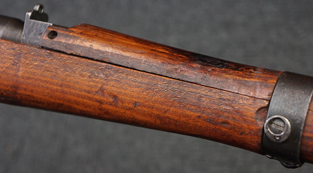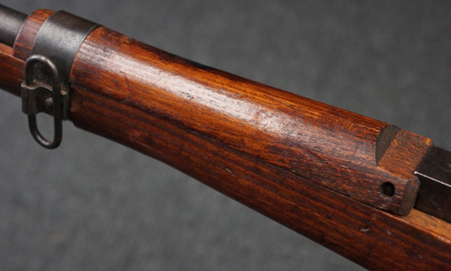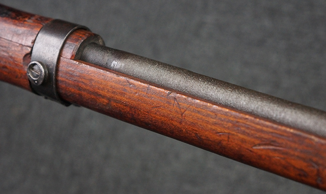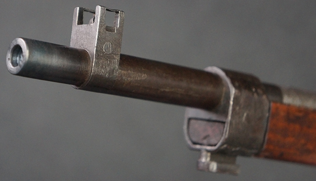本品は九九式短小銃 末期型 (名古屋製) です。 名古屋工廠は他の工廠と比べ末期型への移行が早く、12シリーズの生産の内末期型は約4.5シリーズ分あり、照尺などにもバリエーションが有ります。 末期型では基本的に薬室上部の「九九式」の刻印は省略されており、本品も元々「九九式」の刻印が省略されたタイプです。 本品は照尺がピープ・タイプの簡易型となっていますが、照星のガードは省略されていないタイプとなっています。 床尾板については木製となっており、床尾負革止はネジ1本のみで固定されたタイプとなっています。 槓桿 (ボルト・ハンドル) は円筒形で、安全子は粗い溶接痕の有るタイプとなっています。 本品の機関部左側面にはシリアルNo.の他、名古屋工廠を示す刻印や<チ>のシリーズ名が打刻されています。 <チ>シリーズは1944年 (昭和19年) の6月から9月頃にかけて製造されました。 銃床についても名古屋工廠製で、銃床下部には名古屋工廠製を示す「名」及び「リ」の刻印が確認できます。 その他、用心金や照尺基部にも「リ」の刻印が小さく入っており、槓桿や安全子にも名古屋工廠の検査刻印である「W」の刻印が確認できるなど、総じてオリジナル度の高い品です。 尚、菊花紋章については削られています。